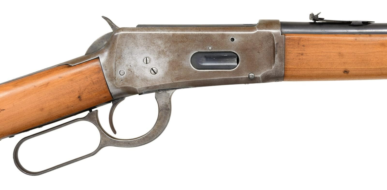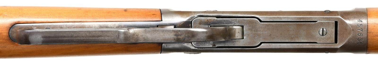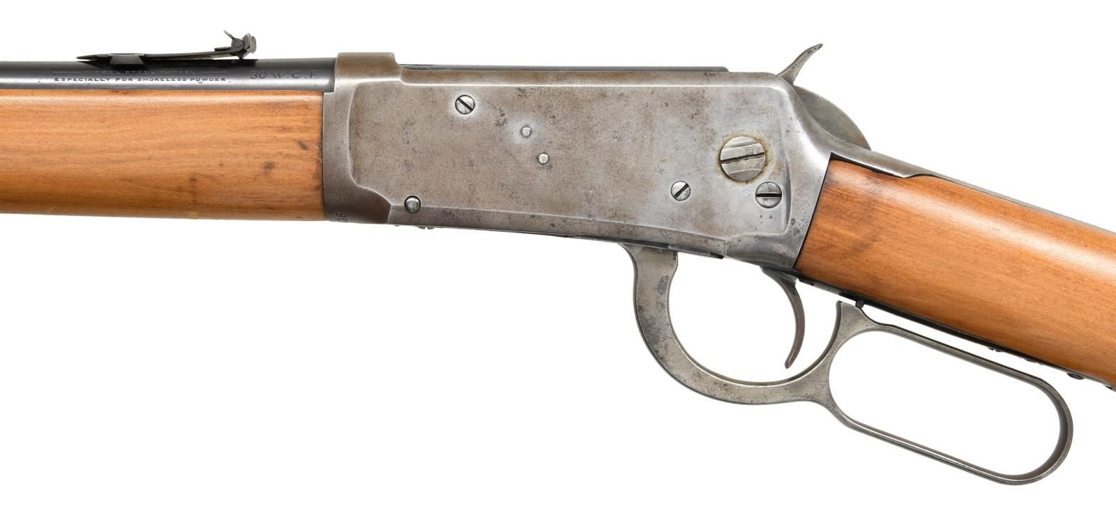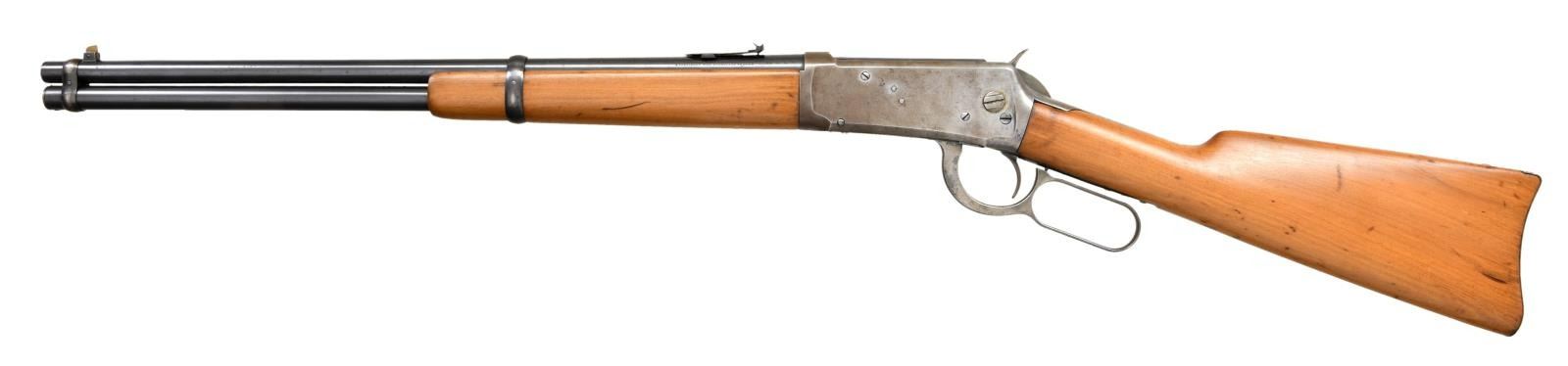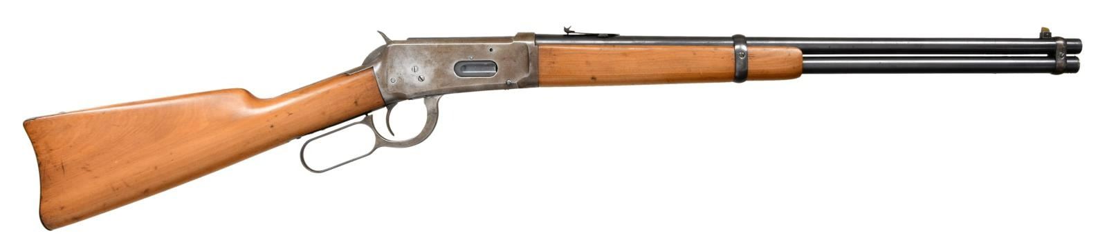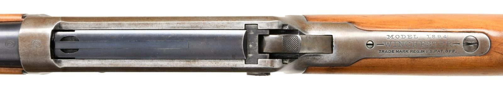 RING CARBINE. Cal. 30-30. S# 457636. Bbl 20". Model 94 saddle ring carbine manufactured by Winchester in 1908. Standard markings on left side of barrel stipulating manufacturer information and caliber designation. Blued finish, with smooth wood buttstock and forend that have been sanded and revarnished at one time. Buttplate has been refinished. Brass blade front sight with 3 position flip up V-notch rear sight graduated from 50-200 yards. CONDITION: receiver and lever exhibit gray patina, with spots of darker discoloration overall. Barrel and barrel bands show some spots of mild wear that show through to gray patina, with areas of light surface oxidation and some small spots of pitting. Bore is bright, exhibiting pitting in the lands and strong rifling throughout. Stock and forend exhibit some scattered marks and minor impressions from storage and handling, but otherwise remain sturdy and serviceable. (23-2587/MLW). CURIO. $700-1,000.