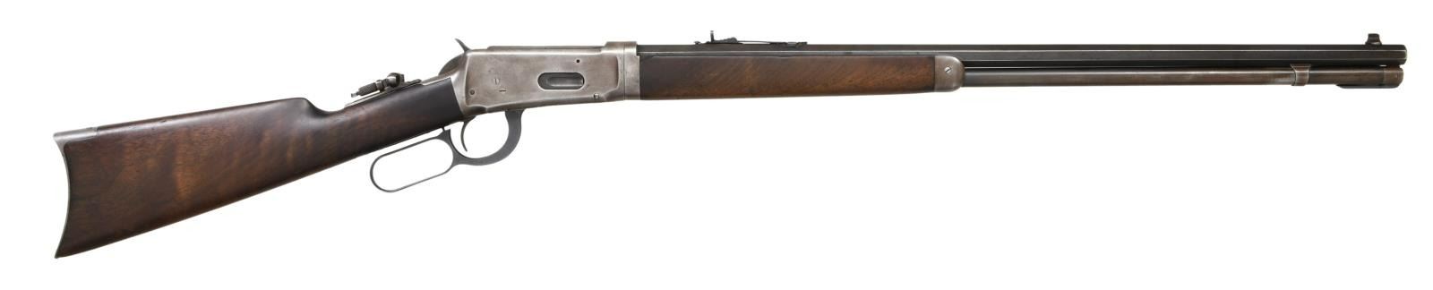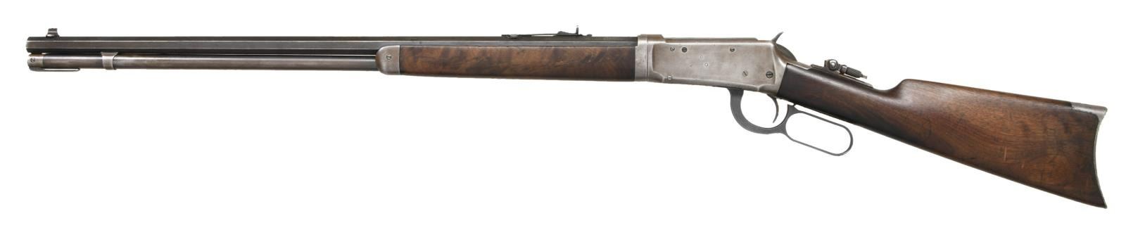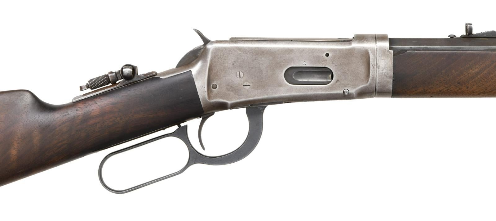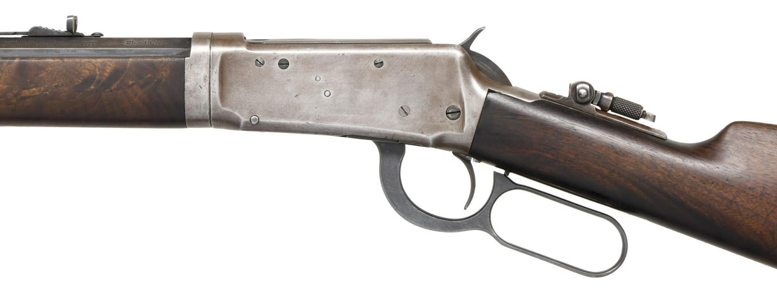 Cal. 25-35. S# 652895. Bbl 26". Model 1894 lever action takedown rifle manufactured by Winchester in 1913. The left side of the barrel is stamped with Winchester's 2 line address, with the caliber designation stamped at the breech. Brass beaded blade front sight with Marble's semi-buckhorn U-notch rear sight, and tang mounted aperture rear sight. Full length magazine tube. Plain wood straight grip buttstock with crescent buttplate, with a plain wood forend. Lever is a replacement. CONDITION: frame exhibits a gray patina overall, with some areas of striations from cleaning. Barrel and magazine tube exhibit wear and thinning to their original factory blue finish, that shows through to a pleasing brown patina. Bright bore, exhibiting mild pitting in the grooves and retaining strong rifling throughout. Wood furniture shows scattered marks and minor impressions from storage and handling, but otherwise remains sturdy and serviceable. Forend bears a small loss on the right rear corner. (23-3046/MLW). CURIO. $1,500-2,500.