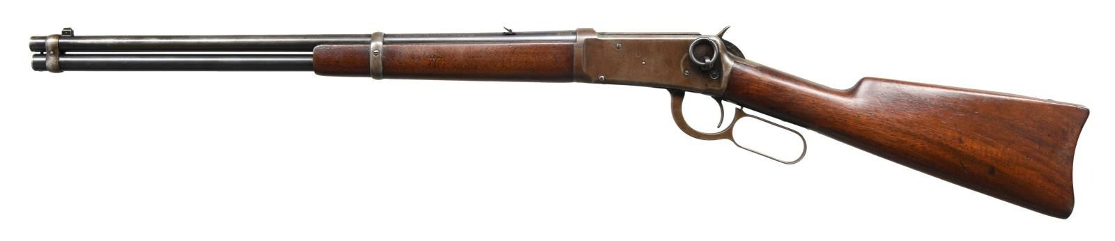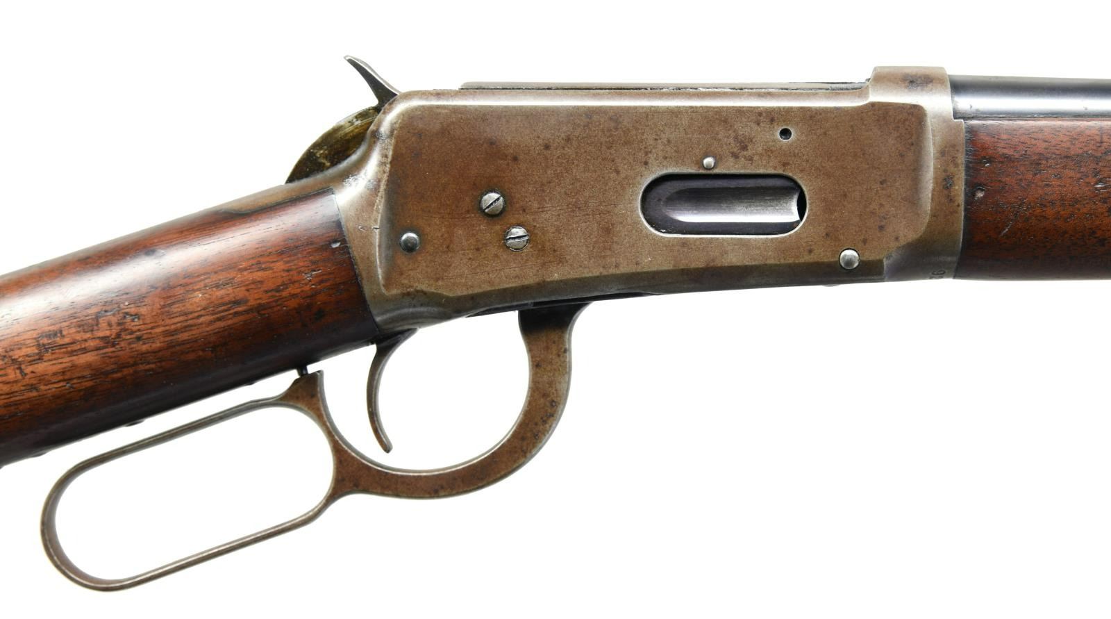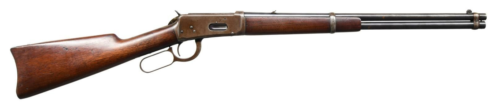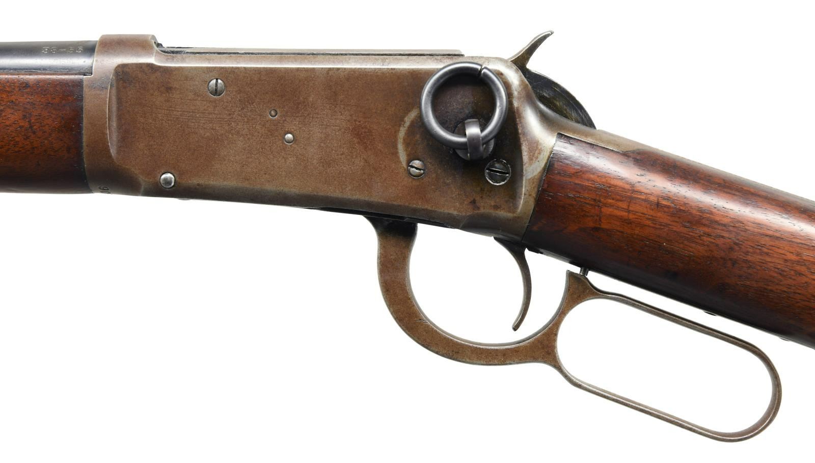 CARBINE. Cal. 38-55. S# 924406. Bbl 20". Model 1894 saddle ring carbine manufactured by Winchester in 1923. Standard markings with Winchester's 2 line address and the caliber designation on the left side of the barrel. Blued finish with plain wood straight grip buttstock and forend. Ivory beaded blade front sight with a dovetailed Lyman No. 6 rear sight that has had no sight groove cut into it. CONDITION: metal components retain fair amounts of their original blue finish, exhibiting wear and thinning overall that show through to gray and brown patinas and some mild surface oxidation. Bright bore, exhibiting some light pitting and strong rifling throughout. Stock and handguard exhibit some scattered marks and minor impressions from handling and storage, but otherwise remain sturdy and serviceable. (23-2295/MLW). CURIO. $1,000-1,500.