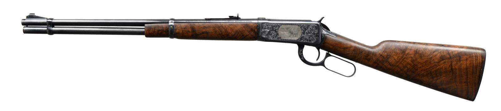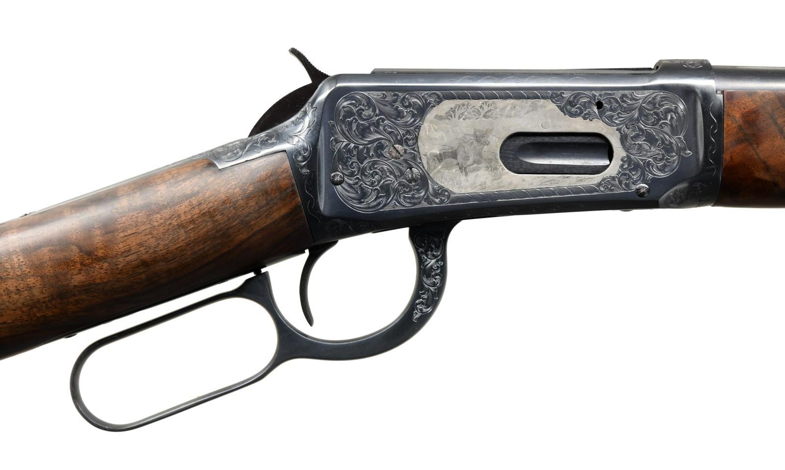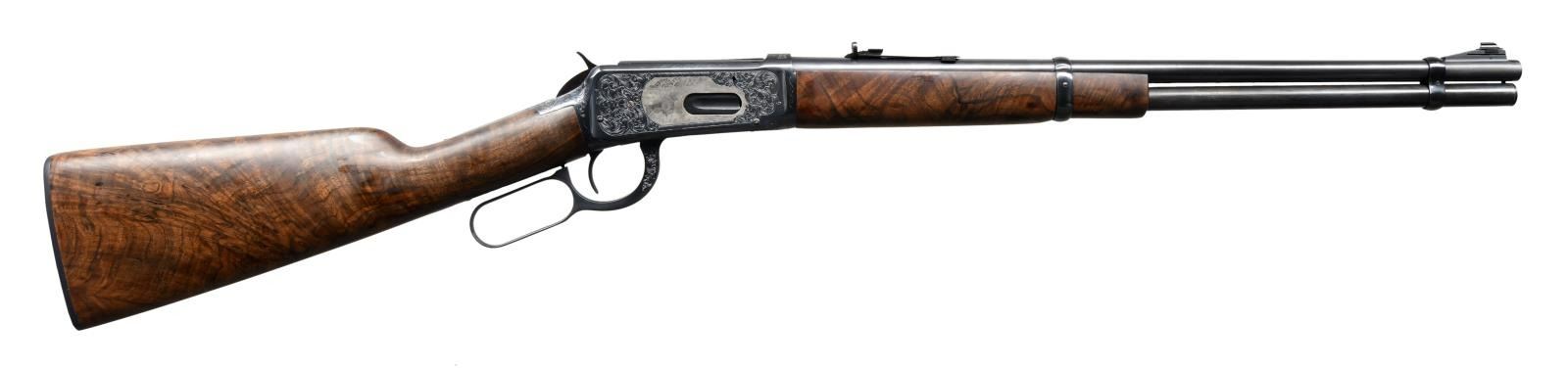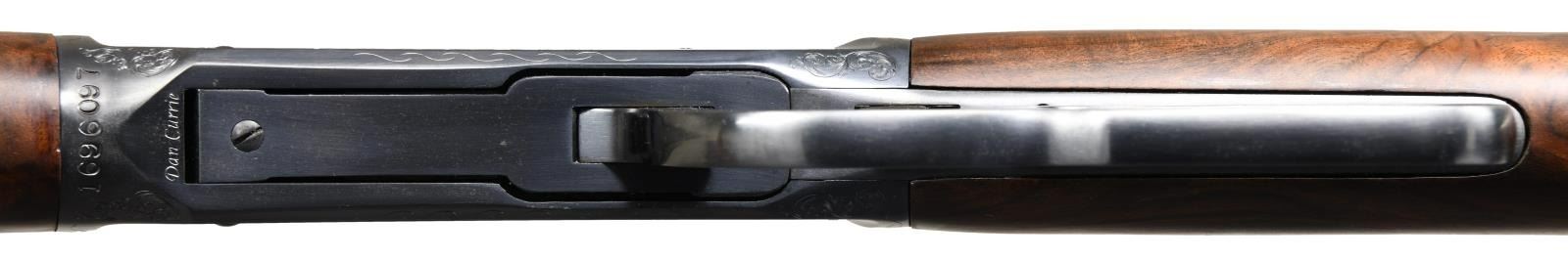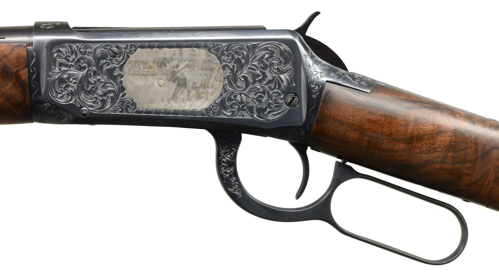 LEVER ACTION RIFLE. Cal. 30-30. S# 1696097. Bbl 20". Model 94 lever action rifle manufactured by Winchester in 1950 and later engraved by Dan Currie. Receiver features masterfully executed scroll engraving surrounding a highly detailed scene of 2 moose on the left, with ensuite engraving surrounding a scene of an elk on the right. Remainder of receiver exhibits light scrollwork and wavy line designs, with "Dan Currie" engraved on the underside below the serial number. Metal components exhibit a professionally reapplied blue finish, with beautiful contemporary feather crotch grain smooth straight grip buttstock and forend. Contemporary flat Winchester checkered black plastic buttplate. Blade front sight with stippled ramp and U-notch rear sight. CONDITION: excellent, with metal components retaining bountiful amounts of their professionally reapplied blue finish, exhibiting some wear and thinning mainly concentrated on the magazine tube, as well as some areas of light pitting and freckling overall. Mirror bore, exhibiting well defined rifling throughout. Wood furniture shows few minor superficial marks from handling and storage. PROVENANCE: From the personal collection of Brad Shepherd. (23-2114/MLW). CURIO. $2,500-4,000.