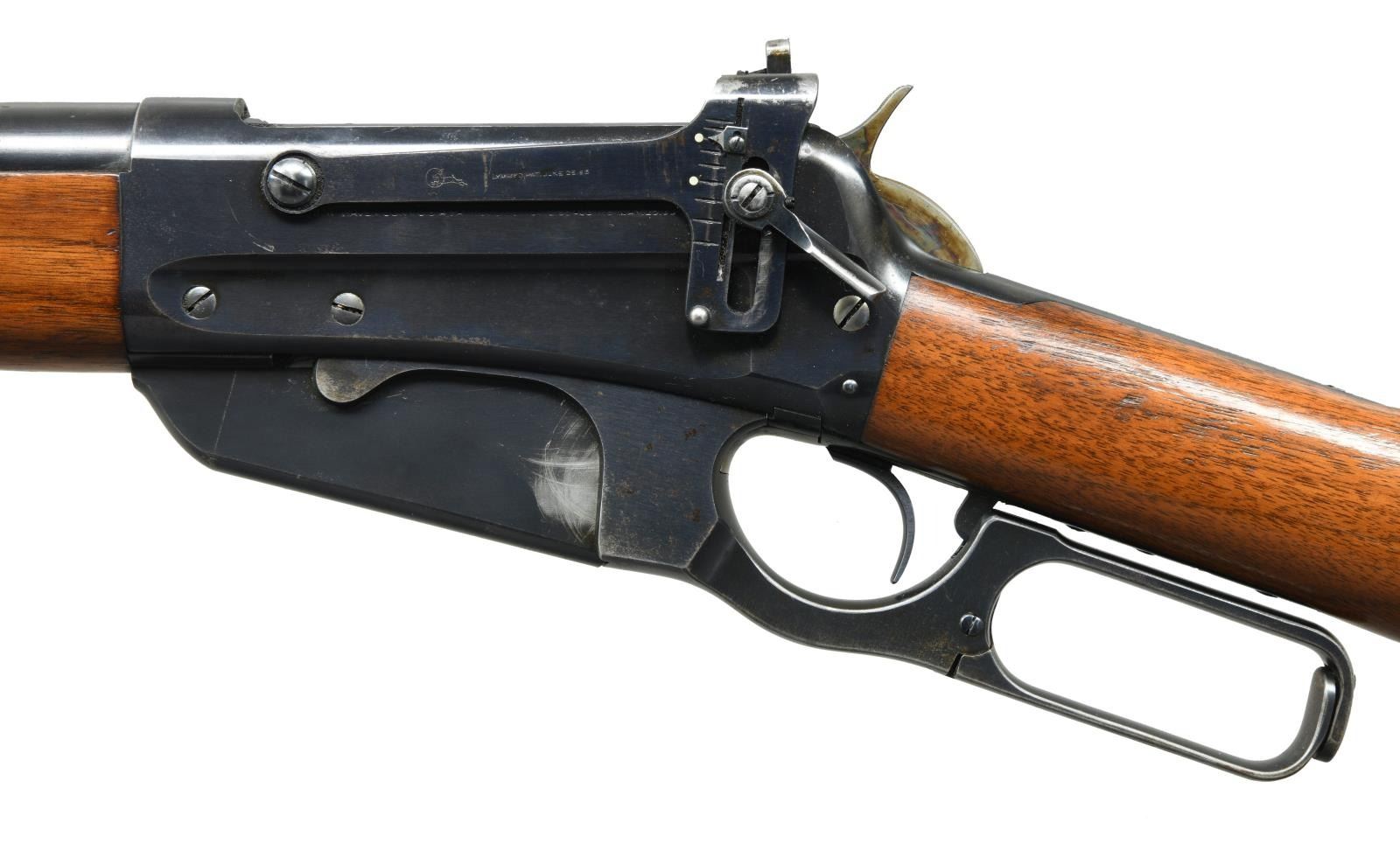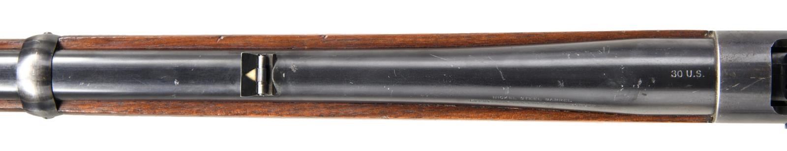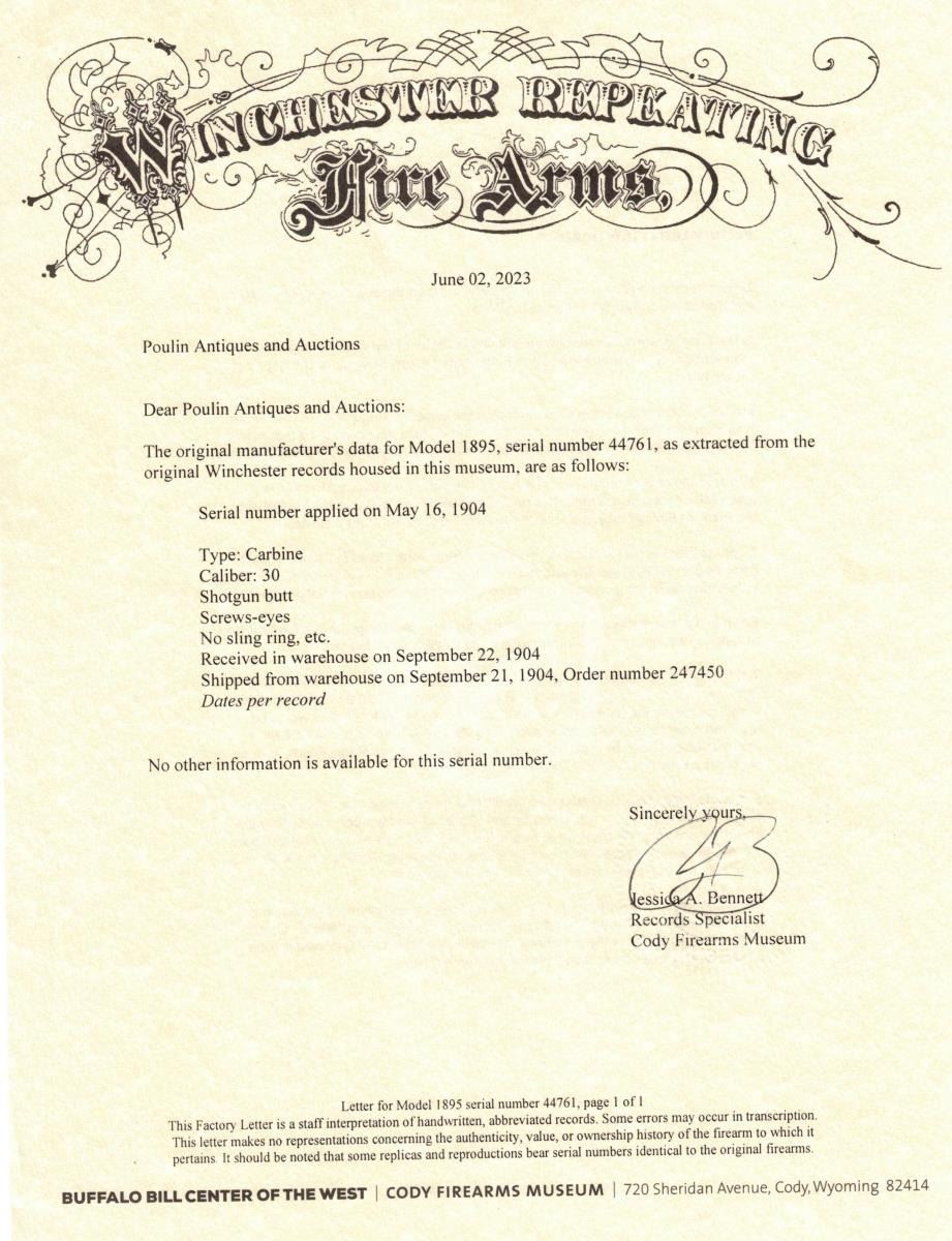 FEATURES. Cal. 30 US (30-40 Krag). S# 44761. Bbl. 22" with pinned blade front, Lyman no.6 rear with single flat top leaf rear and "Climin Lyman" no. 20 receiver sight. Blue finish with case colored hammer. Band fastened finger groove forend and straight grip walnut stock with steel shotgun buttplate and eyes for the Winchester sling. UNATTACHED ACCESSORIES: Cody Firearms Museum letter detailing the following information, "Type: Carbine. Caliber: 30. Shotgun butt. Screws-eyes. No sling ring, etc. Received in warehouse on September 22, 1904. Shipped from warehouse on September 21, 1904, Order number 247450.". CONDITION: Barrel retains over 95% bright blue showing small marks. Receiver has over 80% blue showing edge & carry wear with scratches & fine spots of freckling. Hammer shows bright colors on sides. Lightly worn wood finish has scratches, marks & small dents. Bright bore retrains sharp rifling. PROVENANCE: From the Estate of Jon Thomas. (23-1653/DS). CURIO. $3,500-5,500.