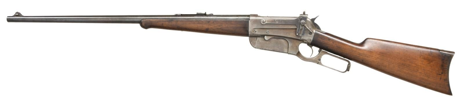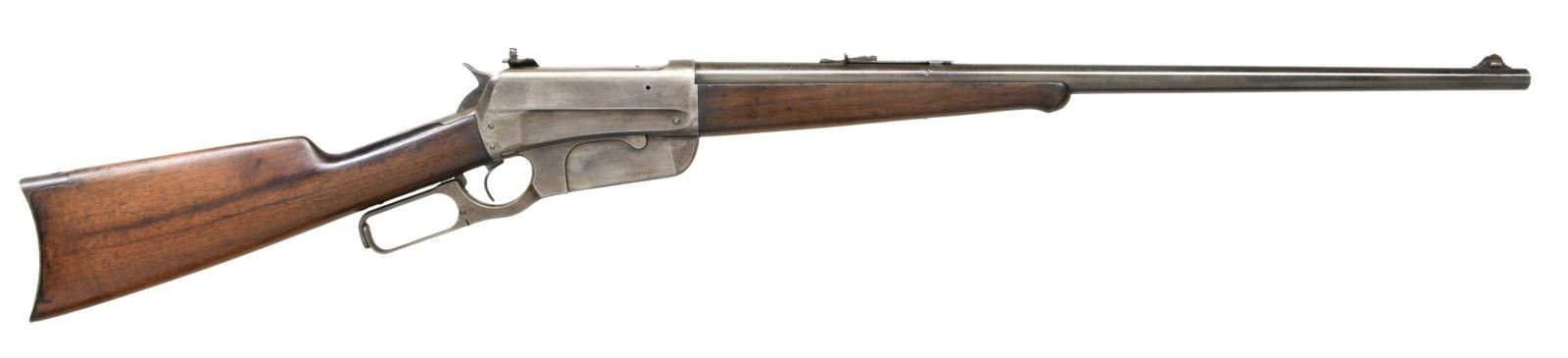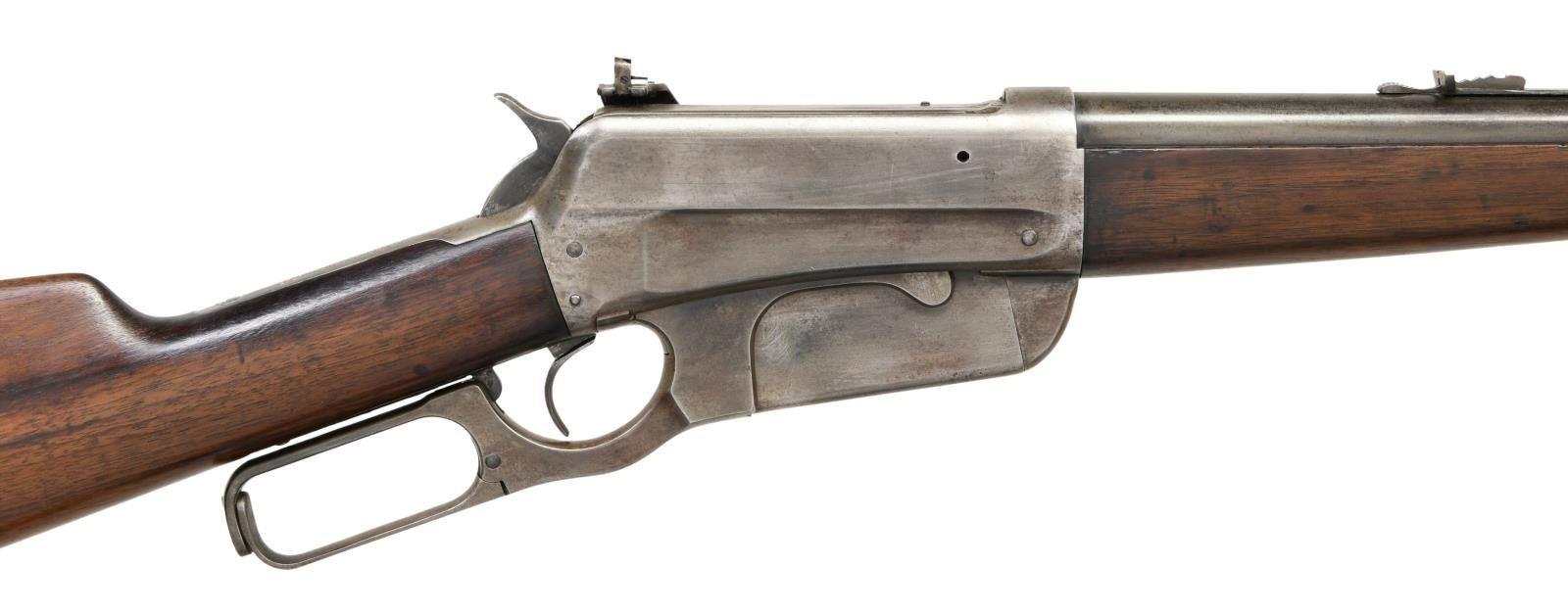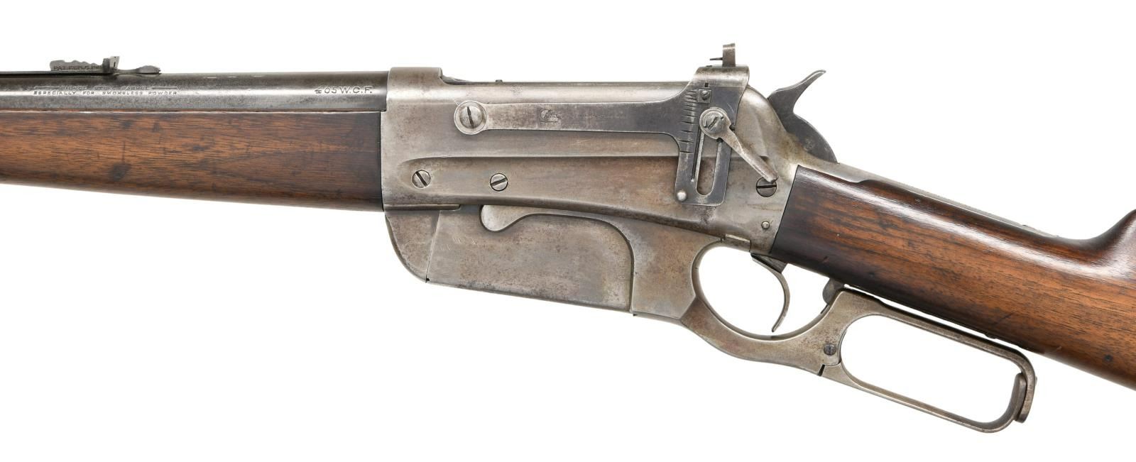 Cal. 405 WCF. S# 20238. Bbl. 24" tapered round. Ramp mounted Lyman No. 4 hunting rear sight w/ bead missing, flat top sporting rear sight & "Climbin Lyman" No. 21 receiver sight. Ebony tipped schnable forearm w/ straight grip walnut stock w/ crescent steel buttplate. Mfg. 1899. CONDITION: metal has a faded gray appearance showing scattered very light pitting. Refinished wood shows scattered scratches & marks. Left side of forearm has a repaired chip near the tip. Dark lightly pitted bore retains intact rifling. (23-2542/DS). CURIO. $1500-2250.