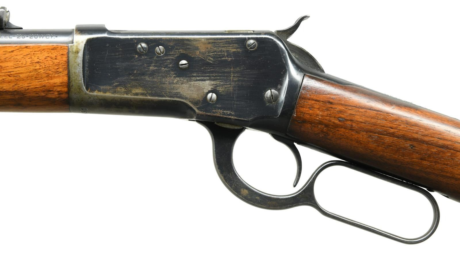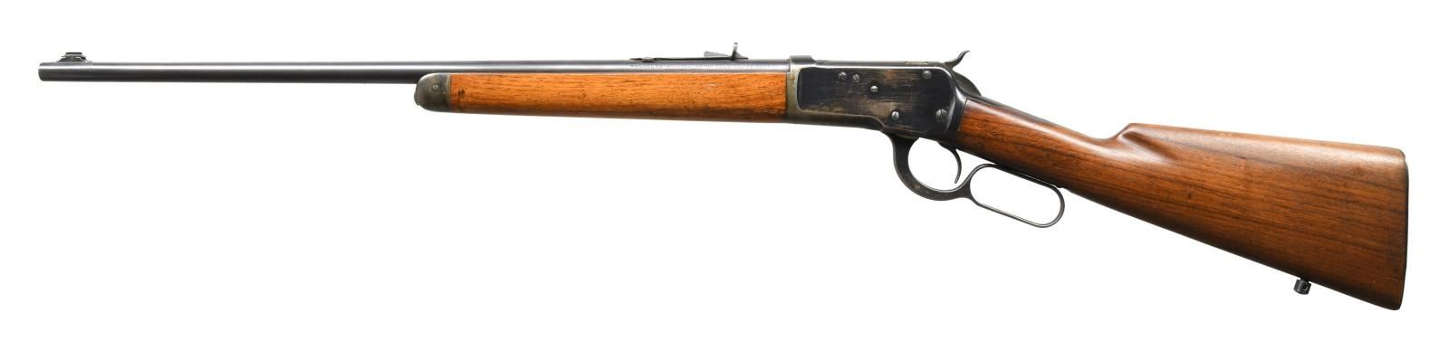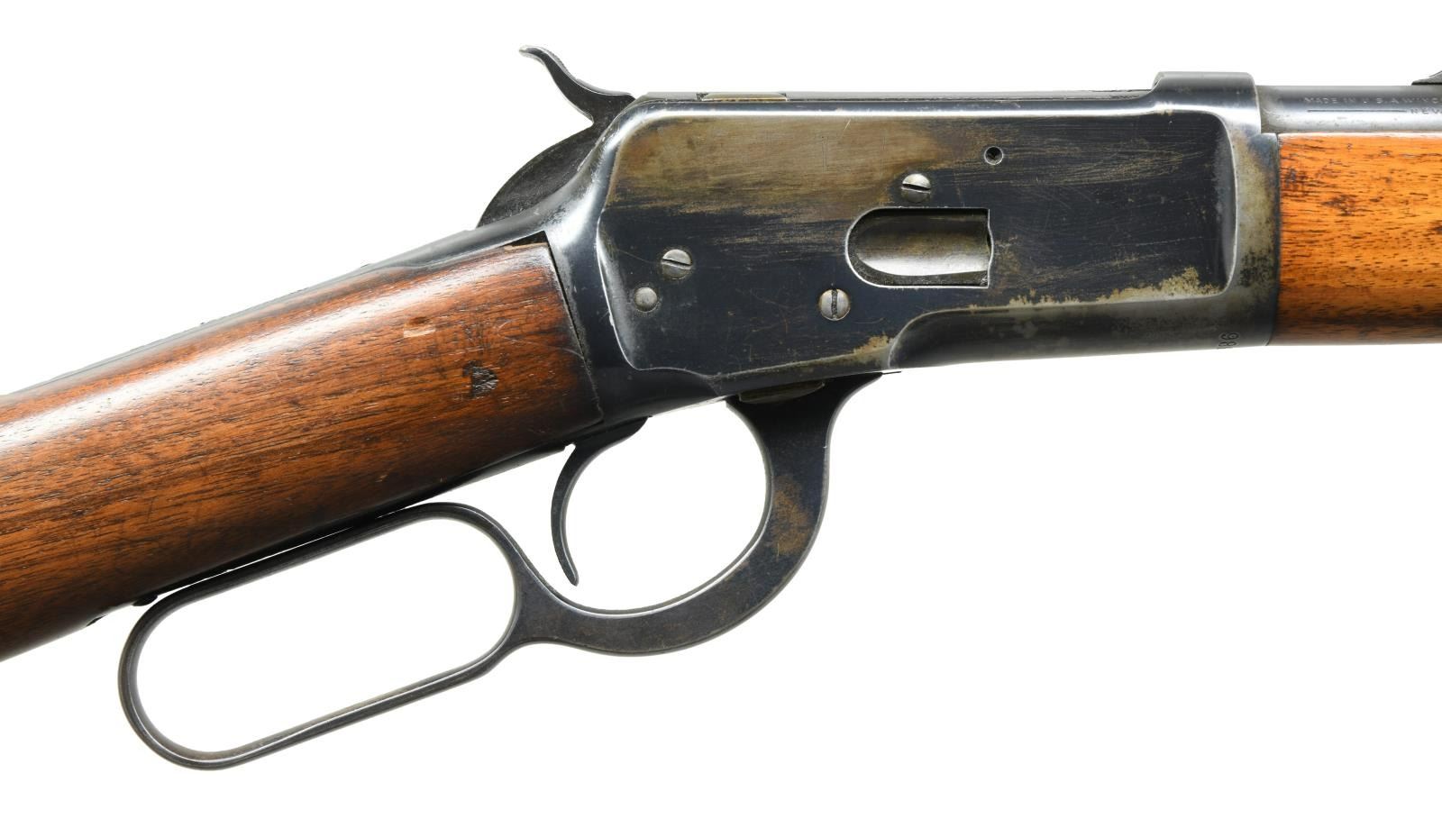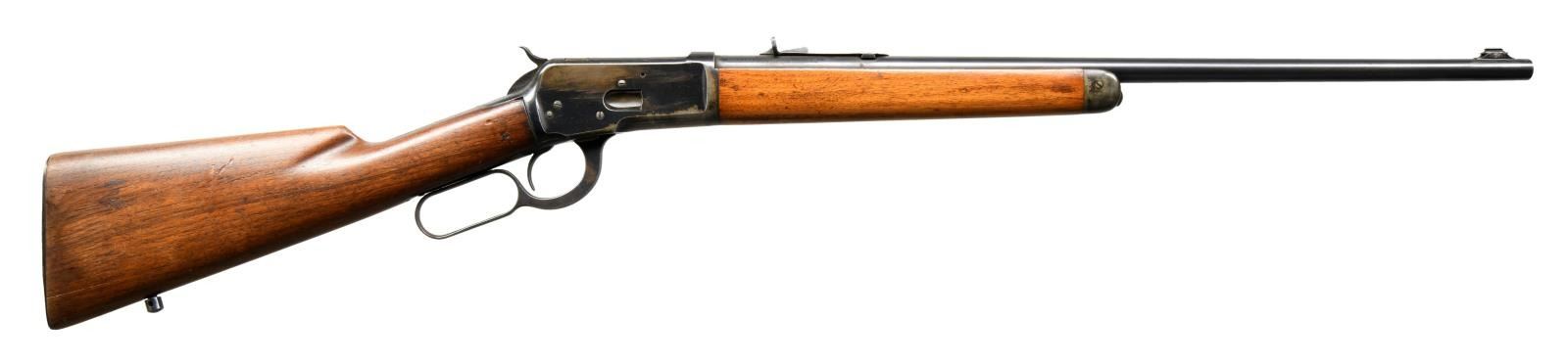 Cal. 25-20. S# 986491. Bbl. 22" round. Ramp mounted replacement bead front sight w/ original sporting rear sight. Button mag. Blue finish. Walnut forearm & straight grip stock w/ grooved steel buttplate. Toeline of stock has added sling swivel stud. Mfg. 1947. CONDITION: bbl. retains 90% lightly faded blue. Action shows 60% blue w/ areas of flaking & wear. Forearm has original finish showing scattered scratches & marks. Sanded stock has a dull refinish showing handling marks w/ a crack extending from above the toeline. A small crack & chip right of the top tang. Bore is bright w/ strong rifling. Left side of receiver and top tang has added holes for sight installation. (23-2535/DS). CURIO. $2000-2750.