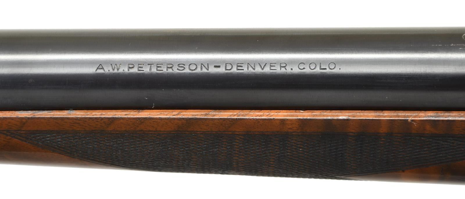 SCHUETZEN RIFLE. Cal. 32-40. S# 18203. Bbl. 28" custom measuring 1" across the muzzle. Left side of bbl. is marked "A. W. PETERSON-DENVER, COLO". Axel W. Peterson was a Swedish-born gunsmith. In 1903 he formed a partnership w/ George Schoyen in Denver. After Schoyen passed in 1916, Peterson continued making the accurate rifles he was famous for until his death at age 86 in 1946. Wind-Gauge globe front sight w/ mid range Vernier tang sight. Bbl. has 4 open holes for scope block attachment. Case colored Highwall action w/ single set trigger. Ebony tipped schnable forearm & hard rubber capped pistol grip stock of XXX walnut. Features include factory checkering & nickel finished Schuetzen buttplate. Left inside of lower tang is marked w/ assembly number "1181" followed by wood grade marking "XXX" & "SBC". Back of stock is marked w/ number "2901". Mfg. 1887. CONDITION: bbl. retains over 95% blue showing small marks. Action has 80% lightly visible case colors. Wood finish shows scattered scratches & marks. Bore retains strong rifling. Properly functioning set trigger. PROVENANCE STATEMENT: From the Harold Prucha Collection". (01-23271/DS). ANTIQUE. $3500-5000.