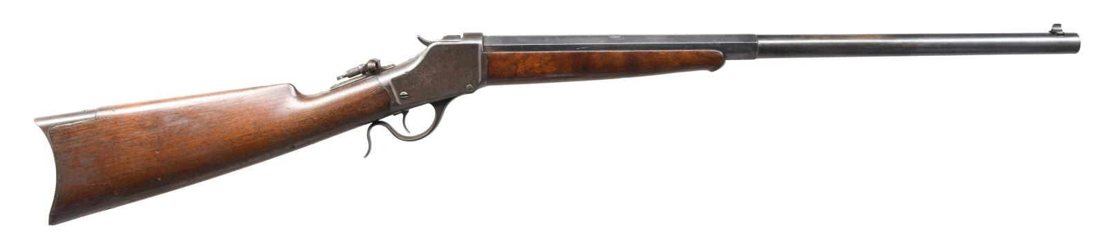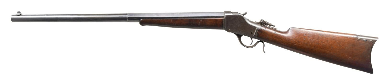 Cal. 32-40. S# 10583. Bbl 24". Model 1885 High Wall single shot rifle manufactured by Winchester in 1887. Heavy barrel features a faceted section measuring 10 3/8" long from the breech, terminating in smooth round configuration. Top flat is stamped with Winchester's 2 line address, with the caliber designation at the breech. Ivory beaded blade front sight with tang mounted aperture rear sight. Barrel has been drilled and tapped twice, once at the breech, and once over the address. Dovetailed rear sight is not present. Receiver and lever exhibit a gray patina, with the barrel exhibiting a blued finish. Smooth wood straight grip buttstock, with a smooth schnabel tip forend, featuring an ebony insert at the tip. CONDITION: receiver and lever exhibit a dark mottled gray patina, with light pitting overall. Barrel retains the majority of its original factory blue finish, exhibiting some areas of wear and thinning that show through to a pleasant brown patina. Very bright bore, exhibiting some light pitting and strong rifling throughout. Wood furniture exhibits scattered marks and minor impressions from storage and handling, but is otherwise good. Buttstock, exhibits a couple of light cracks at the upper tang and is loosely fit. (01-24114/MLW). ANTIQUE. $500-1,000.