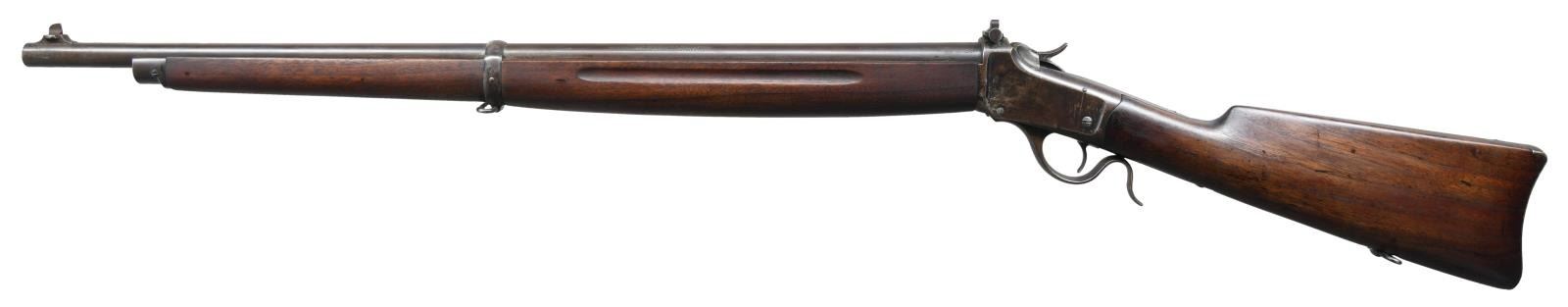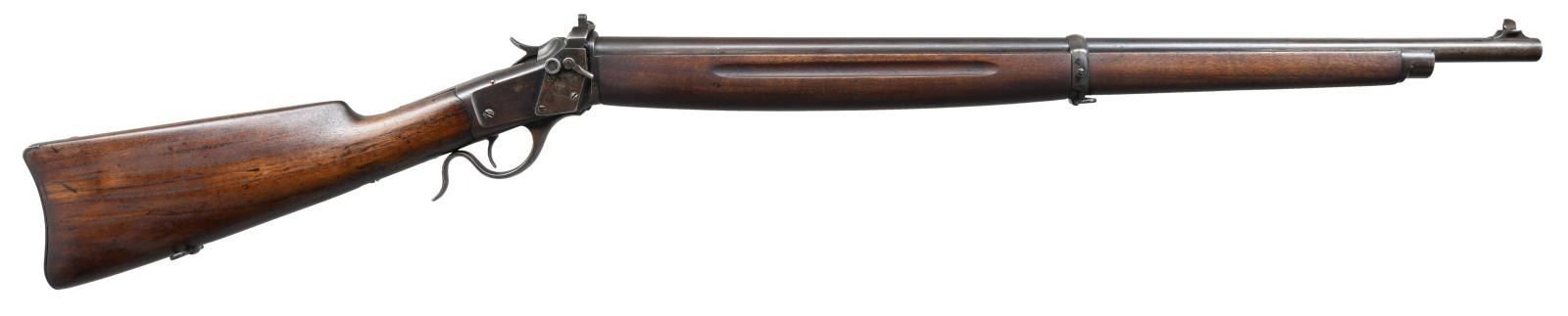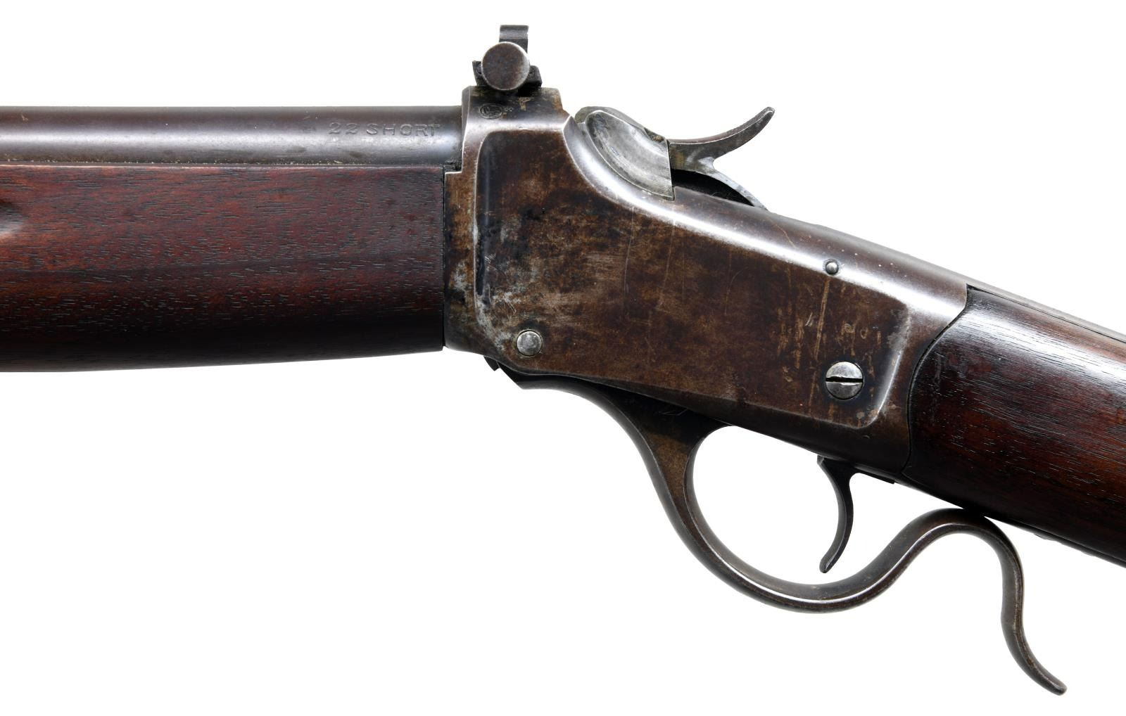 Cal. 22 Short. S# 122115. Bbl. 28". Blade front sight that appears to be missing its screw. Receiver mounted Lyman aperture rear sight. Straight grip walnut butt stock & forend w/ grasping grooves. Bottom mounted sling swivels. CONDITION: stock set appears cleaned w/ a small square repair on right side of butt, some light chipping around both tangs, scattered handling wear. Metal is mostly a gray patina w/ a few dings, scattered traces of blue & oxidation. Shiny bore w/ some scattered moderate pitting. (23-2014/MJC). CURIO. $600-900.