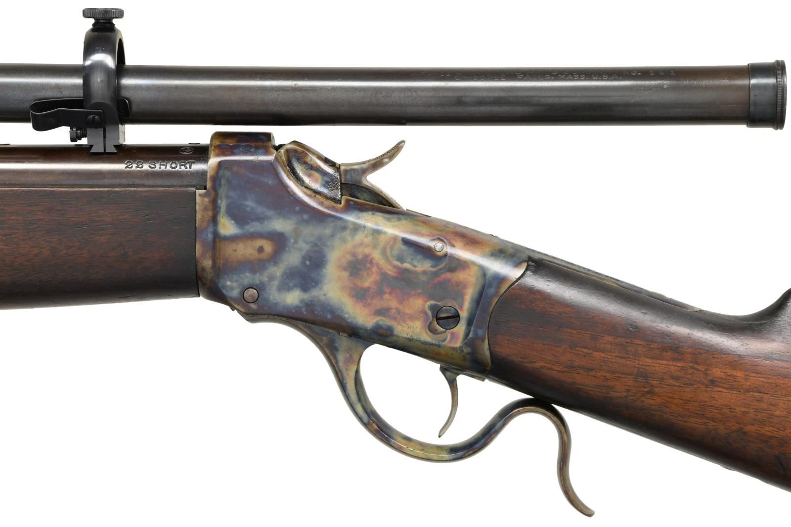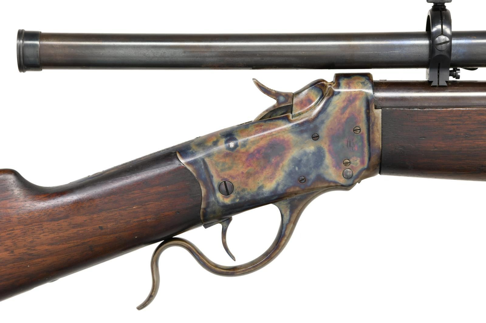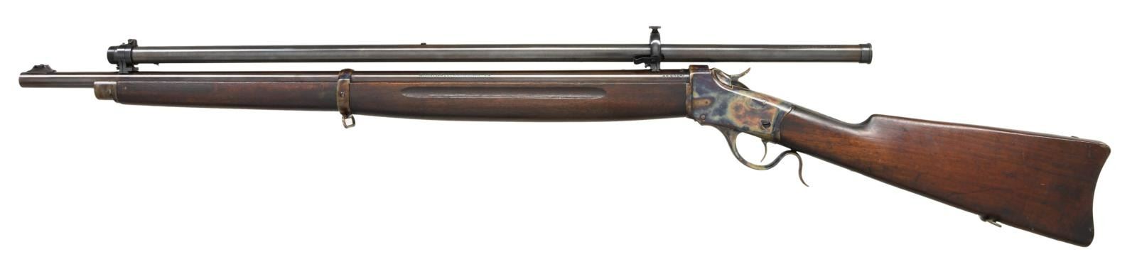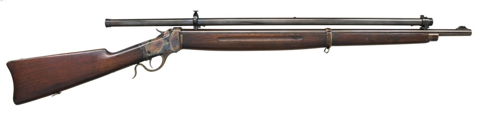 Cal. 22 SHORT (RF). S# 125919. Bbl. 28" w/ slot blank in factory raised base at front plus plug screws in place of Krag 1901 rear sight. Added bbl. dovetails for installed Lyman Stevens No. 141 target scope. Conceived by Col. C. B. Winder for military training using sm. rimfire rifles similar to issue centerfire rifles for easy, economical training that could be done indoors. Three variations of Model 1885's were used; High Wall & Low Wall actions. Third model mfg. Jan. 1918-June1920; listed by Winchester as Model 87 being High Wall altered to Low Wall shape for easier loading (per military request). Most 3rd variants had Lyman 53 receiver sights mounted on right side. Unique to 3rd variation is cross screw retention of rear bbl. band designed by Edwin Pugsley for expedient production (feature of this rifle). Also, perch belly shape to forend w/ single finger groove per side. Second variations were coil spring actioned High Walls w/ "A" at rear of lower tang as on this rifle. Correct serial range of 121,800 to 139,700 of 3rd variant also having lg. bbl. shank diameter of .935" (Low Wall was .835"). Marked on top tang behind hammer w/ "U. S." plus flaming bomb proof. Rifles were made up from large supply of parts on hand (when Army adopted Model 1922 bolt action replacement training rifle) from 1920 until 1923 when Winchester sold all remaining 1885 parts to Sedgley. Unusual variant incorporating Type 2 bbl. w/ other parts being Type 3. Nose cap, bbl. band w/ swivel, rear swivel set, buttplate plus all of action are wonderfully case colored (post production). Foregoing info from Bert Hartman research. CONDITION: very well presented package having very good original bbl. finish. Stock set has original appearing finish along w/ numerous light handling marks. Good bore w/ wear & light frosting (both even throughout bore). Restored scope set having very good exterior & clear optics. Light inclusions at outer perimeter of view; sharp, clear cross wire reticle. PROVENANCE: The Collection of Gun Sport Ltd. owned by Jon R. Thomas. (23-3442/NW). CURIO. $1,000-1,500.