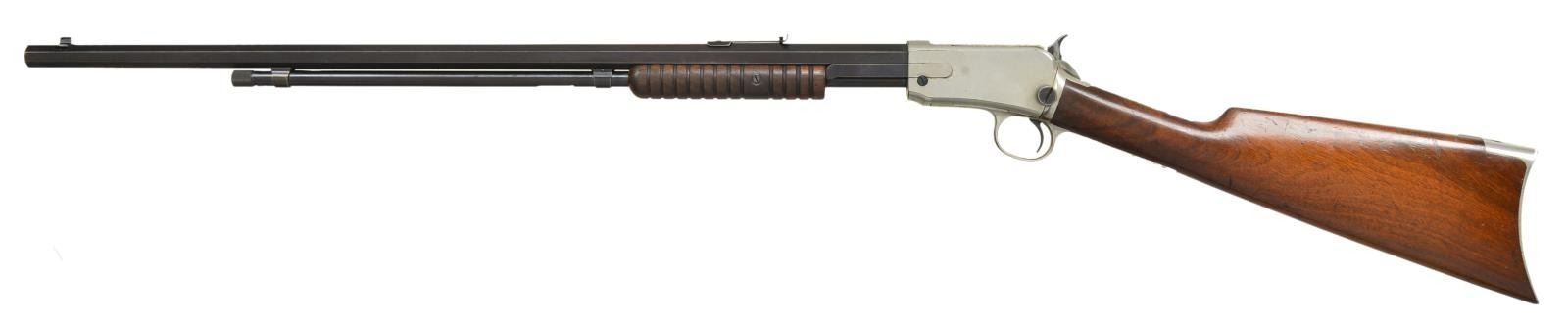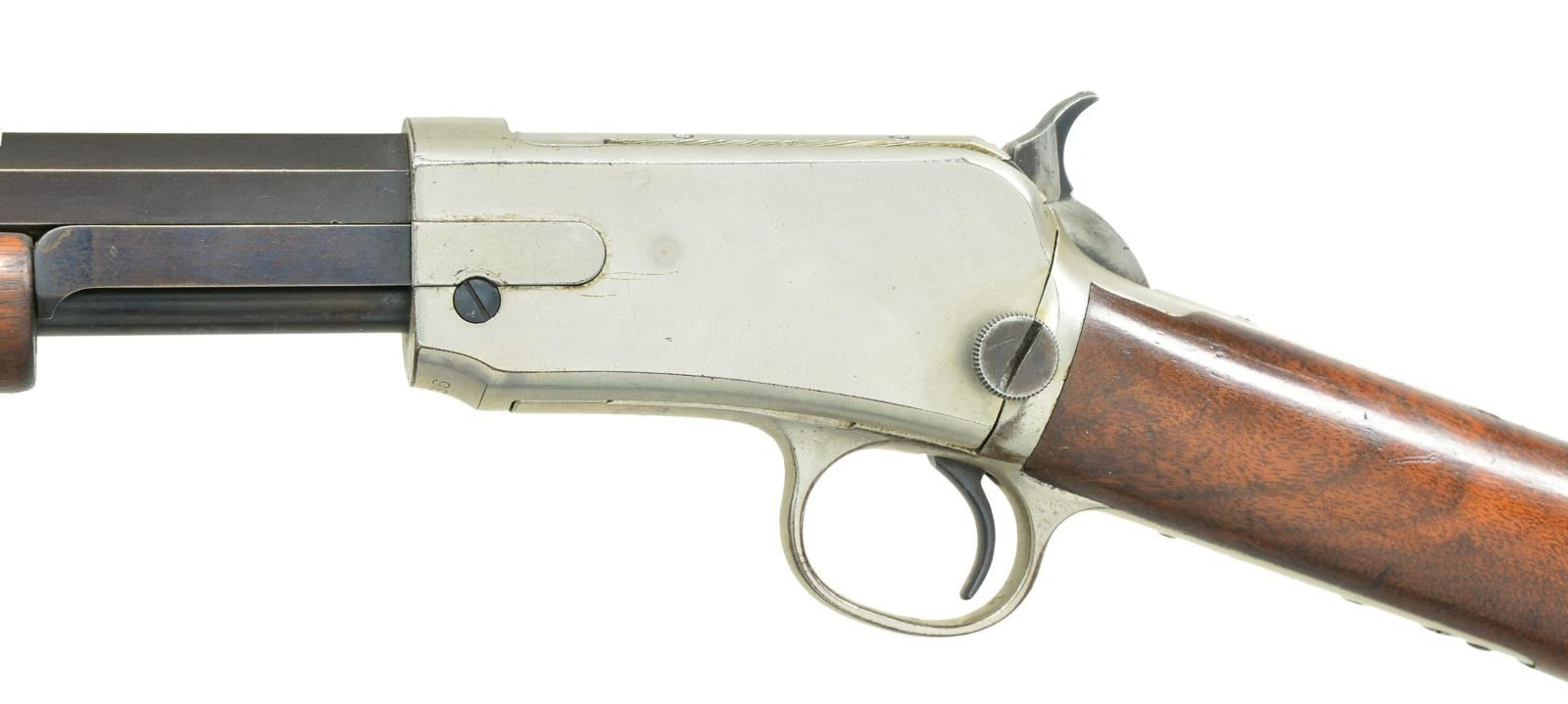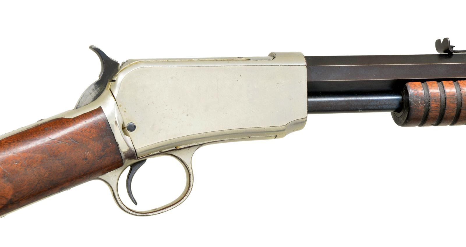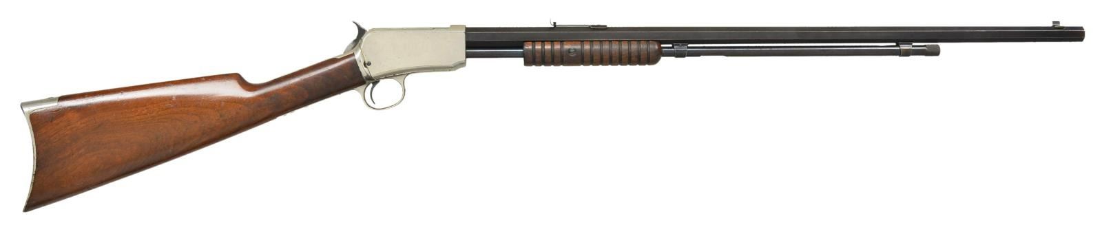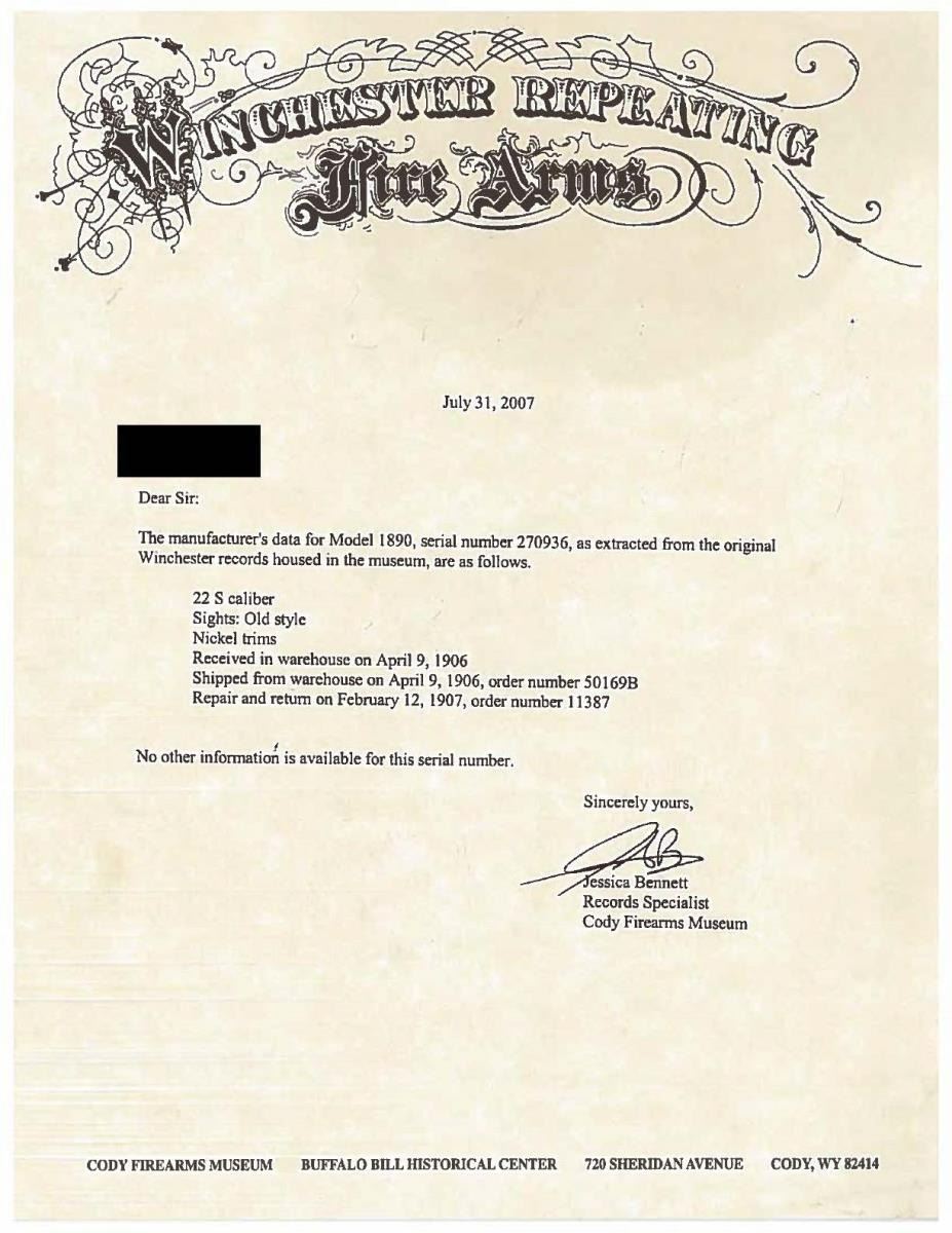 WITH FACTORY LETTER. Cal. 22 Short. S# 270936. Bbl. 24" with M1890 sporting sights. Action and buttplate have nickel finish. Bbl. & mag tube are blued. Very late 2nd model with mortised breech block. Grooved forend & straight grip walnut stock. UNATTACHED ACCESSORIES: Cody firearms Museum letter stating the following; "22 S caliber / Sights: Old Style / Nickel trim / Received in warehouse on April 9, 1906 / Shipped from warehouse on April 9, 1906, order number 270936 / Repair & return on February 12, 1907". CONDITION: action retains over 90% nickel. Buttplate has much of the nickel finish showing scattered spots of loss. Original bbl. & mag. tube blue shows wear and fading to brown. Original wood finish shows light wear and scattered handling marks. Lightly pitted bore has largely intact rifling. (22-1865/DS). CURIO. $2,500-3,500.