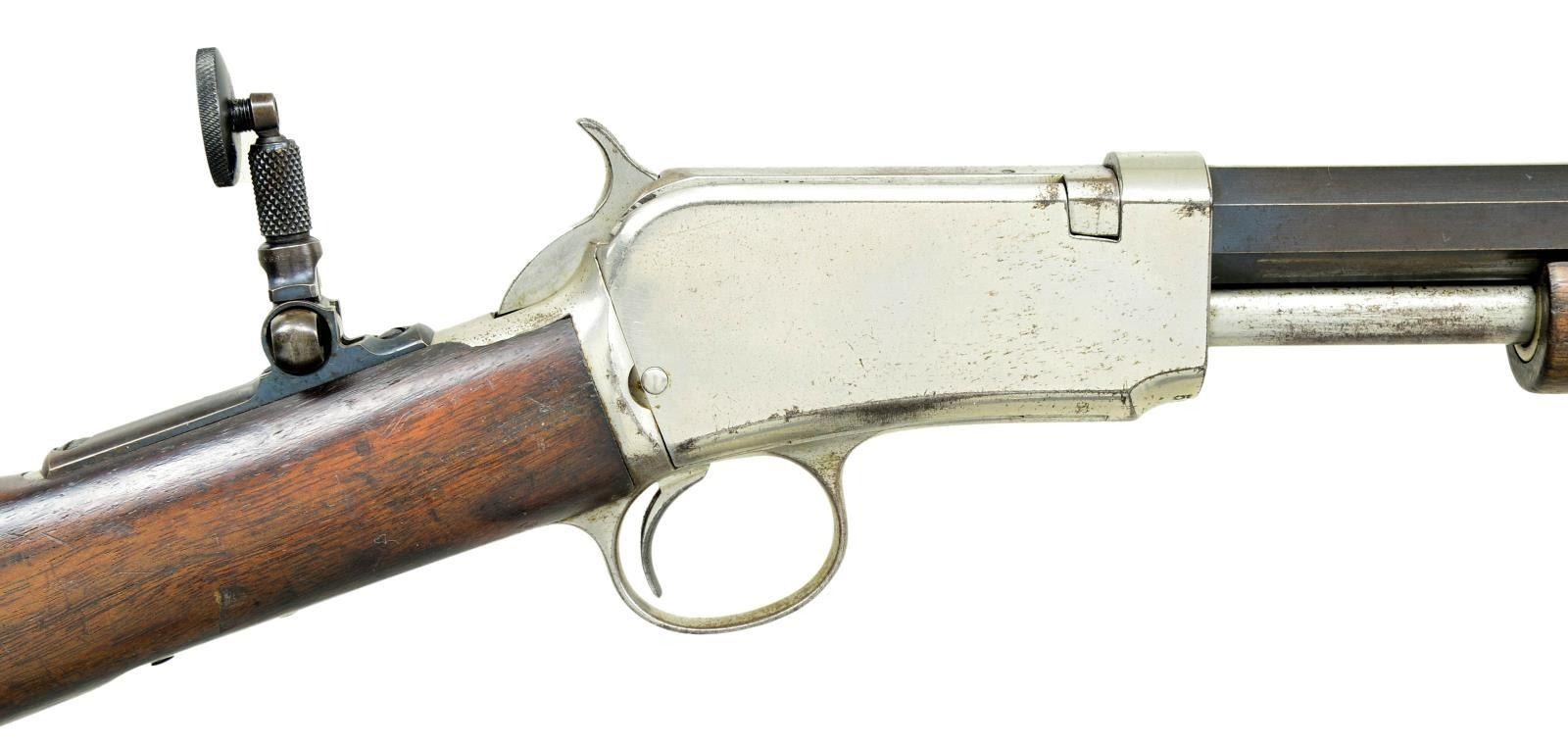 Cal. 22 Short. S# 567448A. Bbl. 24" octagon. Combination tang sight, M90 sporting rear & replacement globe front sights. Rare rifle with entirely nickel finished action, mag. tube, rear sight & crescent buttplate. Only the bbl. is blued. Grooved forend & straight grip walnut stock. "Winchester For Over a Century, Volume 1" page IV-7 by Bill West states "Nickel plated rifles with tang sights were used by exhibition shooters. Called "Expert" rifles". Mfg. 1916. CONDITION: Action, buttplate & rear sight retrain over 80% nickel. Mag. tube & mag. bands show some nickel w/ main portion of fading to gray. Bbl. blue has a lightly faded appearance with an area of pitting on top & right flats. Original wood finish shows wear, age related darkening scratches & marks. Lightly pitted bore retains intact rifling. (22-1856/DS). CURIO. $2,500-3,500.