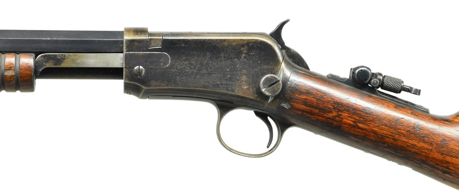 Cal. 22 LR. S# 687713A. Bbl. 24" octagon w/ M90 sporting sights & combination tang sight. Grooved forend & straight grip walnut stock w/ crescent steel buttplate. Mfg. 1927. CONDITION: 80% dull lightly worn blue w/ areas fading to brown showing spots of wear on action. Wood has worn original finish w/ dark spots, scratches & marks. Bore is bright w/ strong rifling. (22-1875/DS). CURIO. $1,500-2,500.