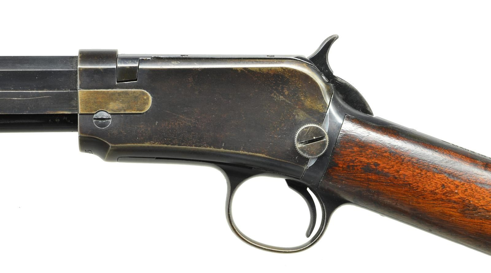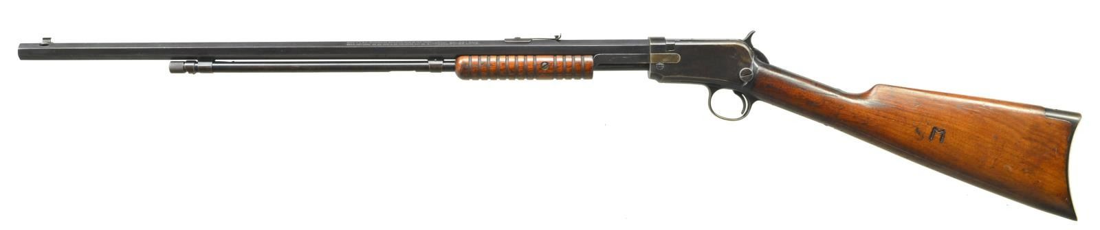 Cal. 22 Long. S# 777545. Bbl. 24" octagon w/ model 90 sporting sights. Grooved forend & straight grip walnut stock w/ crescent steel buttplate. Left side of stock has carved initial "M". Late production rifle mfg. 1933 or later. CONDITION: 80% lightly worn blue fading to brown in some areas. Original wood finish shows wear & age darkening w/ scattered scratches & marks. Bore is bright w/ strong rifling. (22-1888/DS). CURIO. $900-1,400.