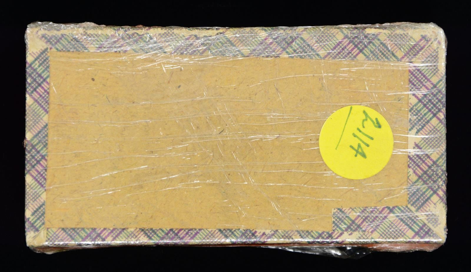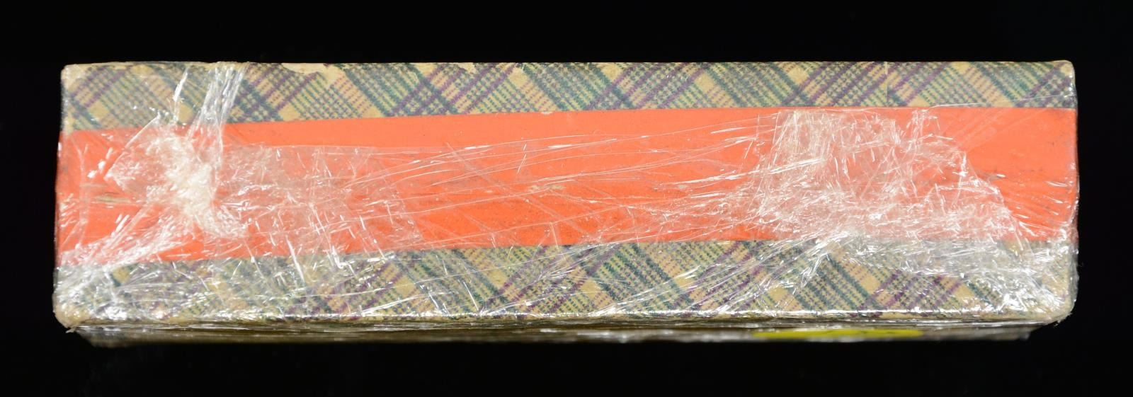BLUE LABEL BOX. 50 round box of ammo for "BREECH-LOADING DERRINGERS". blue label with green & black checked sides. Sealed with unbroken orange tape. Doug Eberhart states only around 12 boxes of this are known. This box being one of the best. CONDITION: near excellent. Blue label is bright without fading or wear. PROVENANCE: L.D. Eberhart Collection. (02-20882/DS). NON GUN. $1500-2500.