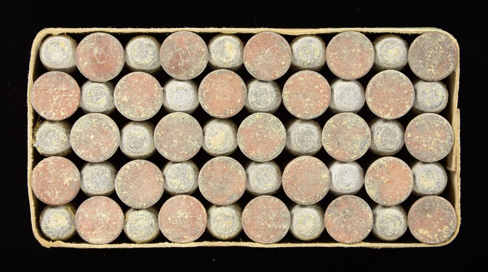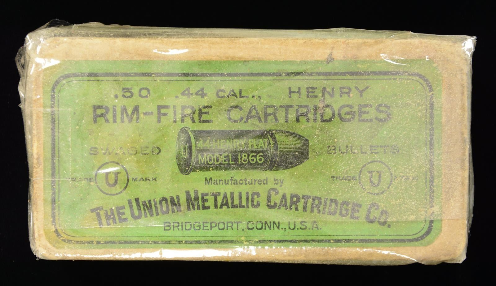 CARTRIDGES. Full box containing 50 rounds of original Union Metallic Cartridge Co. .44 Henry flat nose rimfire ammunition. Proper tan colored 2 piece cardboard box with green lid label and side labels. Top label is marked "50, 44 CAL, HENRY RIM-FIRE CARTRIDGES SWAGED BULLETS. THE UNION METALLIC CARTRIDGE CO. BRIDGEPORT, CONN., U.S.A.", also marked with 2 encircled "U" trademarks. Proper "U" headstamps on ammunition. CONDITION: box shows usual spots of discoloration from age, with some mild marks on the lid label. Top lid label retains a clear and easily legible graphic, with strong coloring overall. Side label is mostly present, with approximately 3/4 of the bottom section of the side label remaining. Ammunition shows age related corrosion overall. (02-20883/MLW). $2,000-3,000.