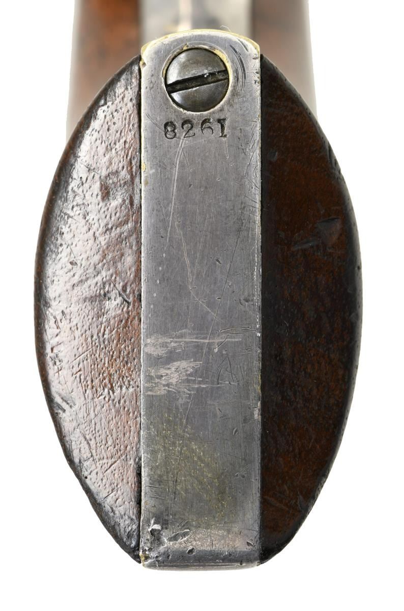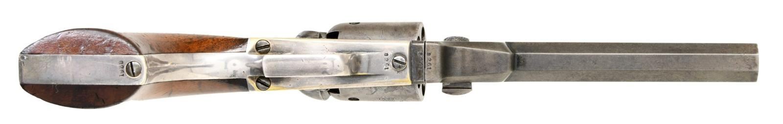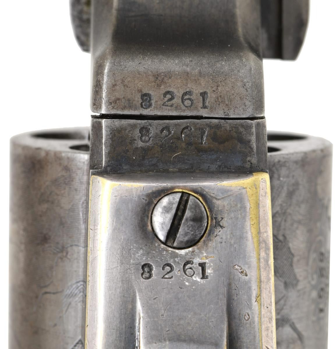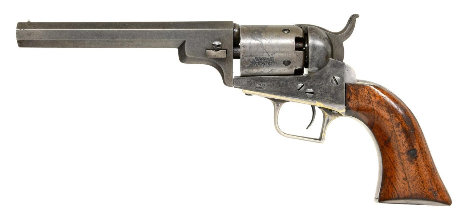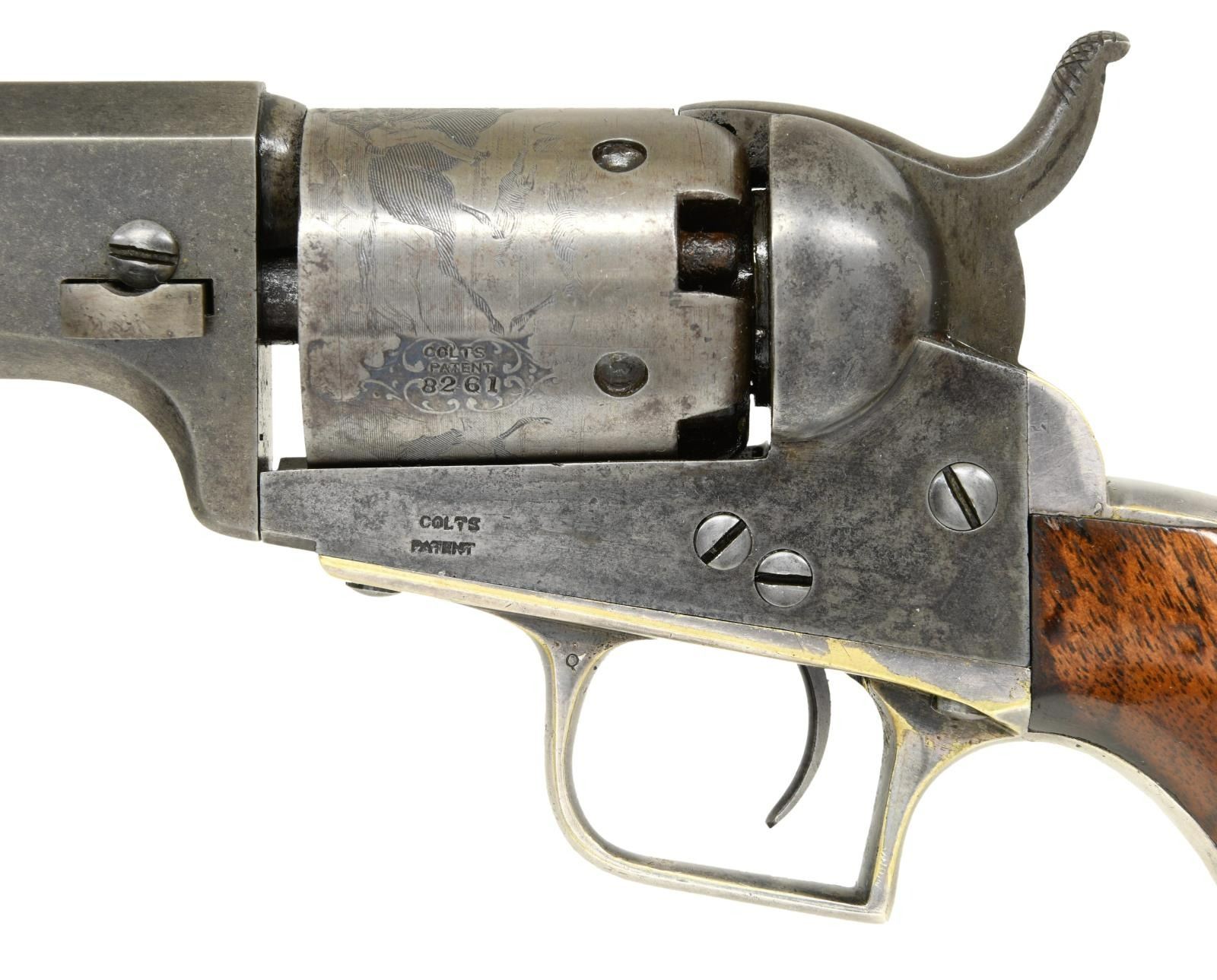 REVOLVER. Cal. 31. S# 8261. Standard configuration with desirable 6" octagonal barrel, correct for serial range "2-line New York City address with dashes", no provision for loading assembly, left side of frame has small "COLTS PATENT", silver plated square back brass trigger guard & backstrap, varnished walnut grips, 5-shot cylinder with rolled "Indian-Dragoon fight scene". CONDITION: very good-fine overall, all original & matching throughout. Metal has sharp crisp edges, crisp markings, small traces of blue on barrel, about half original varnish on grips, grip frame retains about 90% original silver plate, cylinder scene is crisp and all discernible. Mechanically fine, well-defined rifled bore. PROVENANCE: Little John's Auction 2002, Colt collection of Horst Kreiner. (01-23983/JS). $7,000-9,000.