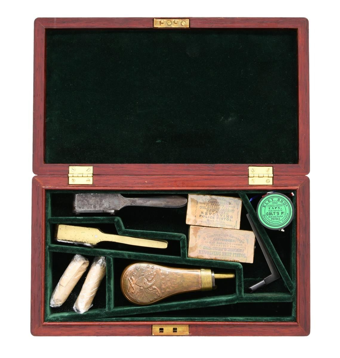 This lot consists of original pack of 6 "COL COLT PATENT REVOLVING BELT PISTOL" 36 caliber cartridges, rare original pack of 5 "COL COLT PATENT NEW MODEL REVOLVING POLICE PISTOL" 36 caliber cartridges for pocket navy or pocket police, original COLT PATENT brass 2-cavity "Pocket Navy" mold, original COLT PATENT iron 2-cavity navy mold Colt "L" shaped combination screwdriver/nipple wrench, 2 loose 58 caliber paper wrapped minié ball cartridges, double sided eagle flask, and functional key to the reproduction Colt 1862 pocket Navy casing everything is housed. CONDITION: very good overall. PROVENANCE: Collection of Horst Kreiner. (02-20905/JS). $1,000-2,000.