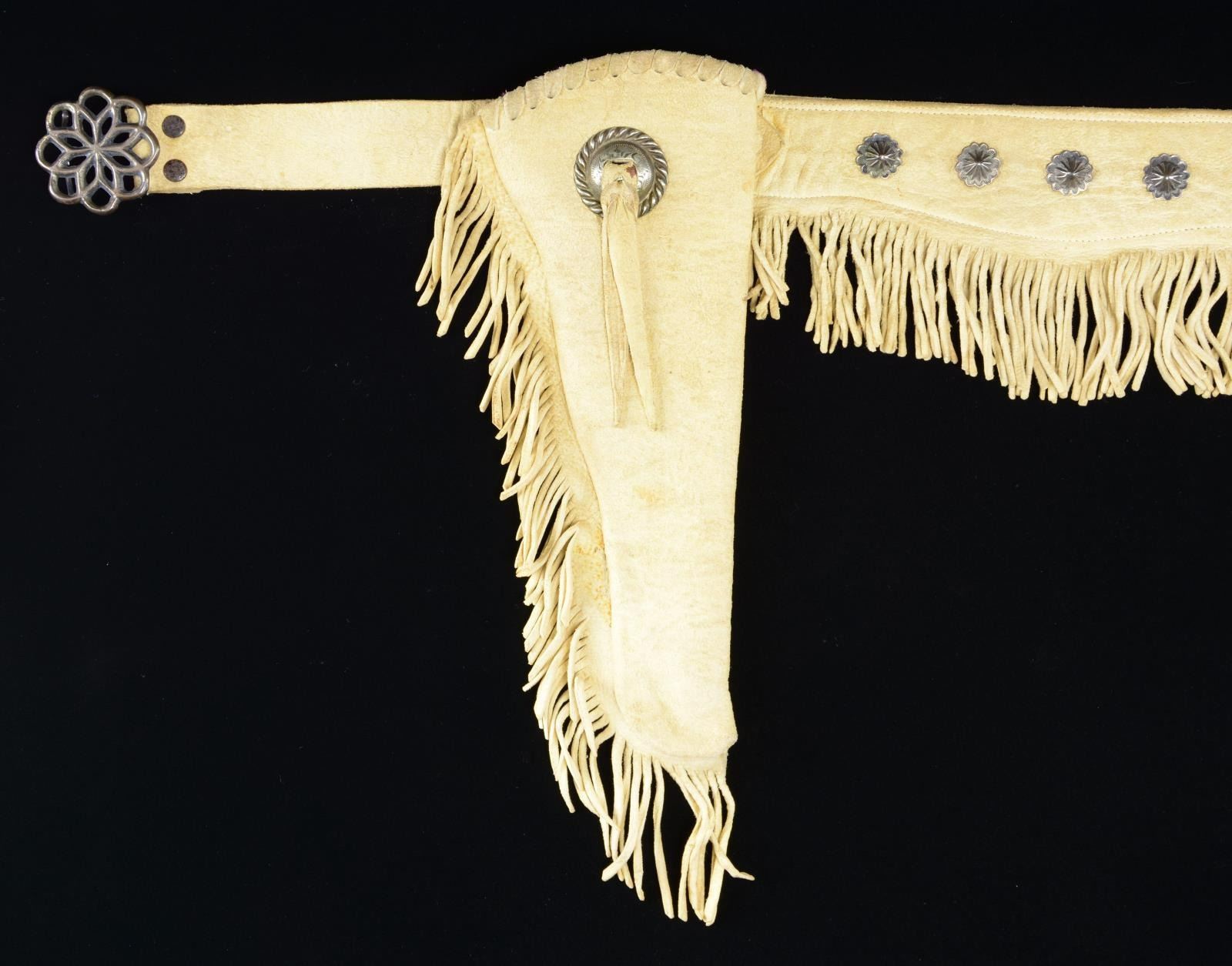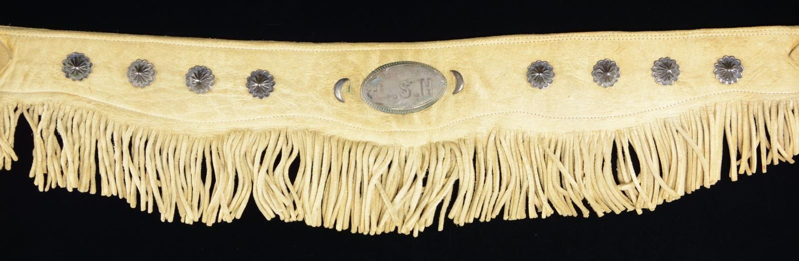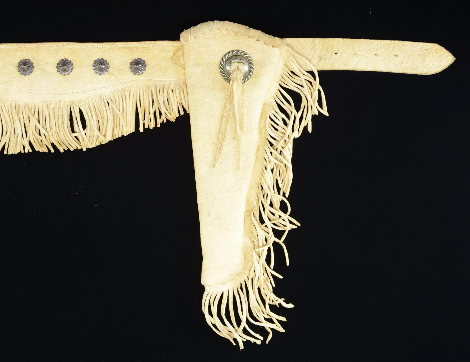 BELT. Pair of rawhide fringed holsters & 40" integral belt for 1851 navy revolvers, silver concho decorated, very good overall, central concho on belt with initials is plated & oxidized, other conchos appear to be coin silver. PROVENANCE: Collection of Horst Kreiner. (02-19993-3/JS). $400-800.