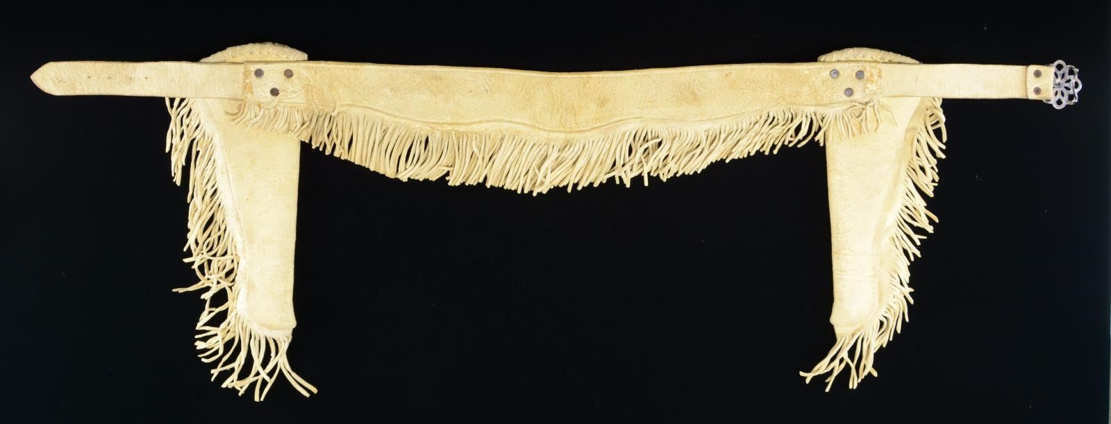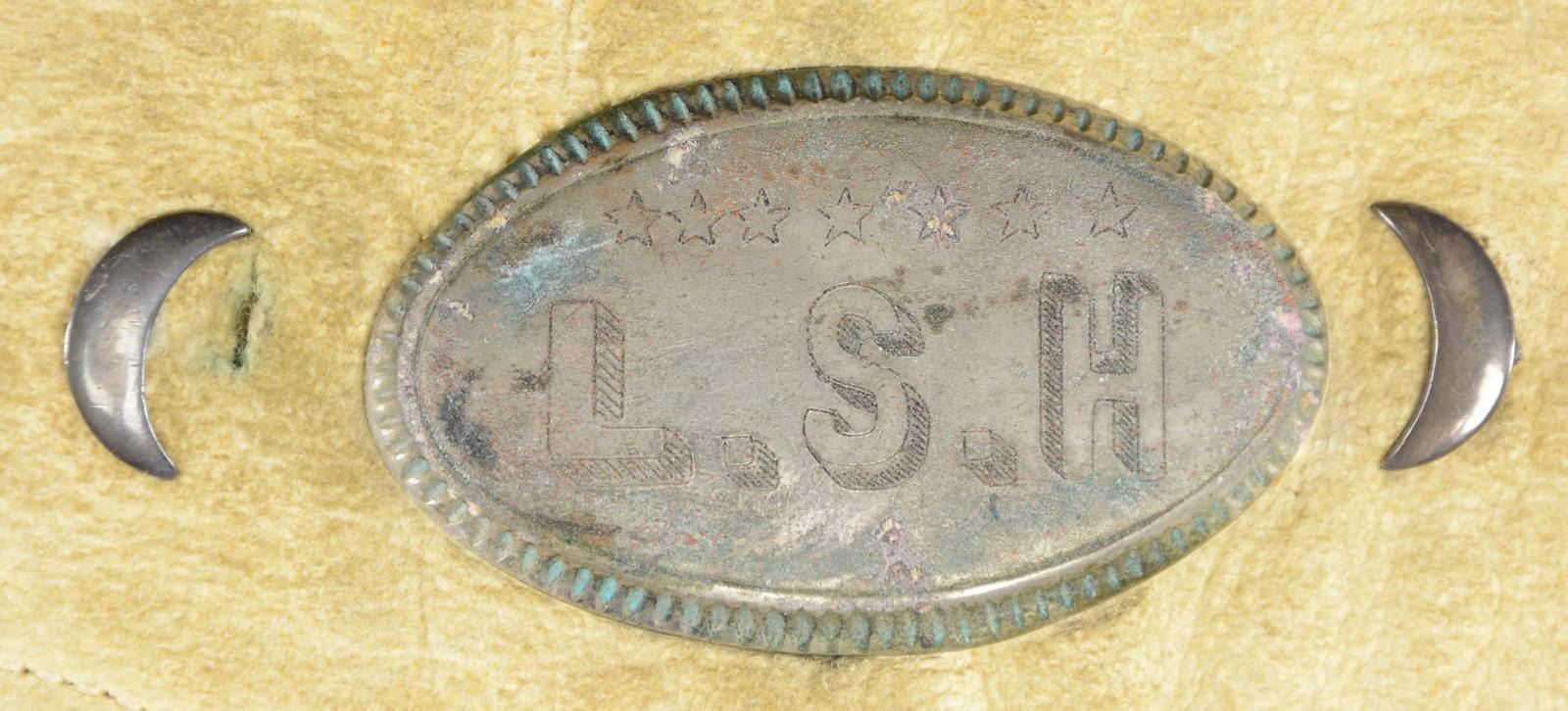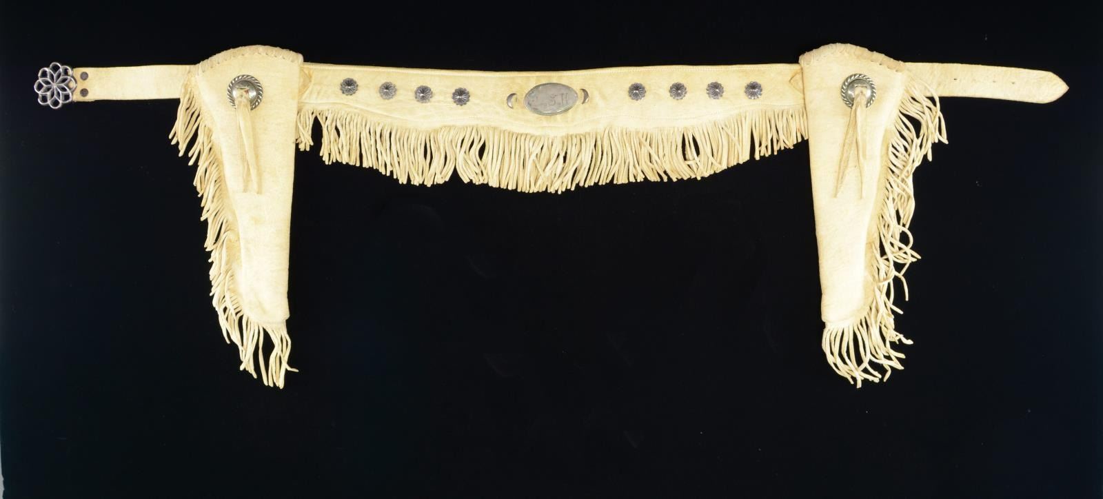 BELT. Pair of rawhide fringed holsters & 40" integral belt for 1851 navy revolvers, silver concho decorated, very good overall, central concho on belt with initials is plated & oxidized, other conchos appear to be coin silver. PROVENANCE: Collection of Horst Kreiner. (02-19993-3/JS). $400-800.