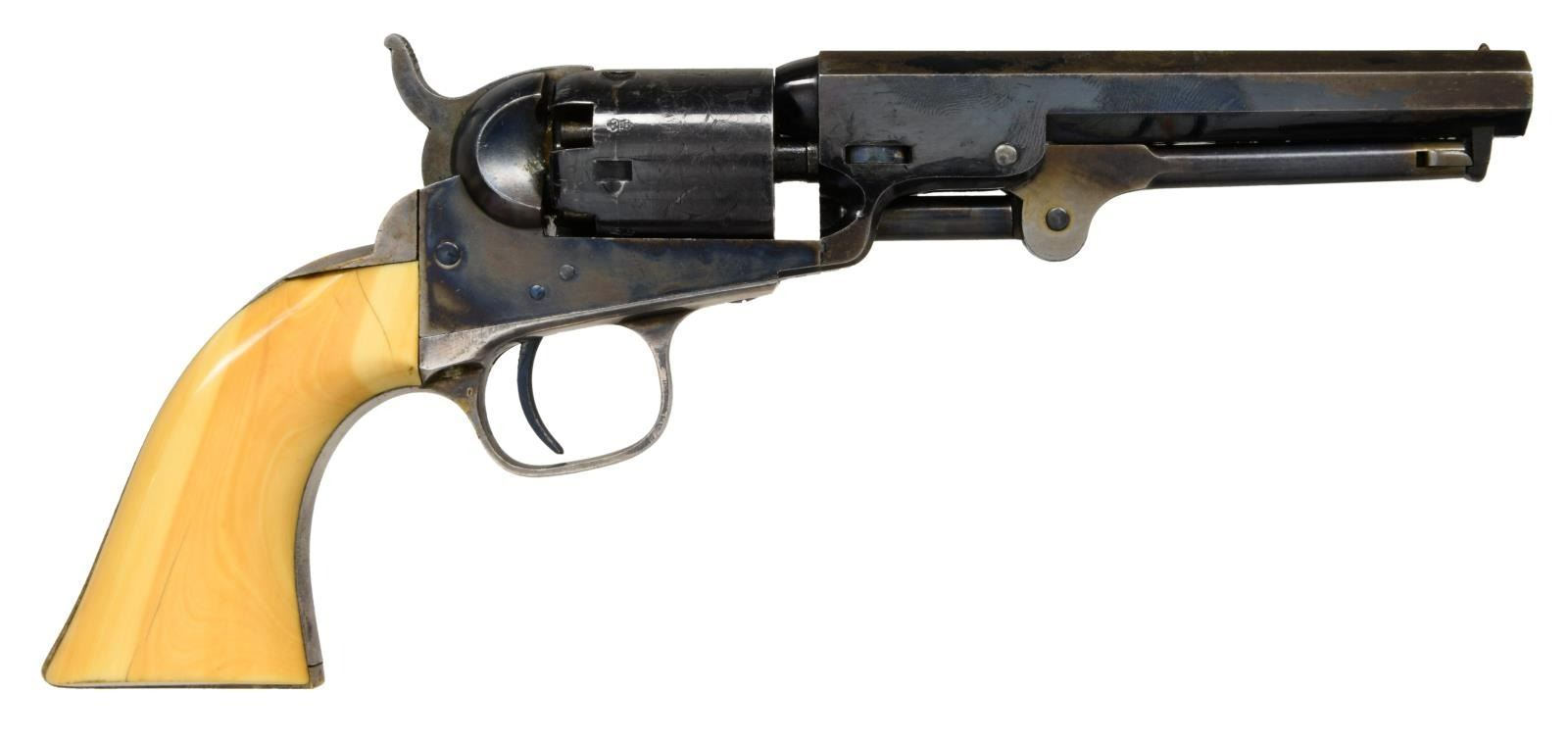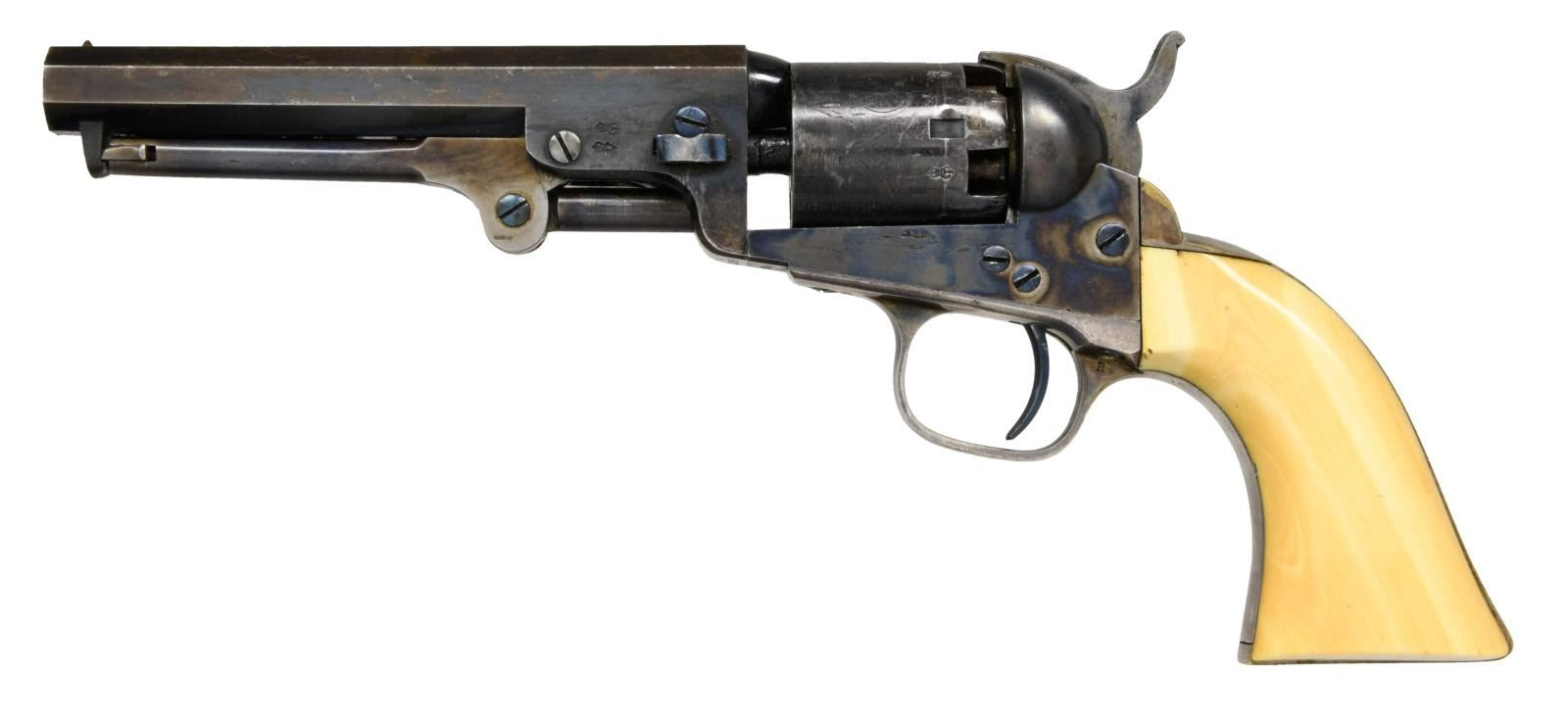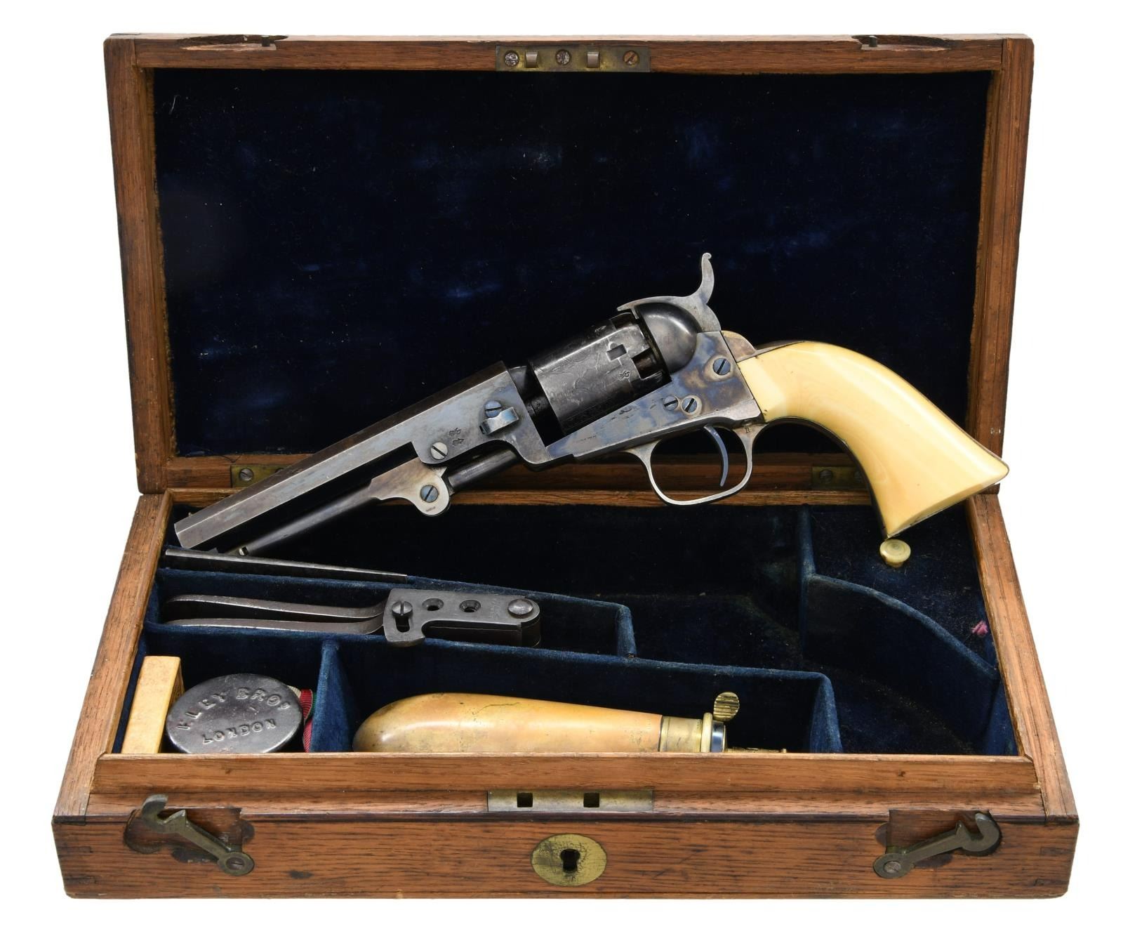 POCKET REVOLVER, FACTORY IVORY GRIPS. Cal. 31. S# 212846. Standard configuration, 5" octagonal barrel with one line New York address, London proofs on the left side of barrel housing and on cylinder. "E" stamped under each serial number on major parts. Revolver manufactured in 1862 during height of American Civil War. English oak casing, vacant round brass plaque on the lid, blue baize lining, compartmented for revolver, 2-cavity "Colts Patent" bullet mold, Dixon bag flask, Original sealed pack of five cartridges, large Ely cap tin, combination tool, bullets, and functional key. CONDITION, very fine overall, all original and matching. Barrel retains over 60% bright London factory blue, chipped not worn. Cylinder retains about 80% factory blue, strong case colors on frame, hammer, and loading assembly. Grip frame retains about 75% silver plate, we patinaed ivory grips well fit, sharp edges, with two hairlines. Casing and accessories are good. Mechanically fine, bright shiny bore. PROVENANCE: Horst Held 2000, Collection of Horst Kreiner. (01-23988/JS). $6,000-8,000.