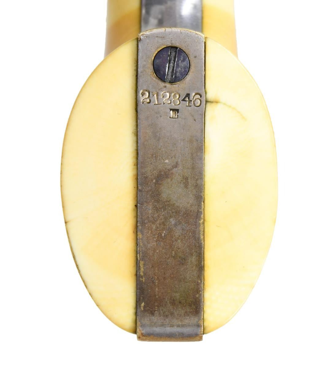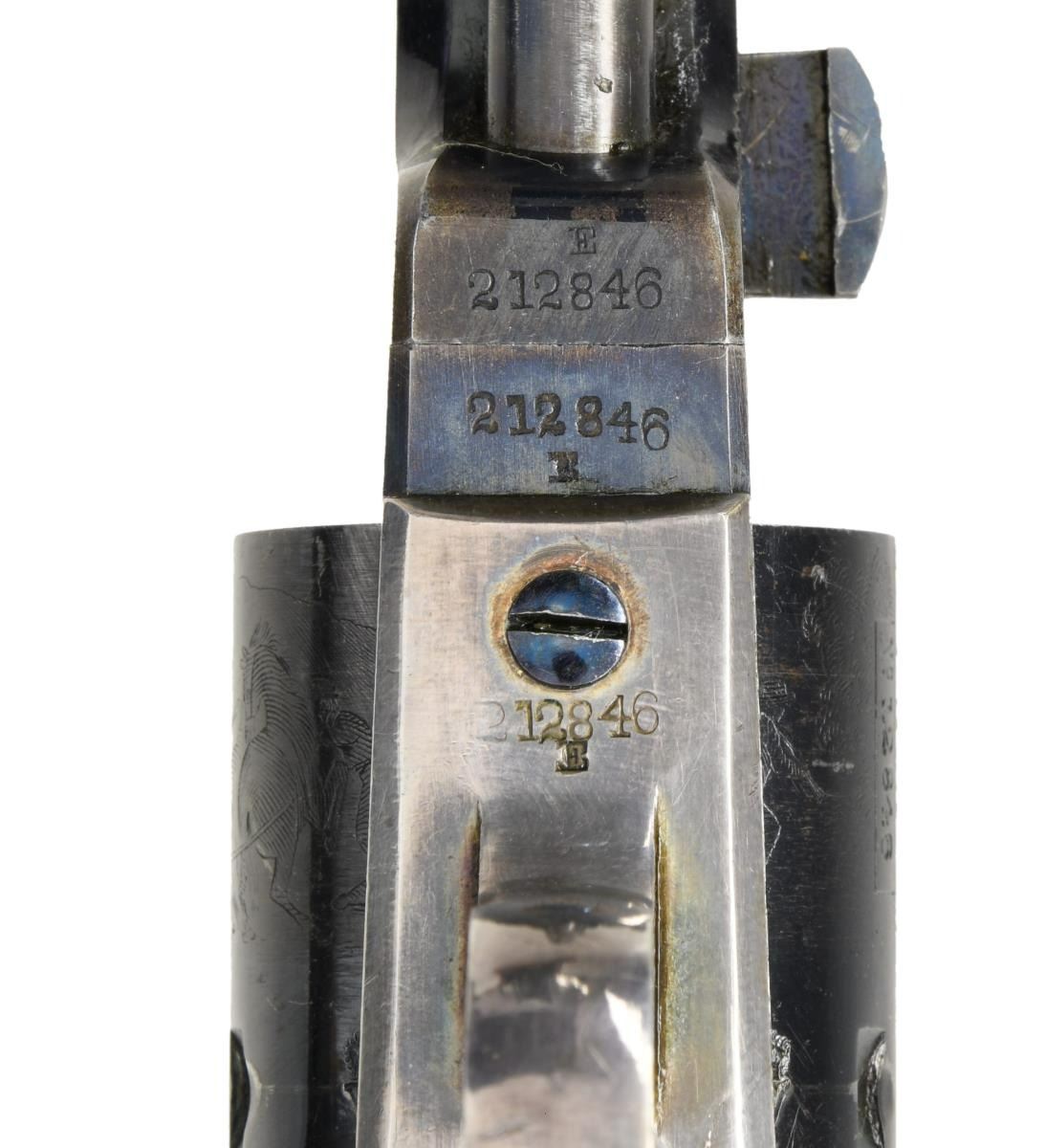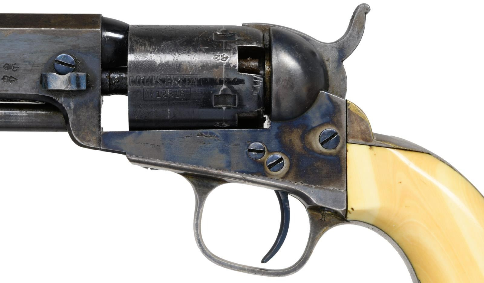 POCKET REVOLVER, FACTORY IVORY GRIPS. Cal. 31. S# 212846. Standard configuration, 5" octagonal barrel with one line New York address, London proofs on the left side of barrel housing and on cylinder. "E" stamped under each serial number on major parts. Revolver manufactured in 1862 during height of American Civil War. English oak casing, vacant round brass plaque on the lid, blue baize lining, compartmented for revolver, 2-cavity "Colts Patent" bullet mold, Dixon bag flask, Original sealed pack of five cartridges, large Ely cap tin, combination tool, bullets, and functional key. CONDITION, very fine overall, all original and matching. Barrel retains over 60% bright London factory blue, chipped not worn. Cylinder retains about 80% factory blue, strong case colors on frame, hammer, and loading assembly. Grip frame retains about 75% silver plate, we patinaed ivory grips well fit, sharp edges, with two hairlines. Casing and accessories are good. Mechanically fine, bright shiny bore. PROVENANCE: Horst Held 2000, Collection of Horst Kreiner. (01-23988/JS). $6,000-8,000.