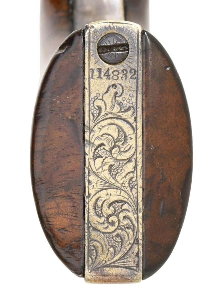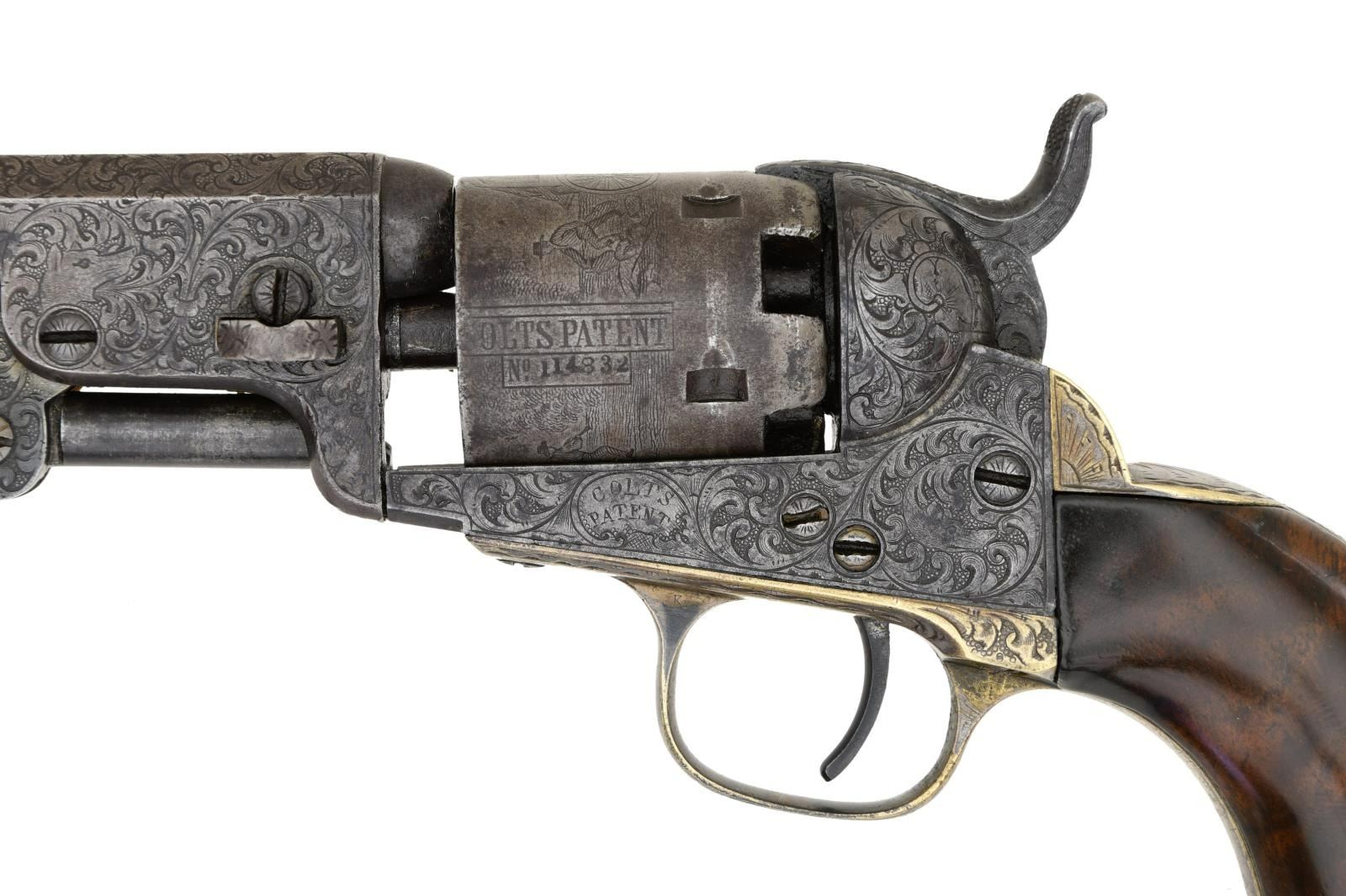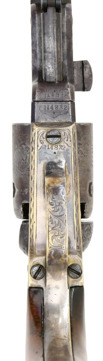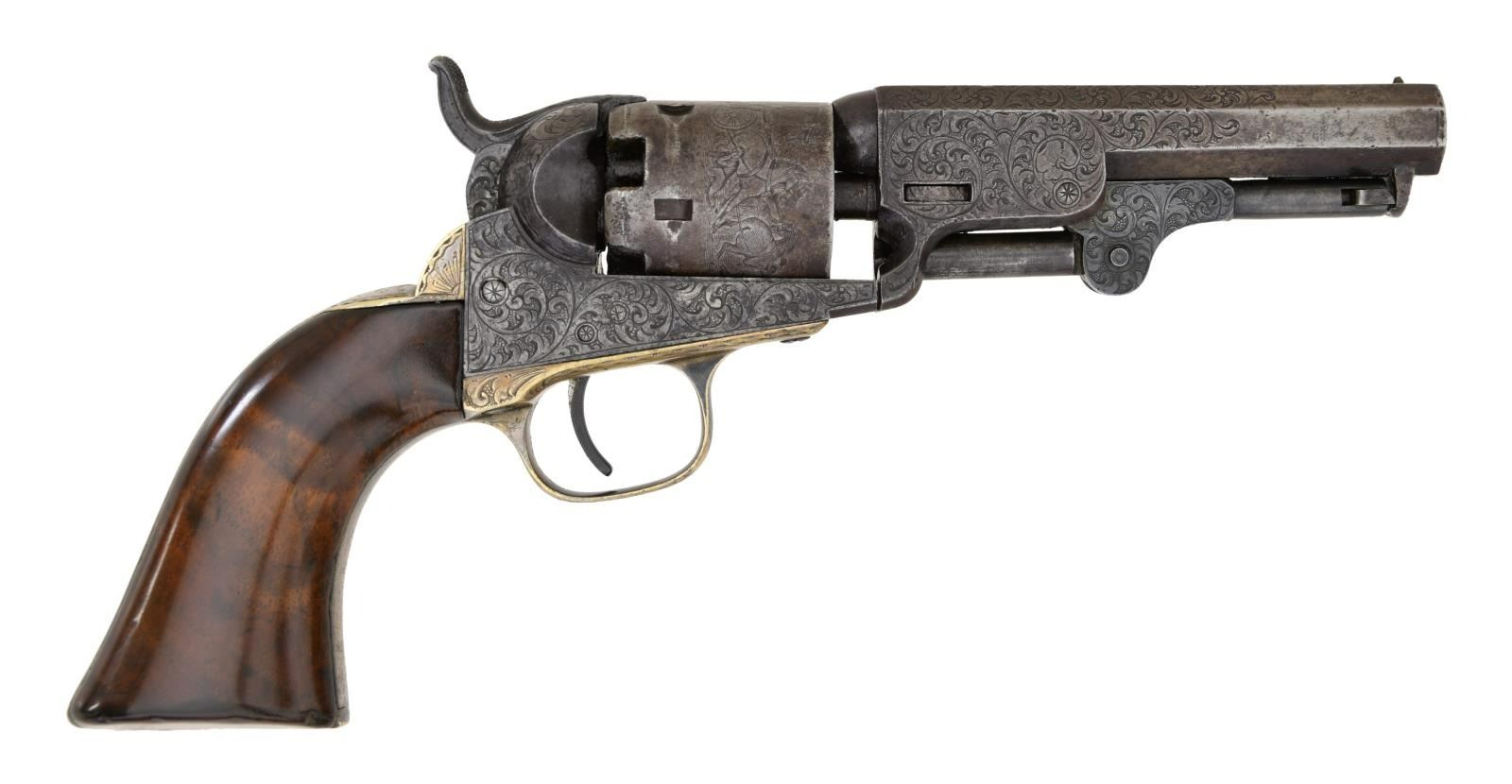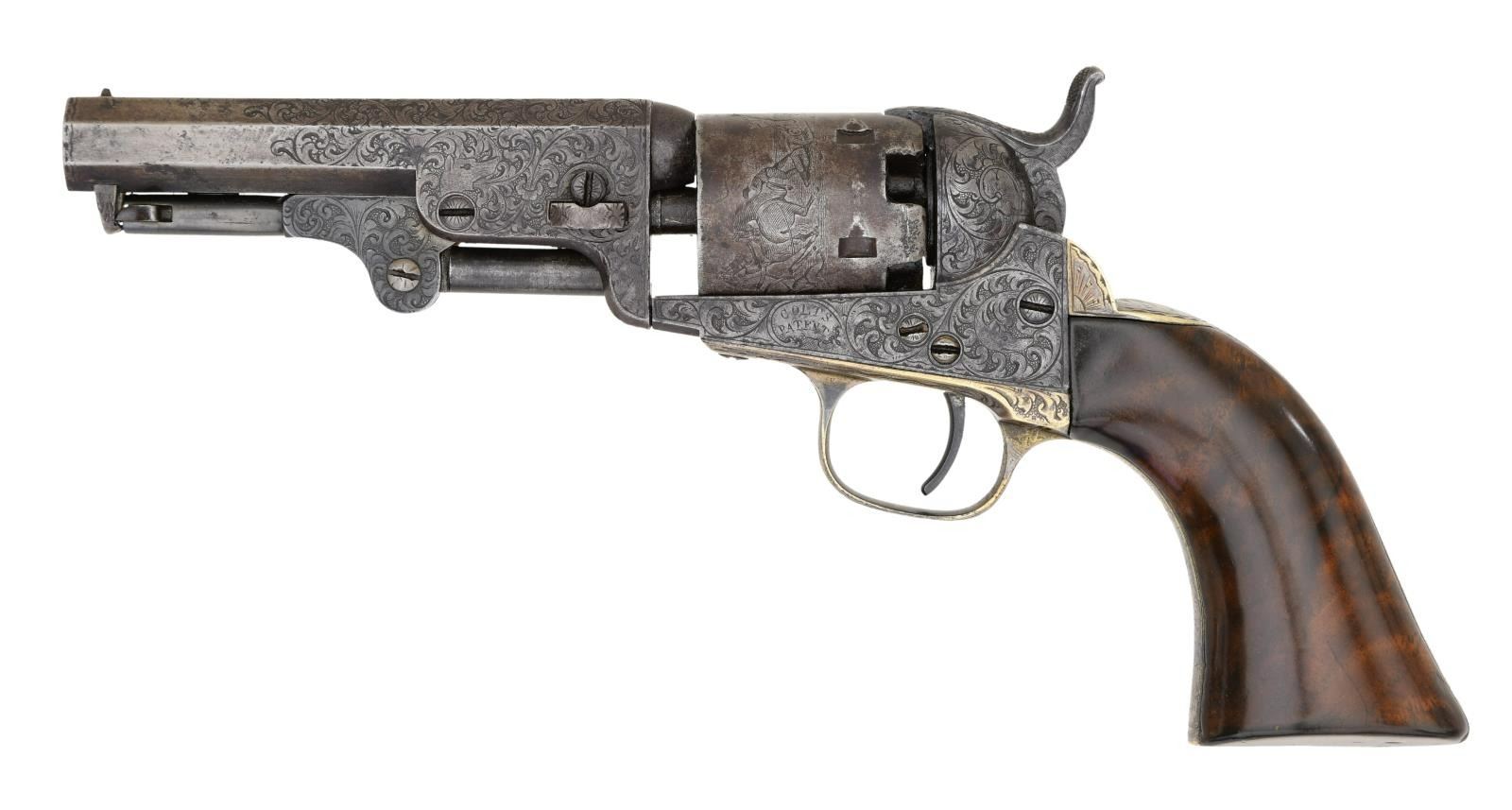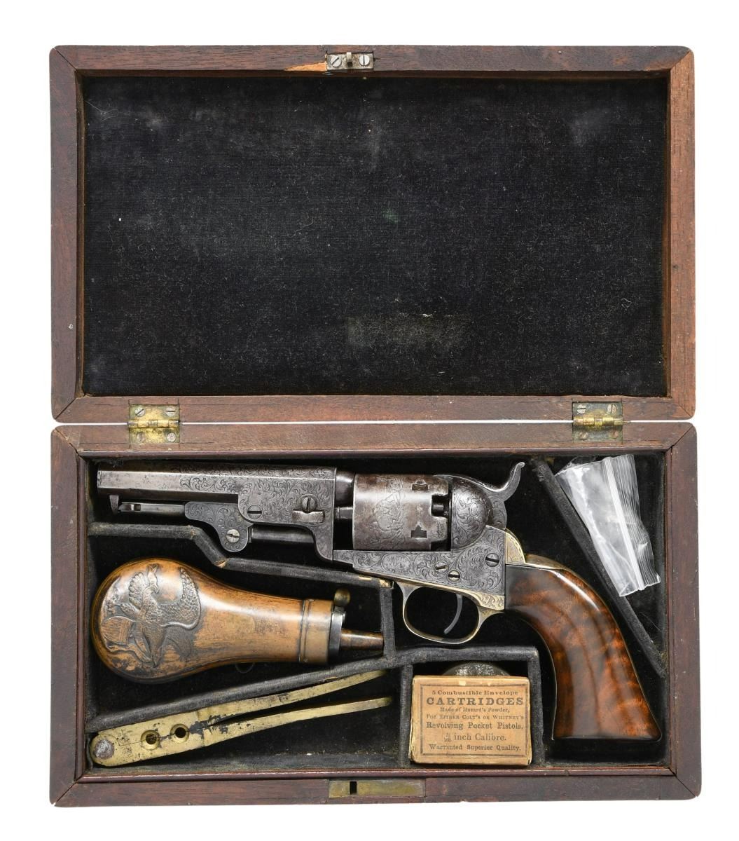 POCKET REVOLVER. Cal. 31 S# 114832. Standard configuration, 4" octagonal barrel engraved "Saml Colt" on top flat. Distinctive fine Gustave Young scroll engraving terminating in dog's heads on the left side a frame and barrel housing and flowers on right. Cylinder has rolled Stagecoach hold up scene. Revolver was manufactured in 1856. Pistol is housed in compartmented Colt green velvet lined walnut casing with two-sided eagle flask, COLT PATENT two-cavity brass mold, ELY cap tin, Pack of five combustible cartridges, and loose rounds. This is a very attractive uncleaned dark gun with well discerned crisp engraving and cylinder scene. CONDITION, very good to fine overall, all original and matching, no original finish but sharp edges and good markings, cylinder scene is all discerned, grip frame retains about 20% original silver plate. Mechanically fine with crisp rifled bore. Grips are refinished and revarnished. Casing and accessories are very good. PROVENANCE. Bill Sisney 1999, Collection of Horst Kreiner. (01-23990/JS). $6,000-8,000.