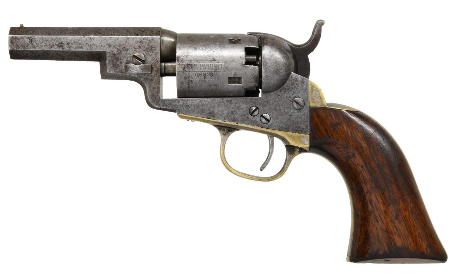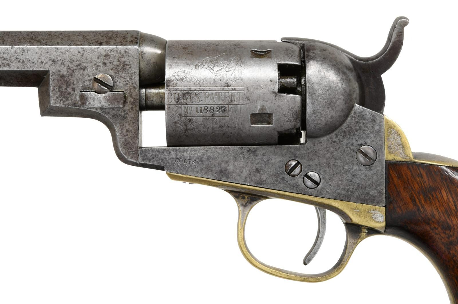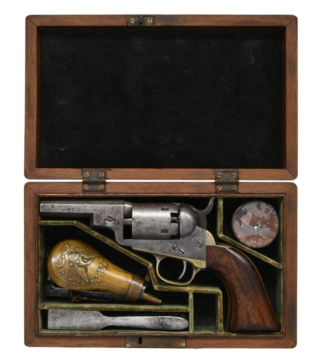 REVOLVER. Cal. 31. S# 118823. Popular Colt variation with 3" octagonal barrel, 2-line New York City address & brass bead front sight, made without loading lever and long known to collectors as the "Wells Fargo" model. This model falls into two serial ranges, and this range made mid 1850s often has a small "8" stamped under serial number on barrel and frame as seen on this example. Standard configuration, five shot cylinder with rolled Stagecoach holdup scene, silver plated grip frame, varnished walnut grips. This example was manufactured 1856. Walnut casing is compartmented for revolver, two sided eagle flask, two cavity "Colt patent" mold, ELY cap tin, & L-shaped combination tool. CONDITION: good-very good overall. Revolver has no original finish and is overall gray iron patina, all matching, good markings other than S# on butt is missing, cylinder retains discernible Stagecoach hold up scene. Grip frame retains about 10% original silver plating, grips retain over half their original factory varnish. Mechanically fine with crisp rifled bore. PROVENANCE: Robin Rapley 2003, Collection of Horst Kreiner. (01-23986/JS). $5,000-7,000.
