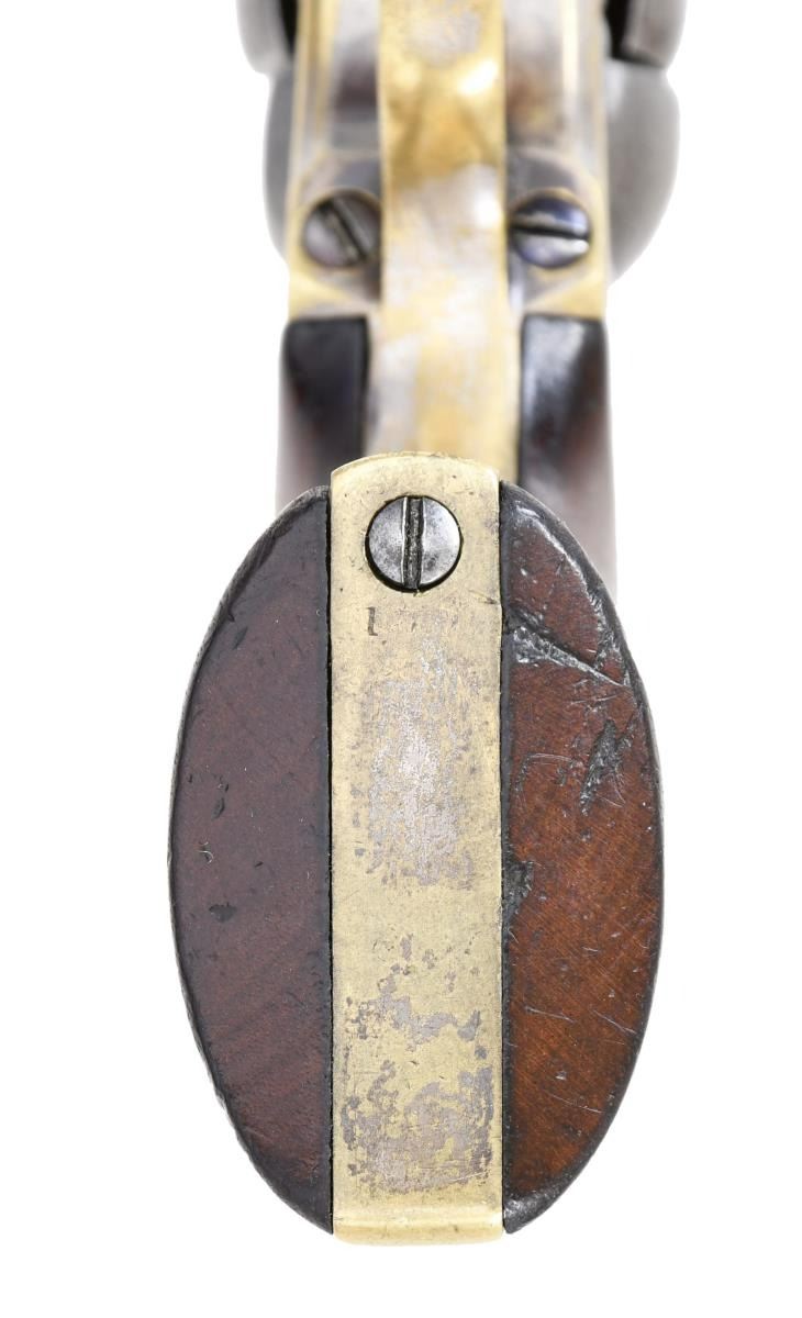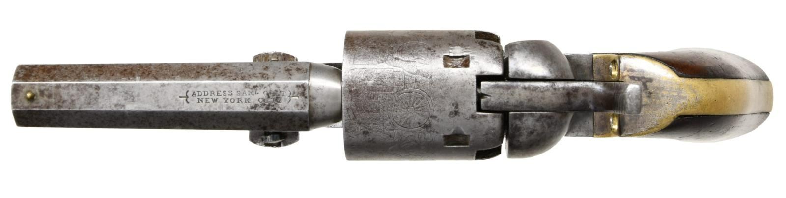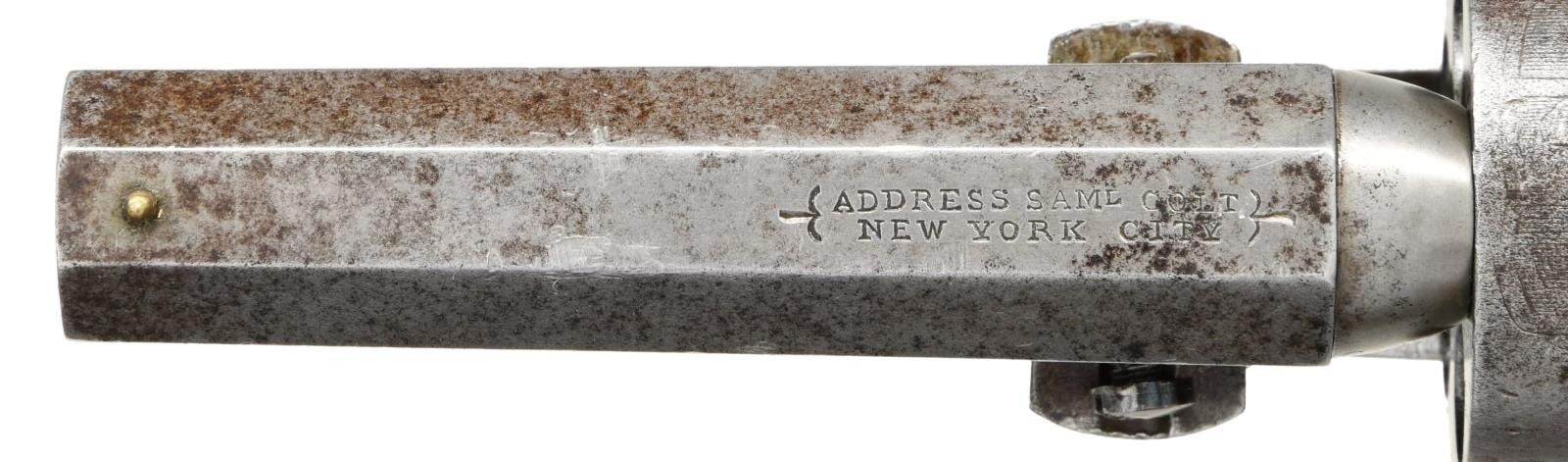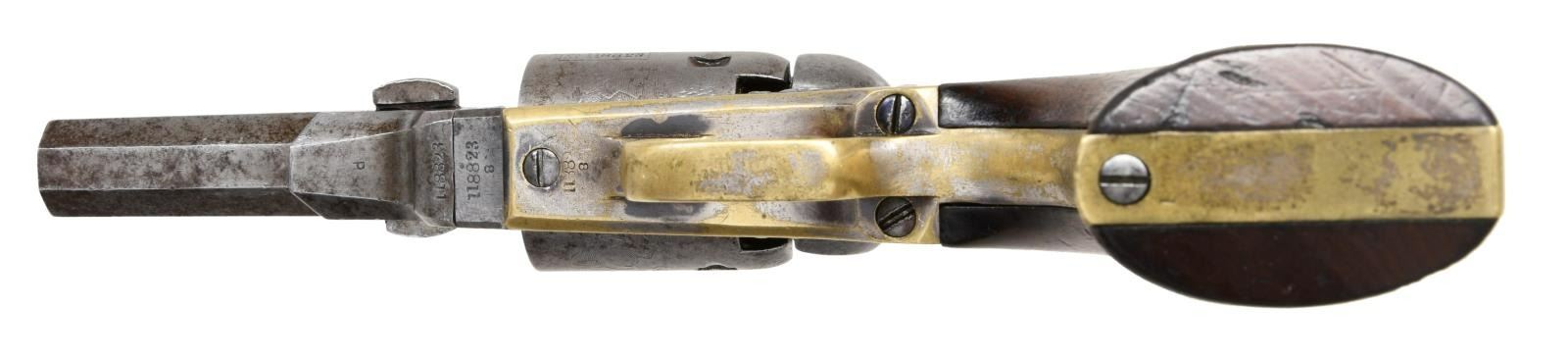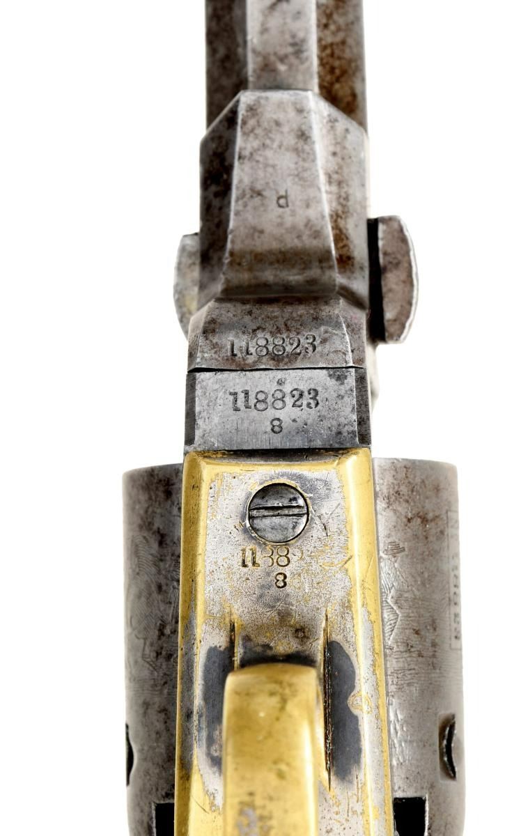 REVOLVER. Cal. 31. S# 118823. Popular Colt variation with 3" octagonal barrel, 2-line New York City address & brass bead front sight, made without loading lever and long known to collectors as the "Wells Fargo" model. This model falls into two serial ranges, and this range made mid 1850s often has a small "8" stamped under serial number on barrel and frame as seen on this example. Standard configuration, five shot cylinder with rolled Stagecoach holdup scene, silver plated grip frame, varnished walnut grips. This example was manufactured 1856. Walnut casing is compartmented for revolver, two sided eagle flask, two cavity "Colt patent" mold, ELY cap tin, & L-shaped combination tool. CONDITION: good-very good overall. Revolver has no original finish and is overall gray iron patina, all matching, good markings other than S# on butt is missing, cylinder retains discernible Stagecoach hold up scene. Grip frame retains about 10% original silver plating, grips retain over half their original factory varnish. Mechanically fine with crisp rifled bore. PROVENANCE: Robin Rapley 2003, Collection of Horst Kreiner. (01-23986/JS). $5,000-7,000.