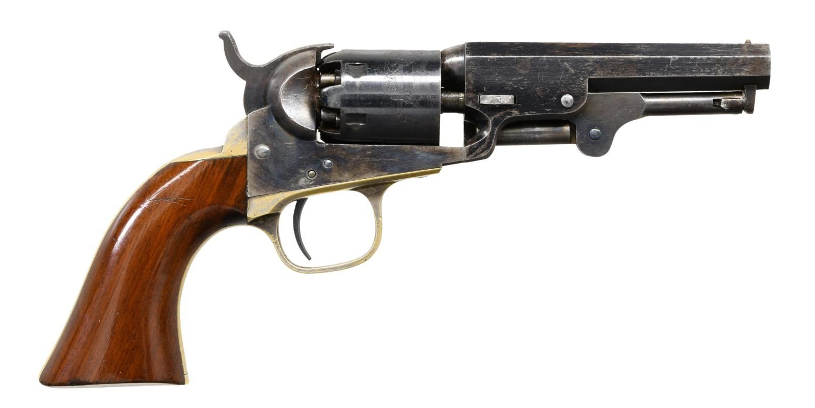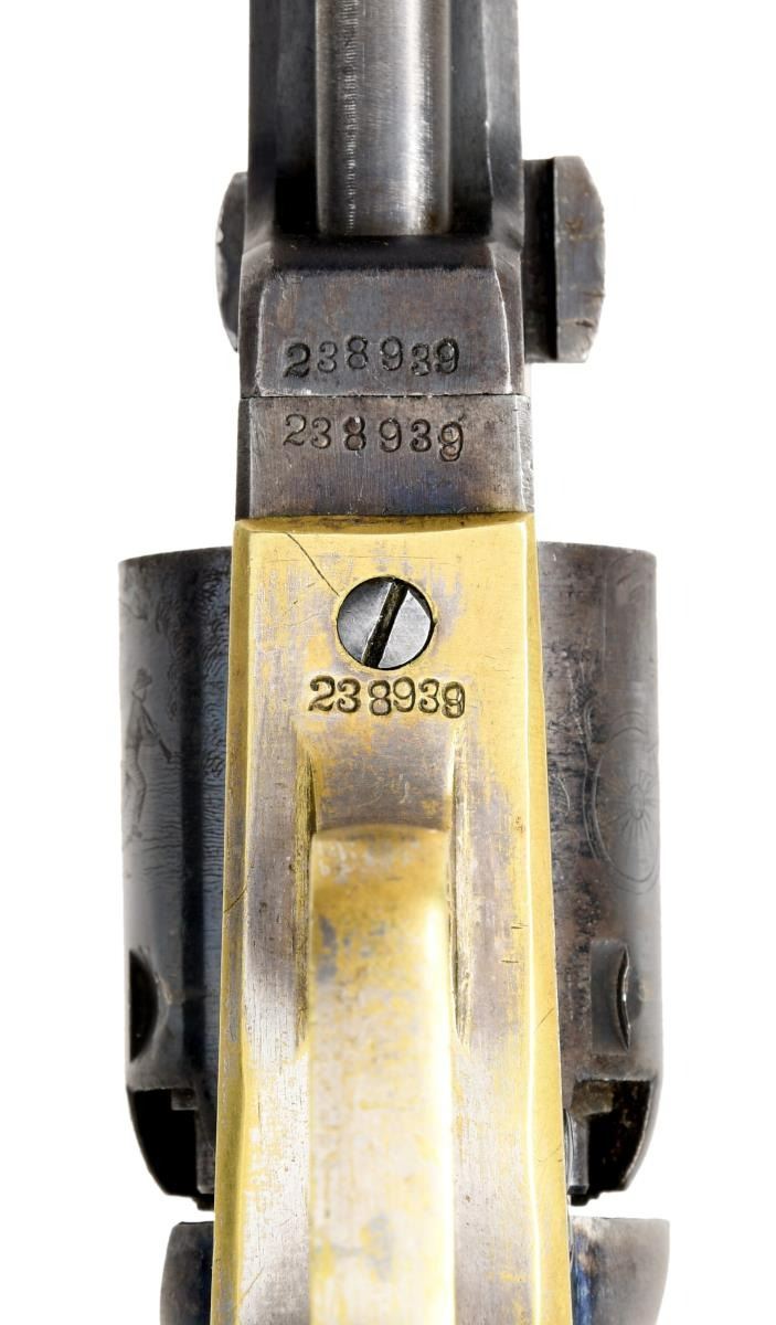 Cal. 31. S# 238939. Bbl. 4" octagon w/ New York address & brass bead. Six shot round cyl. w/ stagecoach scene roll engraving. Blue finish w/ case colored frame & hammer. Silver finished brass backstrap & large round trigger guard. 1 piece walnut grip. Bbl., frame, grip straps & cyl. have matching numbers. Mfg. 1863. CONDITION: very good. Bbl. & cyl. retain over 80% blue showing edge wear, spotting & small marks. Over 80% lightly faded case colors. Grip straps retain some silver finish in protected areas. Original grip finish shows scratches & marks. Sound action. Bore retains strong rifling showing small spots of light pitting. (01-24186/DS). ANTIQUE. $5000-7000.