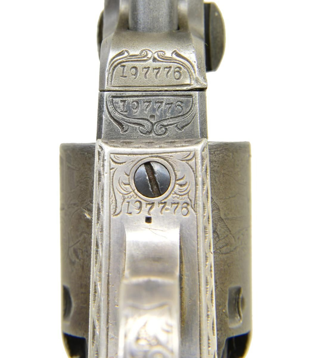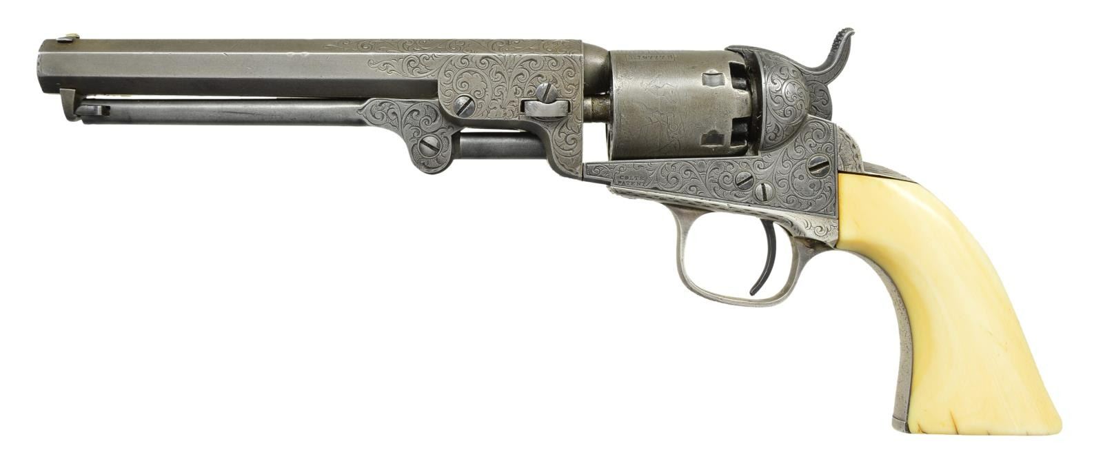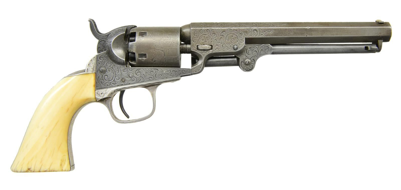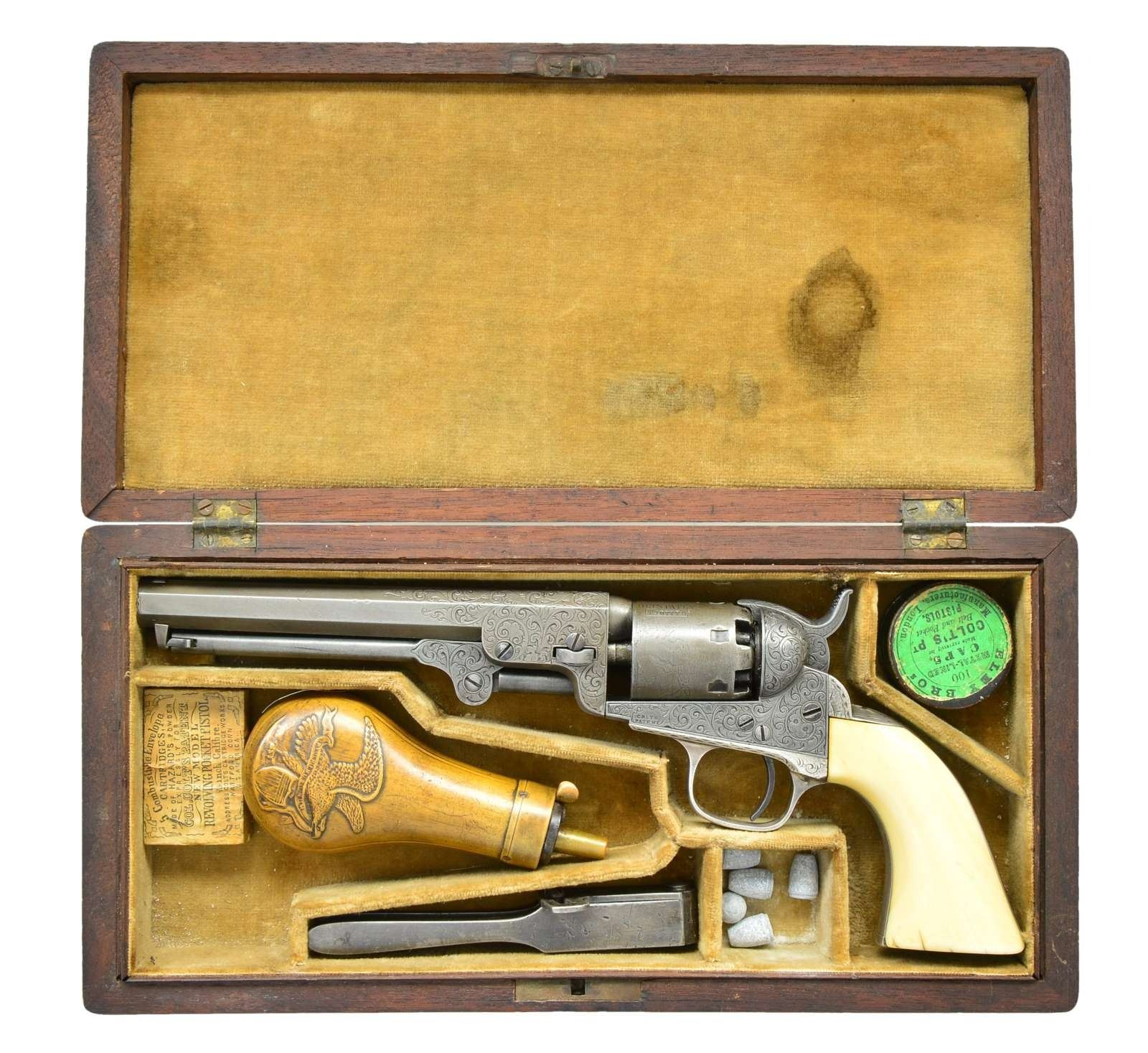 REVOLVER. Cal. 31. S# 197776. Bbl. 6" octagon w/ engraved "Saml Colt" marking. Dovetail mounted blade front sight. Round six shot cyl. w/ stagecoach scene roll engraving. Frame, bbl., grip straps & loading lever have early Germanic vine type factory scroll engraving w/ punch dot backgrounds as produced in the shop of Gustave Young. Hammer has signature wolf's head. Large round trigger guard silver finish. Bbl., frame, grip straps, loading lever & cyl. have matching numbers. Dot below S#s signifies silver finish. 1 Piece Ivory grip. Mfg. 1862 during the American Civil War. UNATTACHED ACCESSORIES: period style presentation box w/ faded cloth interior showing wear spots. Box contains American eagle flask, 2 cavity mold, cap tin, round ball & bullets. Also includes 1 five round package of combustible envelope cartridges. CONDITION: very good. Bbl., frame, cyl. & loading lever finish shows a dull gray tarnish. Grip straps have brighter silver finish. Grips have a mild aged yellow appearance w/ grain checks & small chips. Good mechanics. Lightly pitted bore retains sound rifling. (01-22850/DS). ANTIQUE. $4,000-6,000.