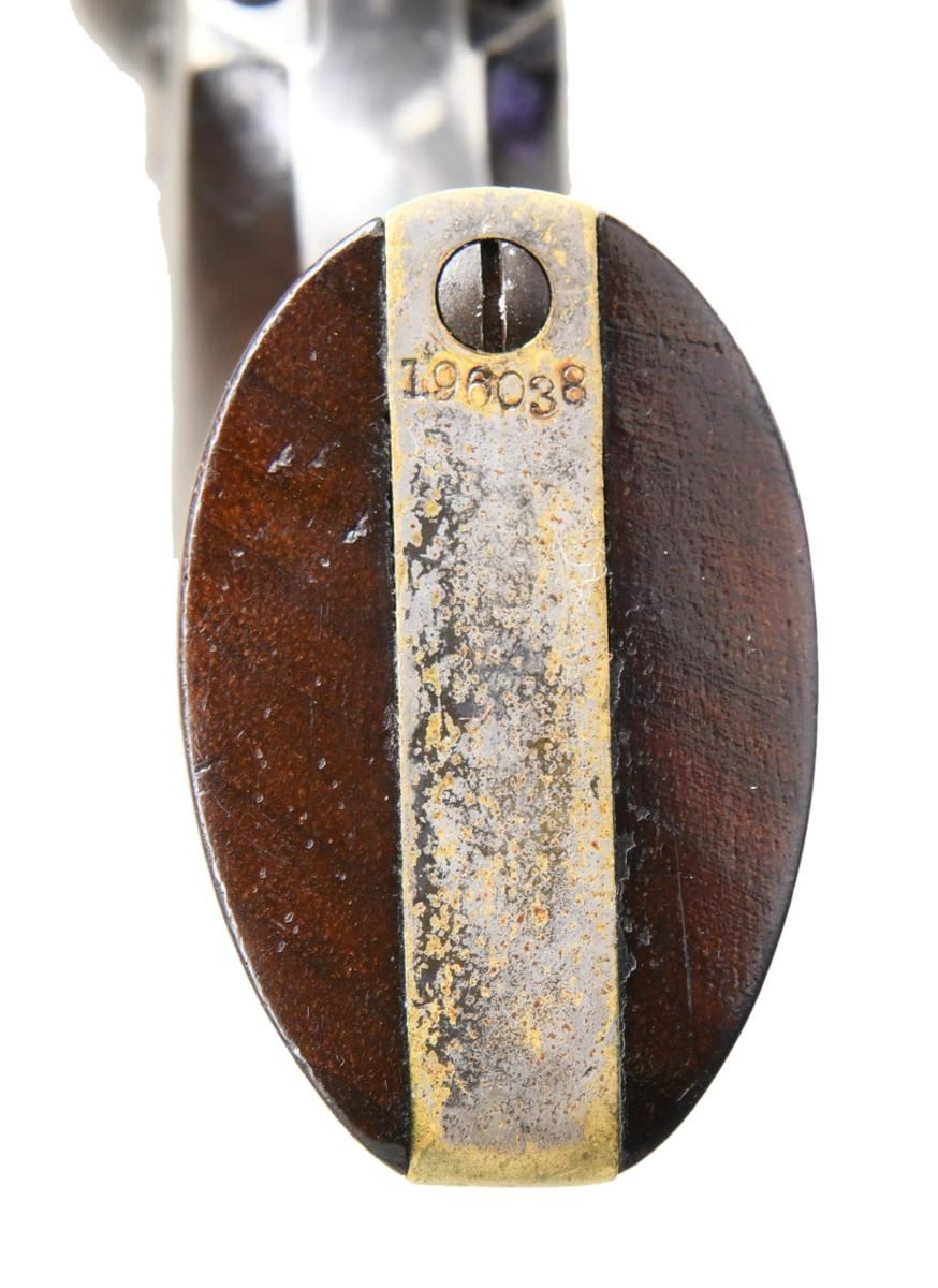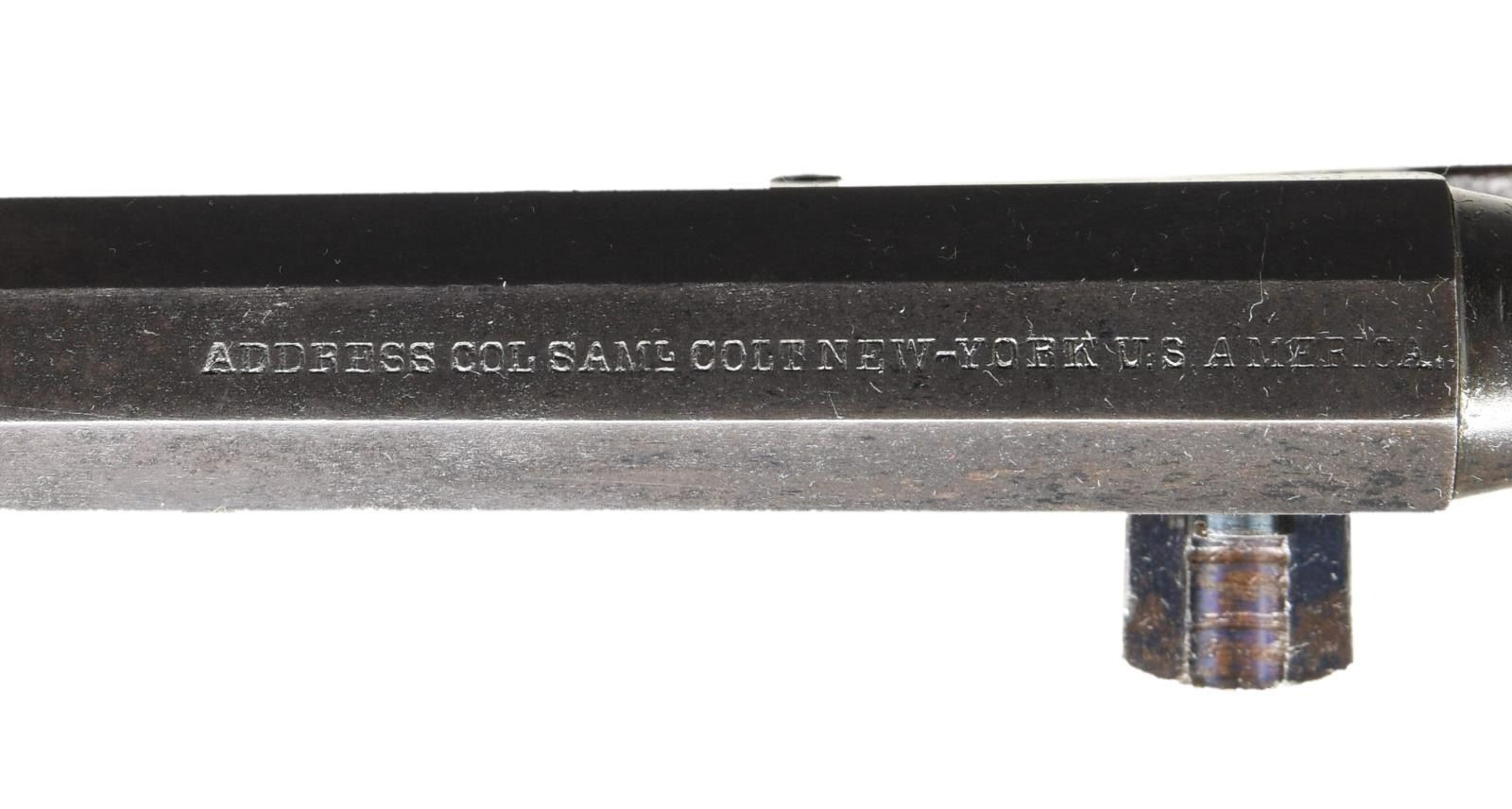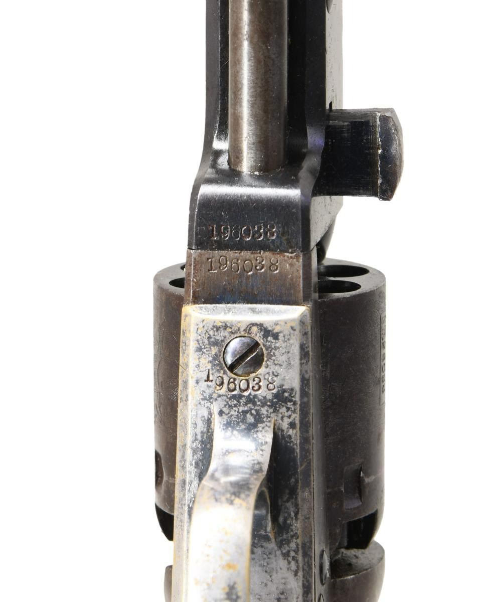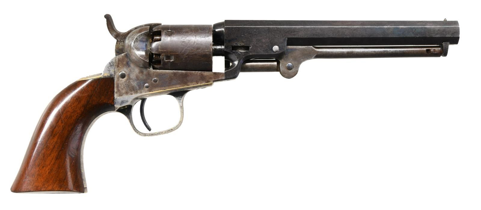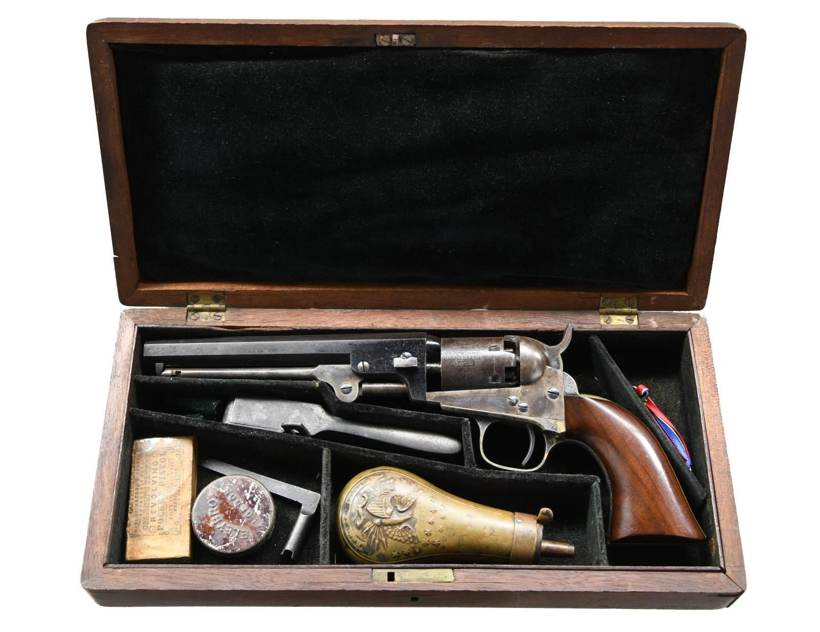 REVOLVER. Cal. 31. S# 196038. Made at the peak of the Civil War fervor late in 1861. The long 6" barrel revolvers were most popular among soldiers though this one did not see a lot of use and retains much of its original blue and case color finish. Standard configuration, 1-line New York address, small 2-line patent on the left side of frame, rolled Stagecoach holdup scene on cylinder, one piece varnished walnut grips. Housed in dark emerald green lined Colt mahogany casing compartmented for 2-cavity COLT'S PATENT mold, two sided eagle flask, cap tin, sealed package of 6 "COL COLT'S PATENT REVOLVING POCKET PISTOL" cartridges. CONDITION: very good to fine overall, pistol retains strong areas a bright blue with balance plum patina, cylinder has traces of blue and crisp rolled cylinder scene. Frame, hammer and loading assembly retain strong areas of case color with balance silver/gray. Grips retain virtually all of their original factory varnish, grip frame retains about 70% original silver plate. Mechanically fine, crisp shiny rifled bore. Original Colt casing internally is very good with soiling and rub marks as expected. Accessories are sound and very good. PROVENANCE: Collection of Horst Kreiner, casing originally had a different pistol that was upgraded in 2005 from Richard Kravarik at CCA show. (01-23989/JS). $4,000-5,000.