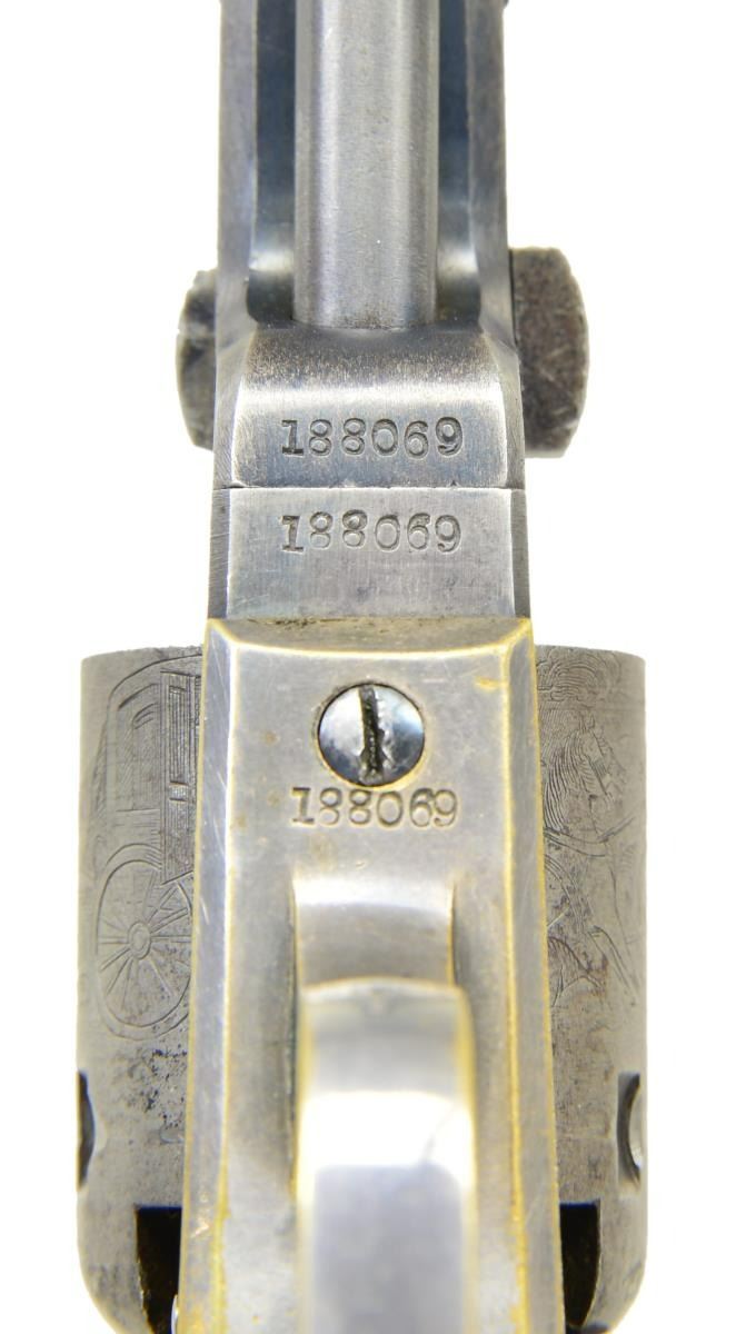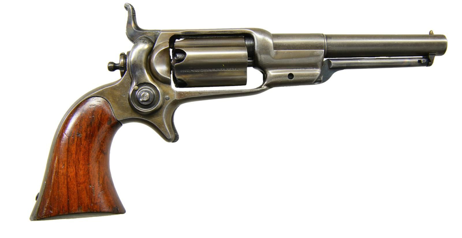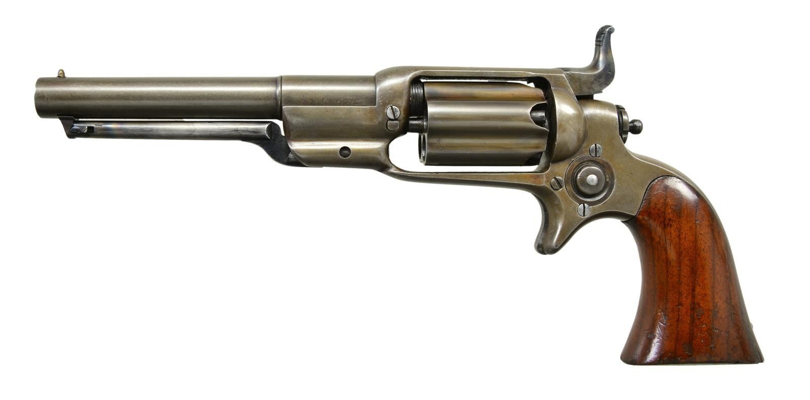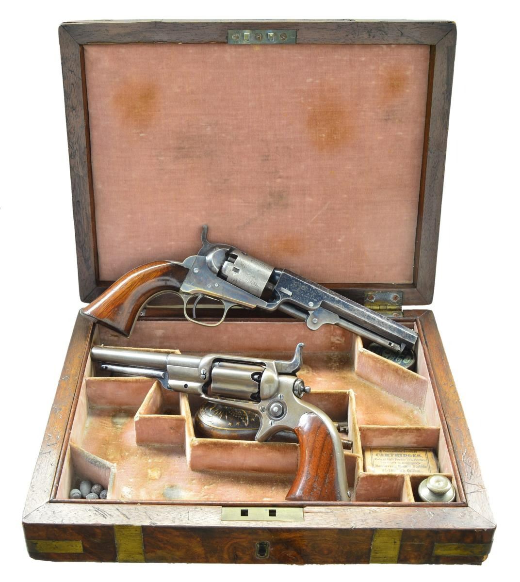 Cals. 31 both. (1) Model 1849 Pocket: S# 188069. Bbl. 5" octagon w/ New York address & cone type front sight. Round five shot cyl. w/ stagecoach scene roll engraving. Blue & cse colored finish w/ silver finished brass backstrap & large round trigger guard. 1 piece walnut grip. Bbl., frame, grip straps, cyl., loading lever & wedge have matching numbers. Mfg. 1861 during the American Civil War. (2) 1855 "Root" Model 5A Side Hammer Pocket Revolver: S# 2586. Bbl. 4 1/2" round w/ New York address & cone type brass sight. Fluted five shot cyl. Blue finish. 1 piece walnut grip. UNATTACHED ACCESSORIES: added 2 gun case of fancy wood w/ brass trim. Fitted cloth interior has faded worn appearance. Case contains pocket size American eagle flask, 2 cavity bullet mold, oil bottle, Eley cap tin, round balls & bullets. Also included is a wrapped 6 round package w/ combustible envelope packages, cal. 31-100. CONDITION: (1) fine. Bbl. retains 70% blue showing spotted flaking. Cyl. has faded to gray & retains very good visible scene. Frame, hammer & loading lever have over 70% lightly faded case colors. Grip straps show 75% silver finish having a slightly darkened tarnish. Grips have good finish showing small marks & wear spots. Hammer has worn notches. Bore has area at midpoint w/ deep pitting. (2) metal has a gray brown coloration indicating touch up finish. Grips show wear & handling marks w/ chips around butt. Good mechanics. Lightly pitted bore retains sound rifling. (01-22875/DS). ANTIQUE. $3,500-5,000.