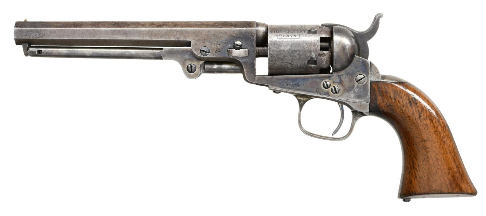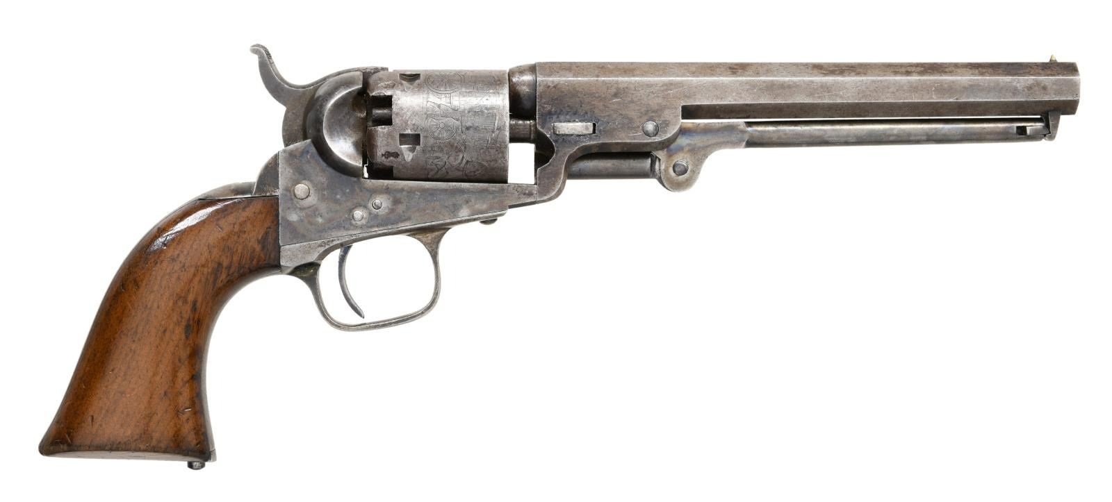 Cal. 31. S#. 6875. bbl.6" octagon with London address. Round 5 shot cyl. has stagecoach scene roll engraving. Blue & case colored finish with silver finished iron backstrap & large trigger guard. 1 piece walnut grip. Bbl., frame, grip straps, cyl. & wedge have matching number. CONDITION: Bbl. & cyl. have over 25% light & faded blue. cyl retains very good scene. Frame & loading lever retain over 50% nicely visible color. Grips show wear & handling marks. Some screws are replacement. Sound action. Pitted bore retains intact rifling. PROVENANCE: From the Lifelong Collection of Glen E. Mattox. (01-22396/DS). ANTIQUE. $1500-2000.