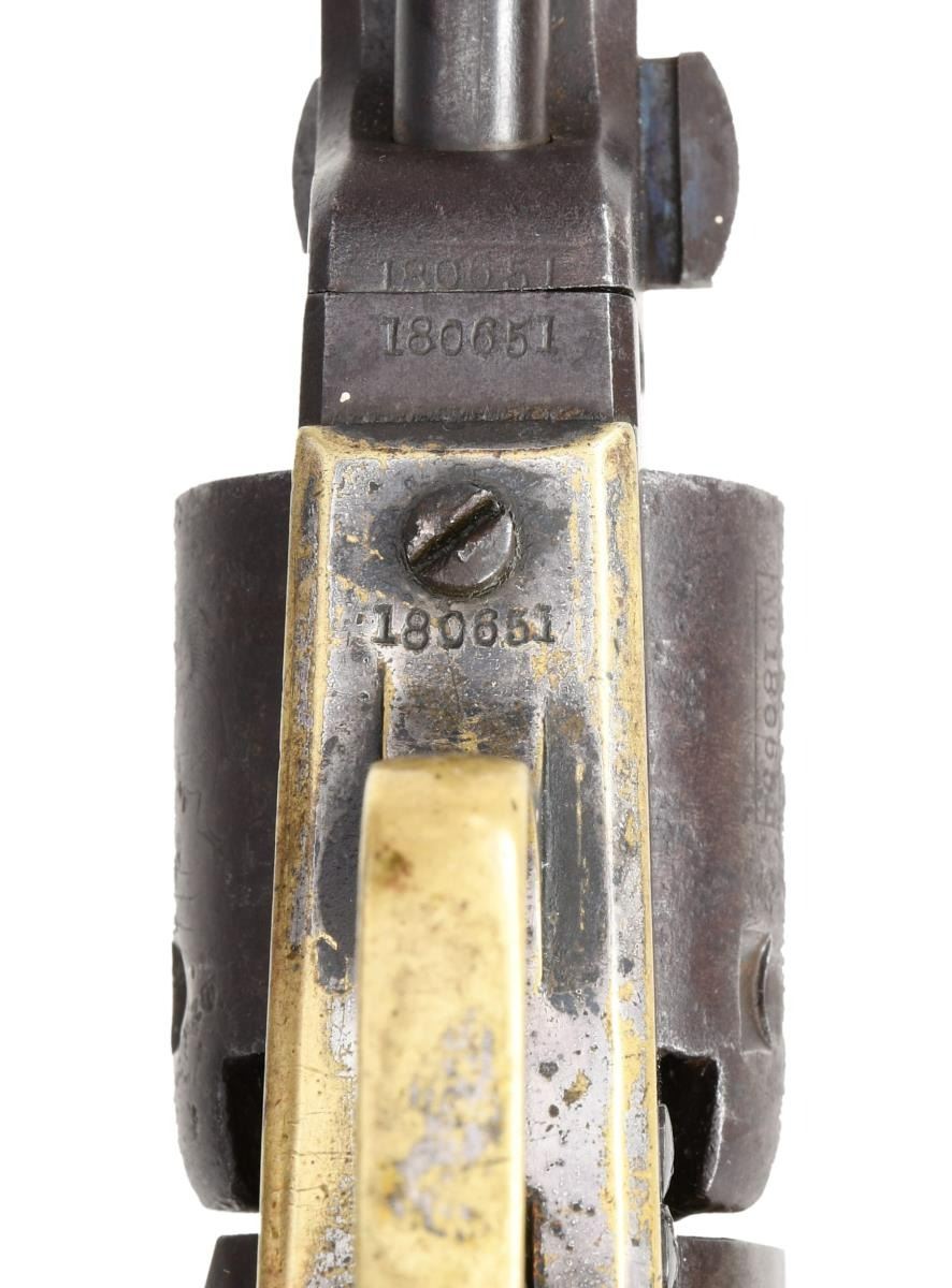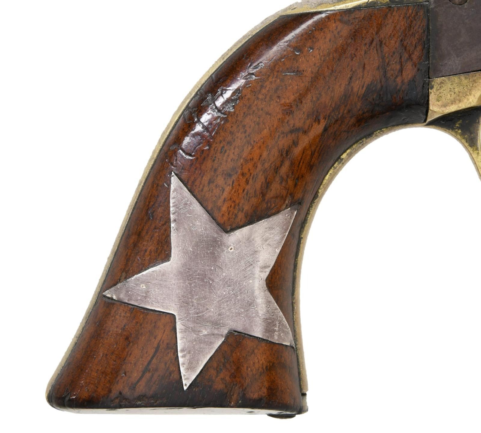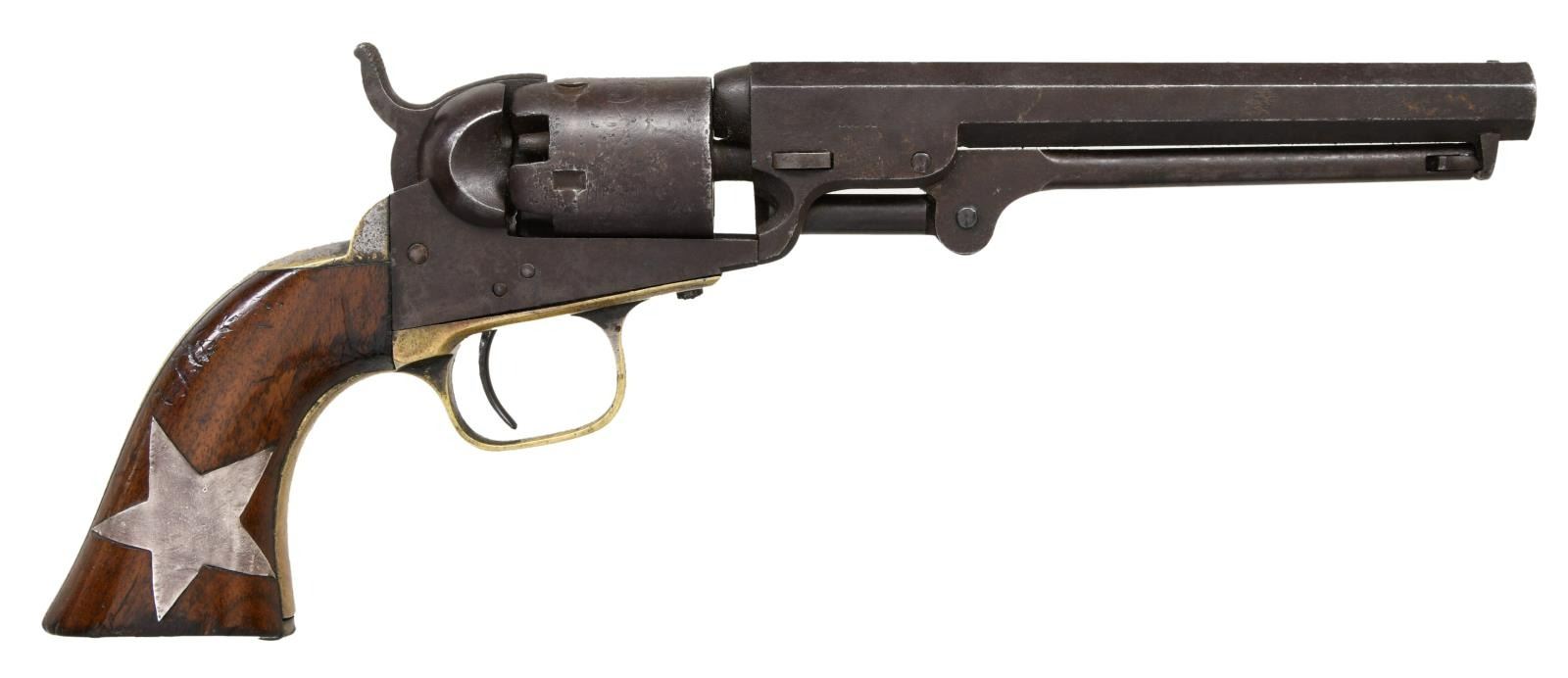 REVOLVER, "INSET SILVER STAR". Cal. 31. S# 180651. Made at the beginning of Civil War fervor late in 1860 or early 1861. The long 6" barrel revolvers were most popular among Southern soldiers and probably shipped South, no Colt factory records exist on this serial number unfortunately. Revolver has a 1.5" expertly inset silver star in the right grip panel that just says "Texas" to this cataloger. Otherwise, revolver is in standard configuration, blue and case color finish. 2-line Hartford address, small 2-line patent on the left side of frame, rolled "stagecoach holdup" scene on cylinder, 1-piece varnished walnut grips. CONDITION: very good overall, all matching & complete, wedge is not numbered, revolver retains strong traces of bright blue with balance plum/brown patina with scattered pitting, cylinder has mostly discernible rolled cylinder scene. Grips retain virtually all their original factory varnish undisturbed by the inset star. The bottom point of star is partially lifting, but still firmly attached. Grip strap retains about 25% tarnished silver plate. Mechanically fine with crisp rifled bore. (01-24035/JS). $1,000-3,000.