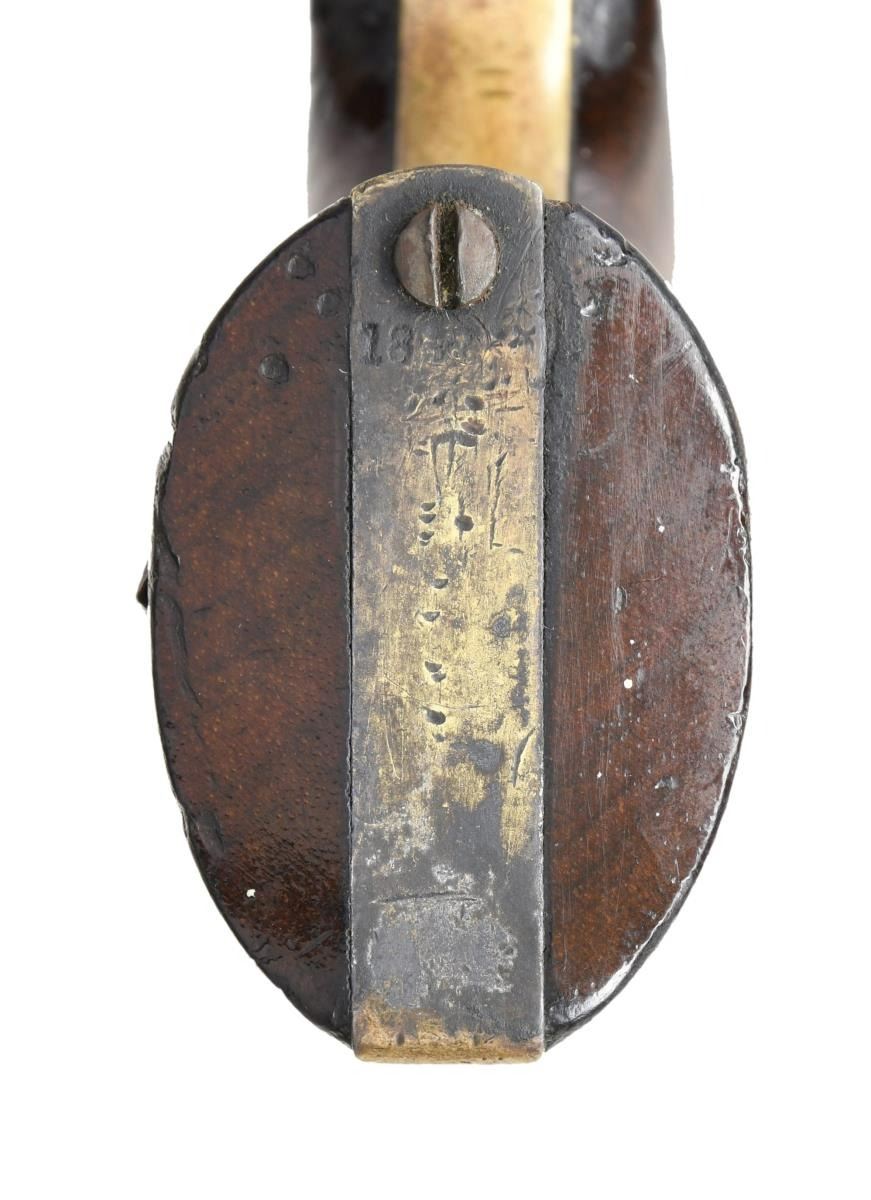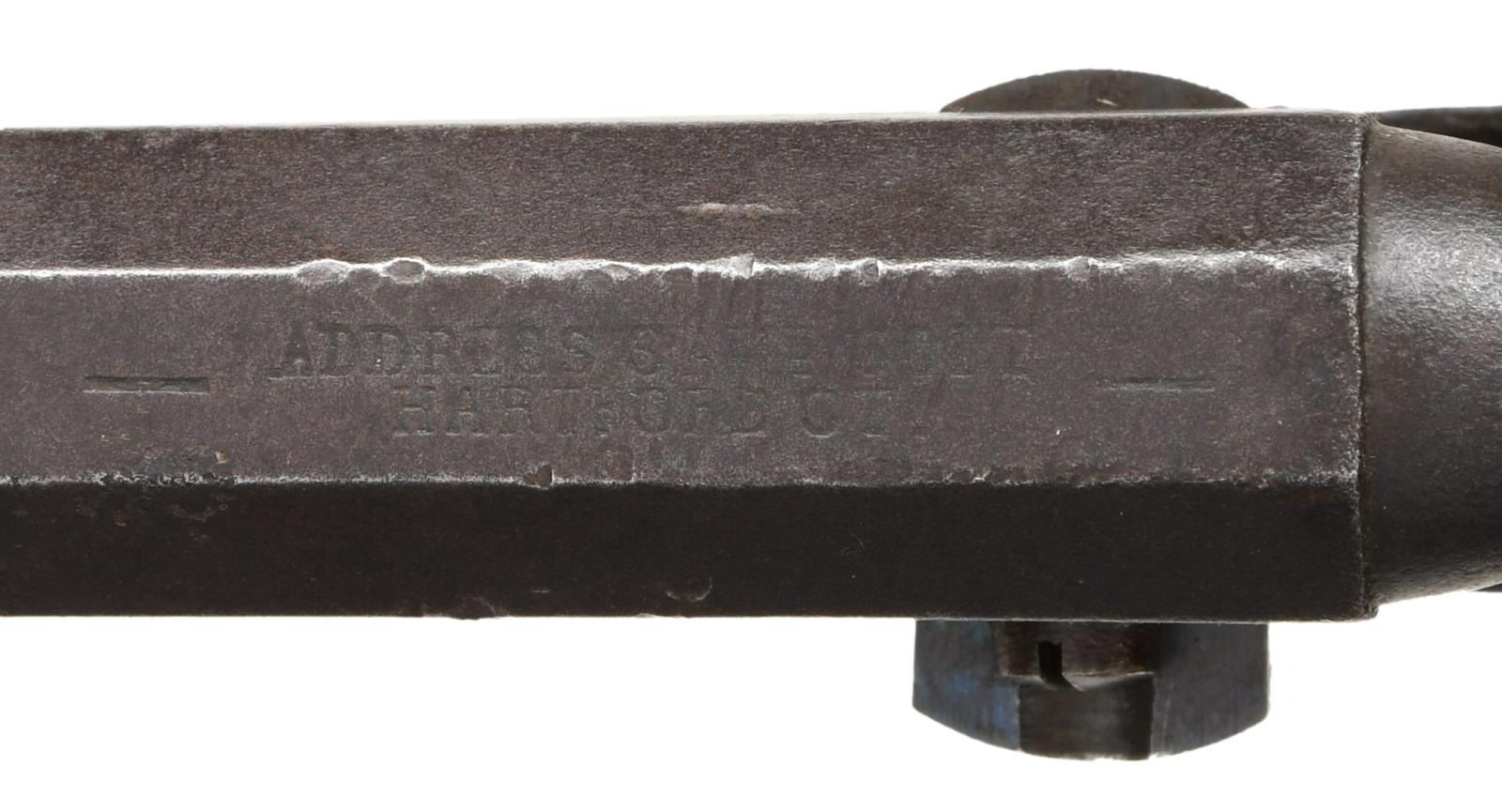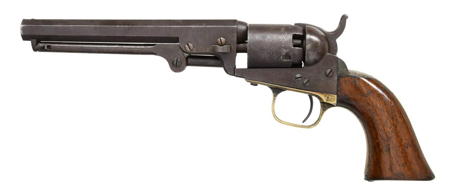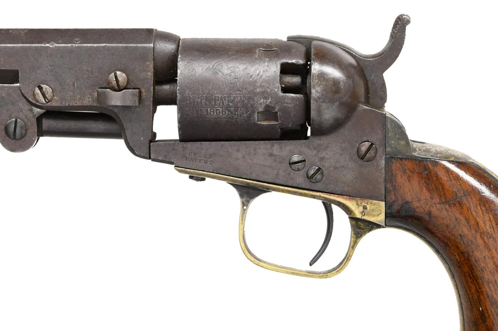 REVOLVER, "INSET SILVER STAR". Cal. 31. S# 180651. Made at the beginning of Civil War fervor late in 1860 or early 1861. The long 6" barrel revolvers were most popular among Southern soldiers and probably shipped South, no Colt factory records exist on this serial number unfortunately. Revolver has a 1.5" expertly inset silver star in the right grip panel that just says "Texas" to this cataloger. Otherwise, revolver is in standard configuration, blue and case color finish. 2-line Hartford address, small 2-line patent on the left side of frame, rolled "stagecoach holdup" scene on cylinder, 1-piece varnished walnut grips. CONDITION: very good overall, all matching & complete, wedge is not numbered, revolver retains strong traces of bright blue with balance plum/brown patina with scattered pitting, cylinder has mostly discernible rolled cylinder scene. Grips retain virtually all their original factory varnish undisturbed by the inset star. The bottom point of star is partially lifting, but still firmly attached. Grip strap retains about 25% tarnished silver plate. Mechanically fine with crisp rifled bore. (01-24035/JS). $1,000-3,000.