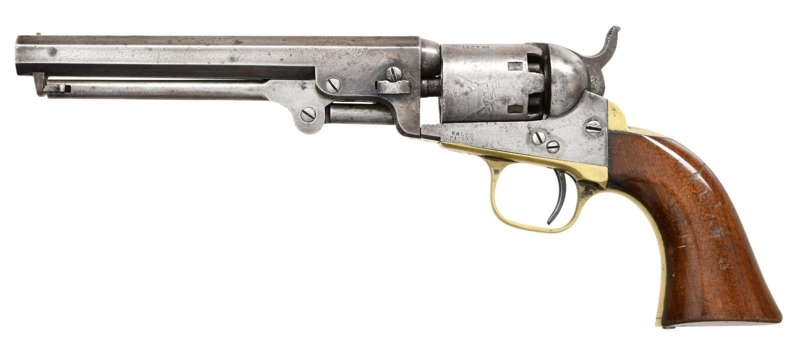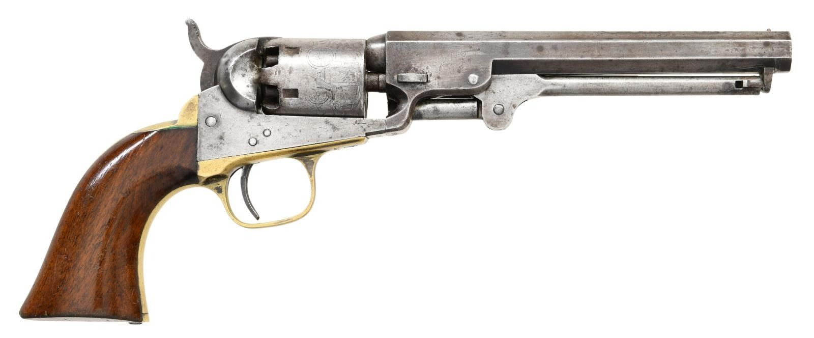 Cal. 31. S#. 195942. Bbl. 6" octagon with New York address. Round 6 shot cyl. has stagecoach scene roll engraving. silver finished brass backstrap & large round trigger guard. walnut 1 piece grip. 1861 mfg. CONDITION: Metal has faded to gray with scattered light pitting. Cyl. retains 70% scene. Brass shows traces of silver with a dark tarnish. Grip have original finish showing scratches & marks. Cyl exhibits a slight looseness. Lightly pitted bore has intact rifling. PROVENANCE: From the Lifelong Collection of Glen E. Mattox. (01-22583/DS). ANTIQUE. $800-1200