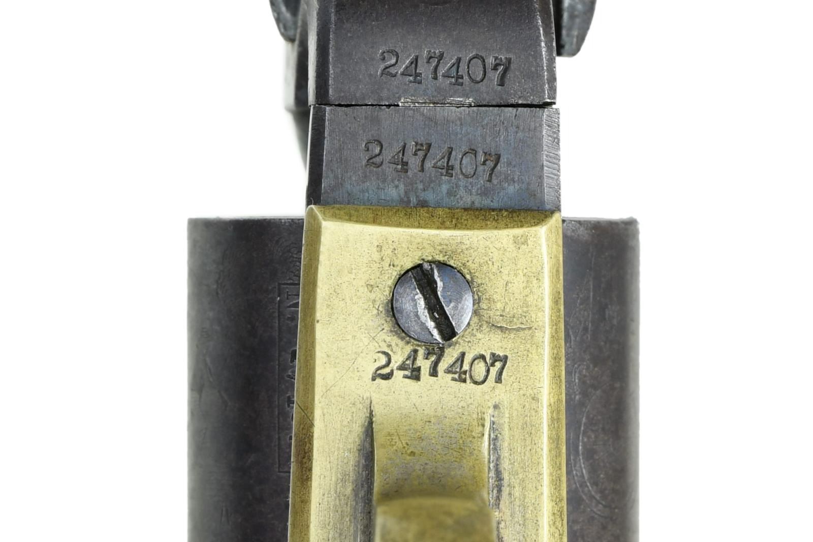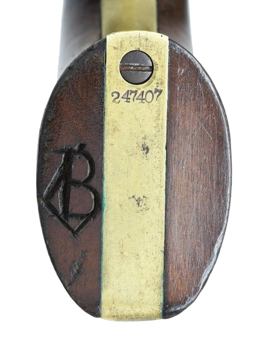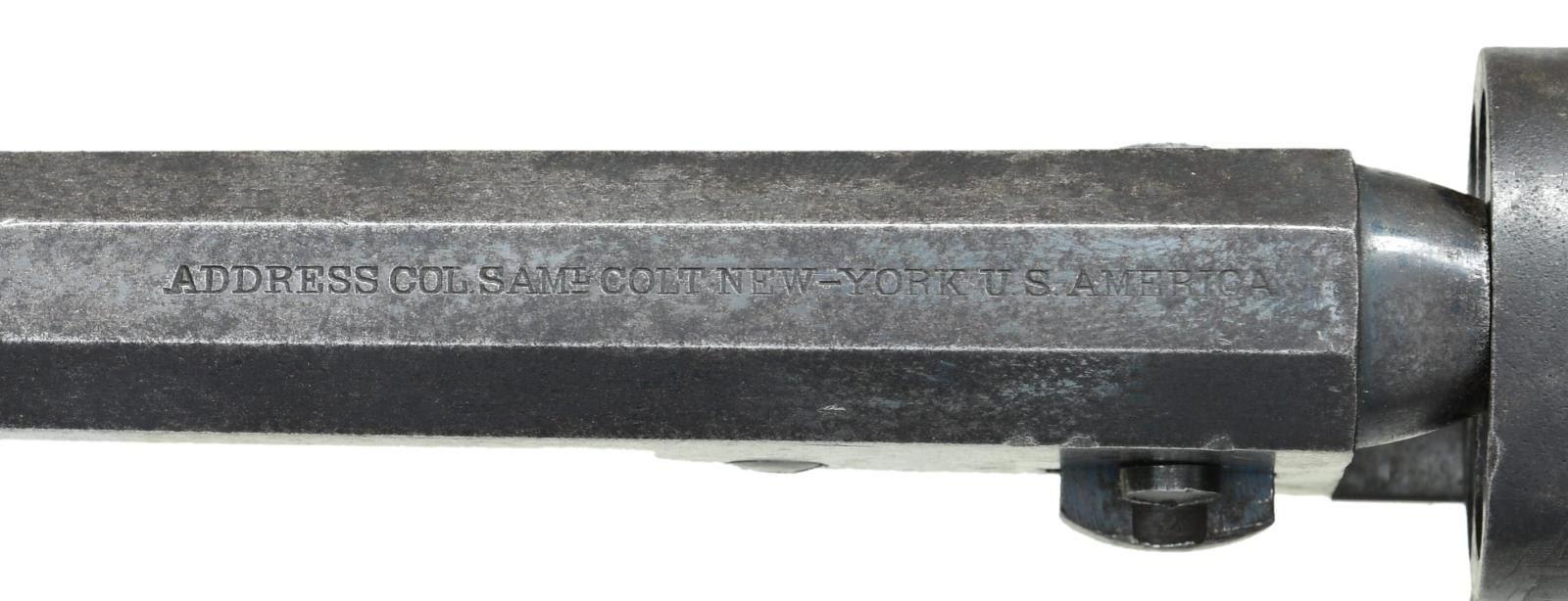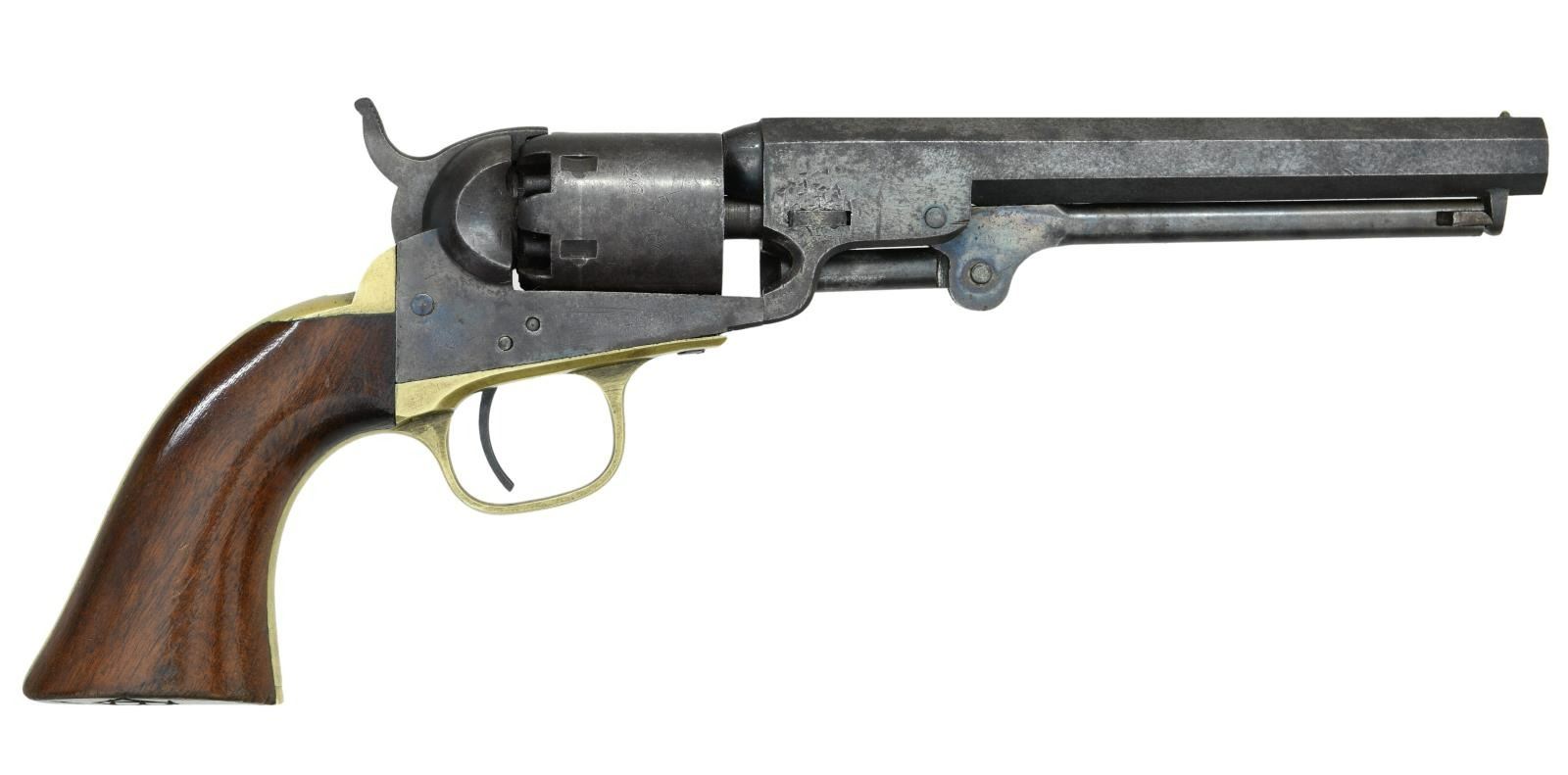Cal. 31. S# 247407. Bbl 6". Model 1849 single action revolver manufactured by Colt in 1863. New York address across the top of the barrel, with "COLTS/ PATENT" on the left side of the frame. Cylinder bears an engraved stage coach scene. Left side of grip exhibits a carved "LB" monogram, which is also present on the butt on the right side. Case color hardened frame and loading lever, with blued barrel, and brass grip straps. Frame is mounted with a 1 piece smooth wood grip. Matching numbers are present on the frame, cylinder, barrel wedge, barrel, trigger guard, and rear grip strap. CONDITION: Frame and loading lever retain areas of their case color hardened finish, with areas of mottled gray patina. Barrel retains traces of its blued finish, with the balance exhibiting a mottled gray patina that is also present on the cylinder. Mirror bore, exhibiting scattered areas of pitting and strong rifling throughout. Brass components exhibit a mellow patina overall. Grip shows some scattered marks from handling and storage, but is otherwise sturdy and serviceable. (01-23583/MLW). ANTIQUE. $600-900.