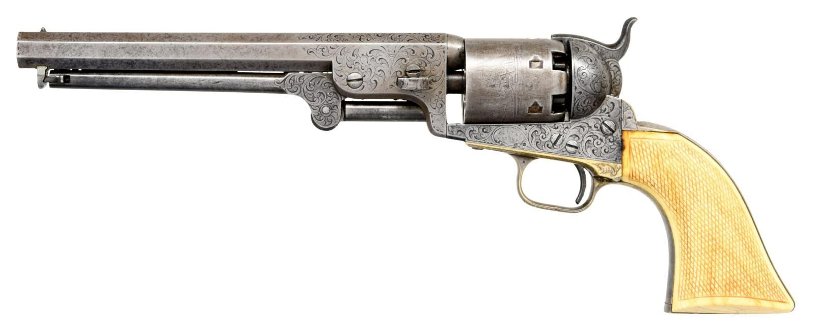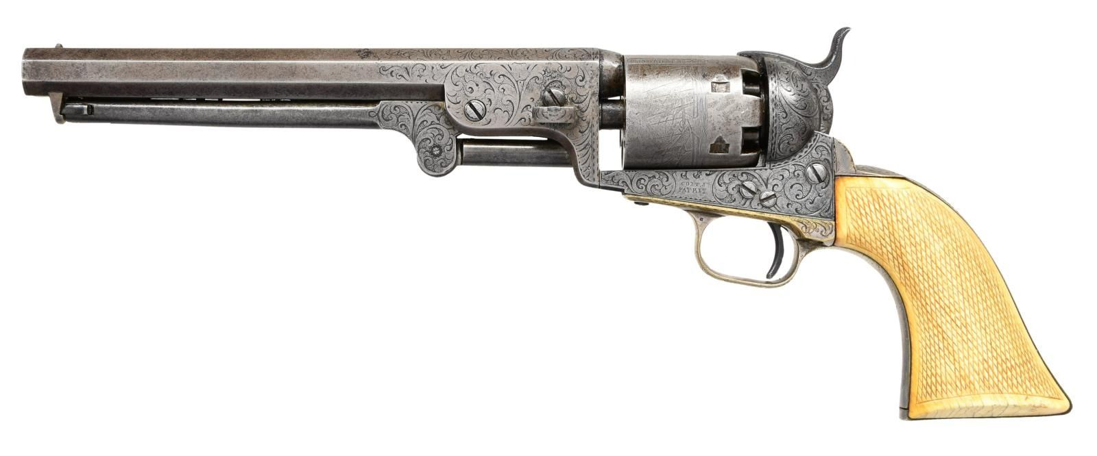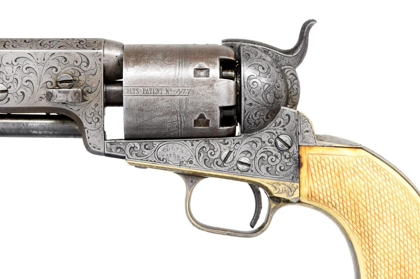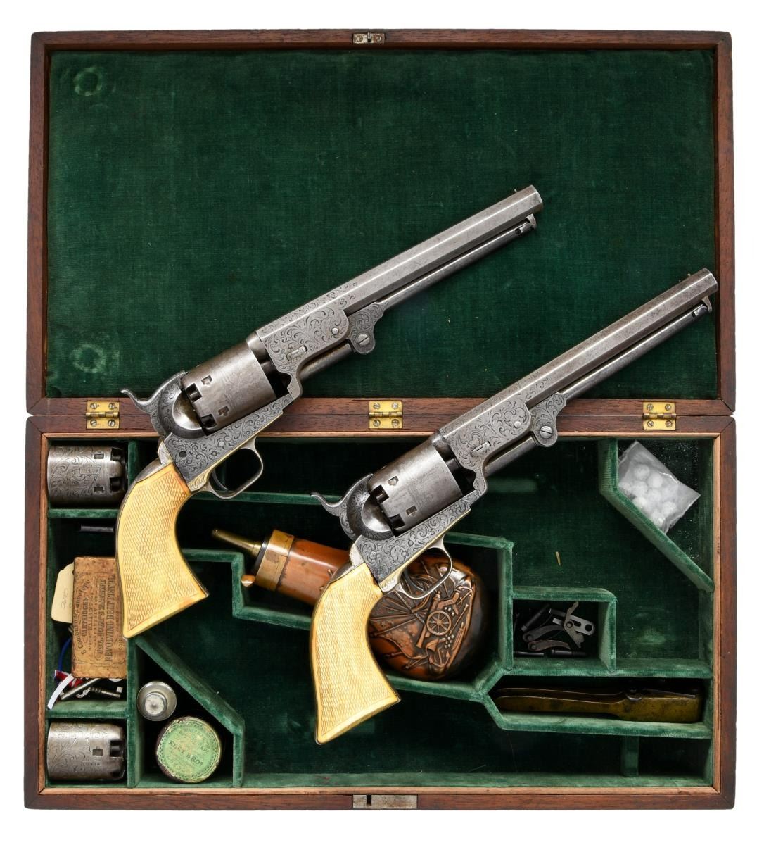 1851 NAVY REVOLVERS. Cal. 36. S# 19477/19488. Standard configuration, 7.5" octagonal barrels, brass pin front sights, stamped: "-- Address Saml. Colt New-York City –" with long dashes, blued 6-shot cylinders with Texas naval engagement rolled scene with last 3 digits of S# "477" & "488". Case-hardened frames, hammers, & loading assemblies, silver plated brass gripstraps. Left side of each frame engraved "COLTS / PATENT" in 2 different styles. Grips are checkered ivory. Revolvers are factory engraved en suite in an early scroll and punch dot pattern. Accompanying brass bound mahogany double case, lined in green velvet. "COLTS PATENT" 2-sided panoply of arms powder flask, brass double cavity "COLT'S PATENT" bullet mold, Eley Bros. percussion cap tin with green paper label, "Dixson" pewter oil bottle, sealed pack of 6 combustible cartridges, blued L-shaped screwdriver/nipple wrench combination tool, and functional case key. There are several extra internal components including hands, screws and hand spring. There are two additional cylinders fully engraved, with full engraved serial numbers matching revolvers. CONDITION: very good overall, both revolvers appear original and matching. Markings including engraving is all discernible, groups are well fit with light shrinkage and good patina with hairlines. Both cylinders 6 functional safety pins & discernible rolled "Texas Navy battle" scene. Both revolvers have good mechanics and crisp rifled bores. Added case it's very good as are components. PROVENANCE: David Palmiter 1998, Collection of Horst Kreiner. (01-23993/23994/JS). $25,000-35,000.