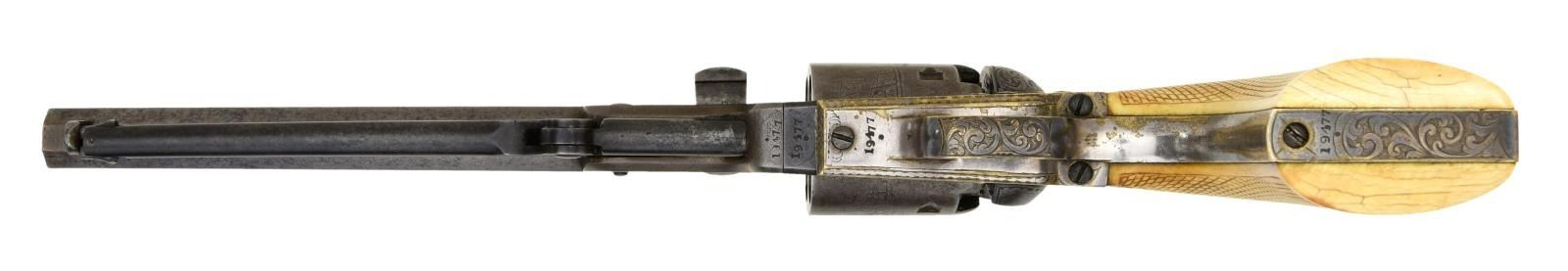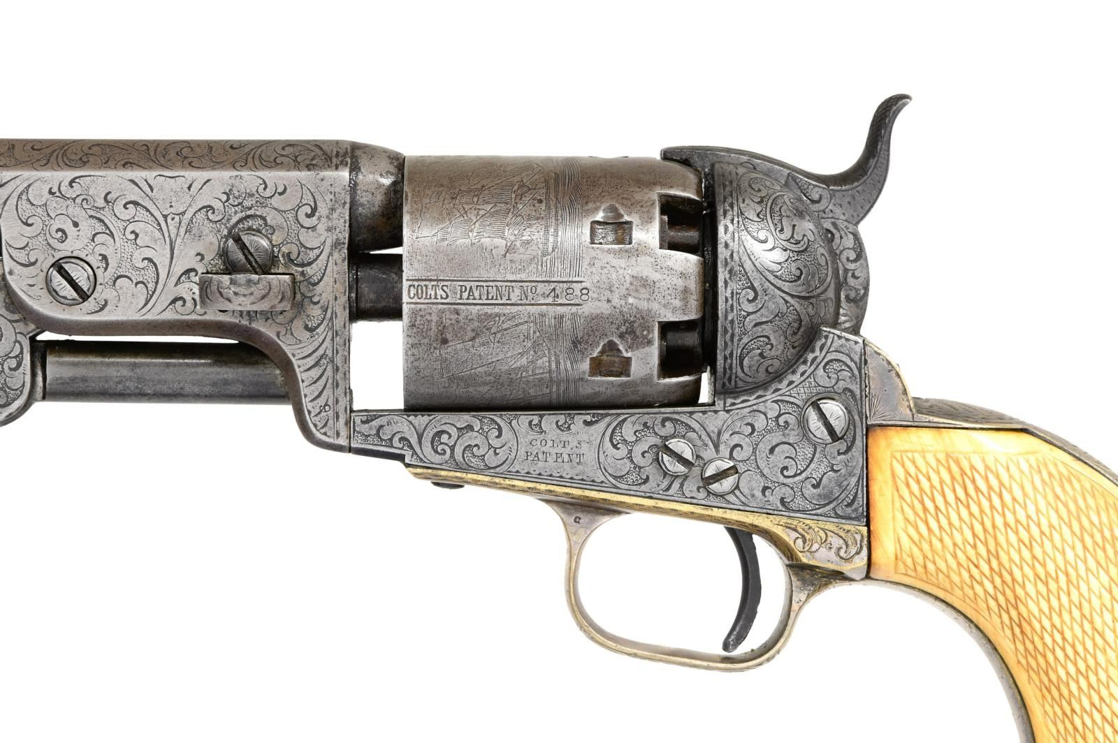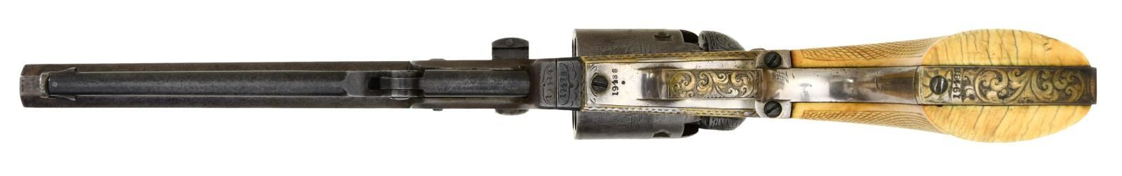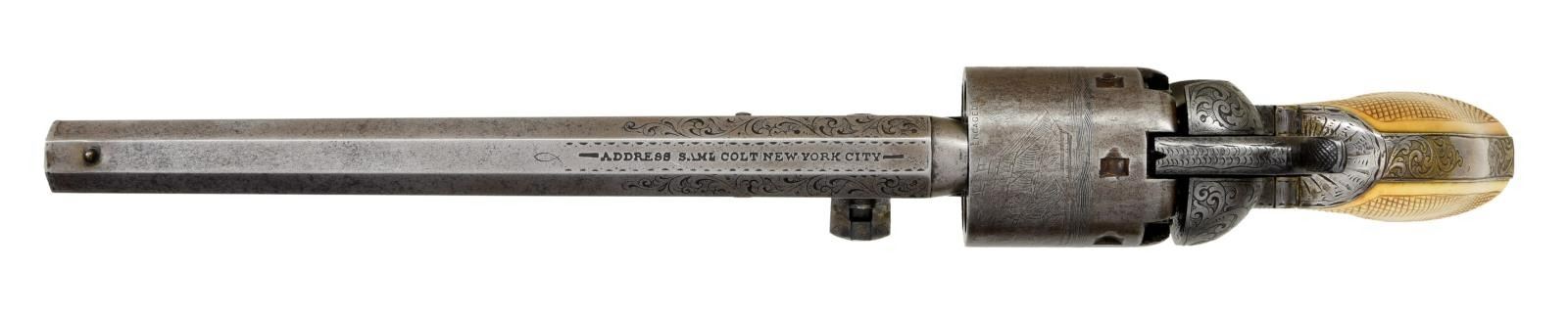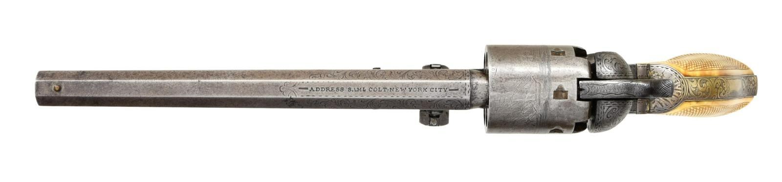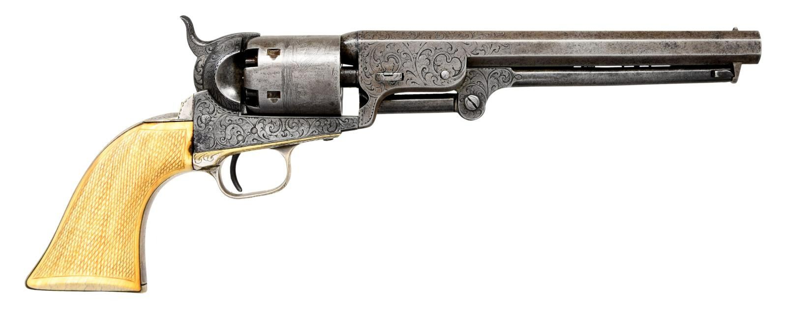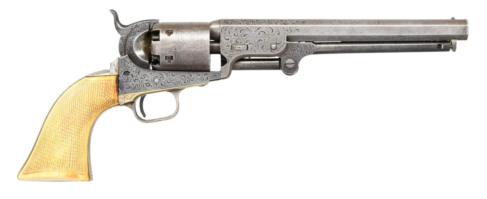 1851 NAVY REVOLVERS. Cal. 36. S# 19477/19488. Standard configuration, 7.5" octagonal barrels, brass pin front sights, stamped: "-- Address Saml. Colt New-York City –" with long dashes, blued 6-shot cylinders with Texas naval engagement rolled scene with last 3 digits of S# "477" & "488". Case-hardened frames, hammers, & loading assemblies, silver plated brass gripstraps. Left side of each frame engraved "COLTS / PATENT" in 2 different styles. Grips are checkered ivory. Revolvers are factory engraved en suite in an early scroll and punch dot pattern. Accompanying brass bound mahogany double case, lined in green velvet. "COLTS PATENT" 2-sided panoply of arms powder flask, brass double cavity "COLT'S PATENT" bullet mold, Eley Bros. percussion cap tin with green paper label, "Dixson" pewter oil bottle, sealed pack of 6 combustible cartridges, blued L-shaped screwdriver/nipple wrench combination tool, and functional case key. There are several extra internal components including hands, screws and hand spring. There are two additional cylinders fully engraved, with full engraved serial numbers matching revolvers. CONDITION: very good overall, both revolvers appear original and matching. Markings including engraving is all discernible, groups are well fit with light shrinkage and good patina with hairlines. Both cylinders 6 functional safety pins & discernible rolled "Texas Navy battle" scene. Both revolvers have good mechanics and crisp rifled bores. Added case it's very good as are components. PROVENANCE: David Palmiter 1998, Collection of Horst Kreiner. (01-23993/23994/JS). $25,000-35,000.