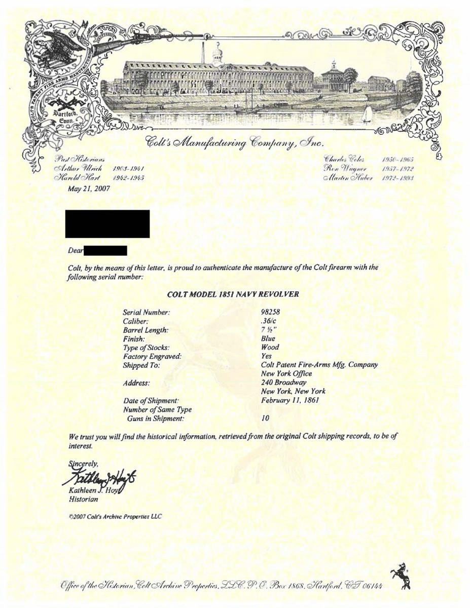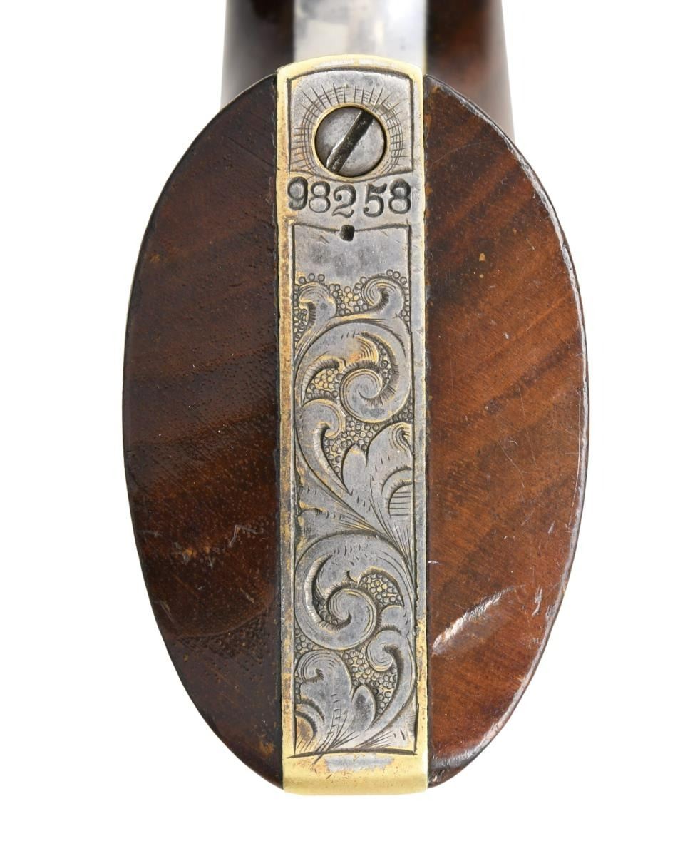 1851 NAVY REVOLVER WITH ENGRAVED "AMERICAN INDIAN WEARING WAR BONNET". Cal. 36. S# 98258. This is an exemplary factory engraved Colt Navy shipped to Colts New York office February 11, 1861. Factory letter confirms configuration, factory engraved with blue finish. Revolver has survived in beautiful condition retaining most of its original finish. Engraving & special finish is noted by a punch dot under each serial number dating from the early years of the Gustave Young shop. The frame and barrel housing are fully covered with Gustave Young trademark scrolls terminating in four petaled flowers with punch dot backgrounds. There are a handful of revolvers in this serial range which have large figural terminations to the front scroll on barrel housing. In this case it is a unique Indian wearing a feathered bonnet. The late Larry Wilson features this revolver in both of his excellent Colt engraving books and this is probably the only example known. Wilson states: "the Indian head motif is a rarity". Revolver is in standard configuration of 4th model navies, 7.5" octagonal barrel, large trigger guard, one line Hartford address, blue and case color finish. Deluxe engraving, fire blue inset front sight with small German silver blade is another upgraded feature as is the fancy burled walnut grips with high gloss varnish. "COLTS PATENT" is engraved on the left side of frame, Ormsby Texas Naval Battle scene on cylinder, grip frame is silver plated. UNACCOMPANIED ACCESSORIES: Colt Factory letter. CONDITION: Very fine, all matching SNs including wedge & grip. Revolver retains about 60% bright factory blue on barrel & 10-20% on cylinder. Frame, loading assembly, and hammer are overall silver patina with traces of case color, back strap and trigger guard retain about 90% original silver plate. Grips retain virtually all their original bright factory varnish with light edge wear & minor scratches. Mechanically fine with shiny rifled bore with small patches of light pitting. PROVENANCE: S.P. Stevens Collection 1970. (01-24185/JS). $20,000-30,000.