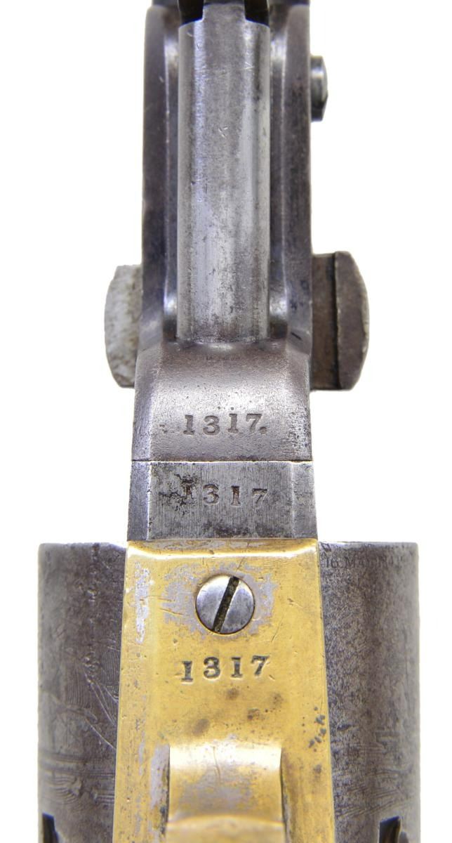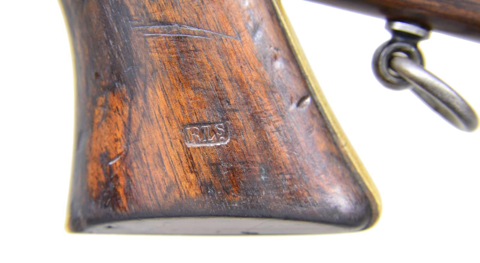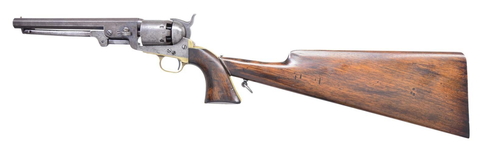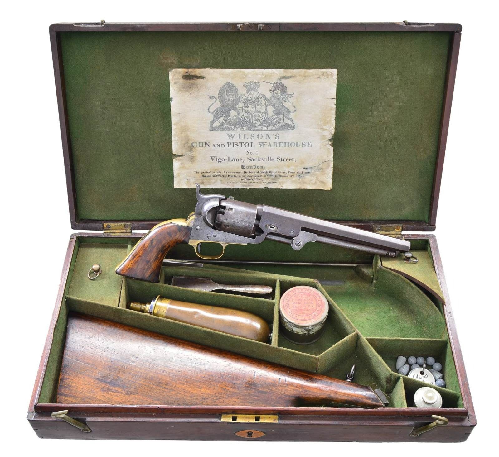 STOCK. Cal. 36. S# 1317. Bbl. 7 1/2" octagon w/ London address. Six shot round cyl. w/ naval scene roll engraving. Left bbl. flat & cyl. have British proofs. Brass trigger guard & backstrap w/ slot for shoulder stock attachment. 1 Piece walnut grip. Both grip panels have "RLs" stamped in cartouche. Bbl., frame, grip straps, cyl. & loading lever have matching numbers. Wedge is unnumbered. Wood stock has unnumbered iron yoke w/ ring type swivel on bottom. Stock has same "RLs" cartouche on left side of wrist. UNATTACHED ACCESSORIES: wood trade casing w/ folding handle & circular medallion on lid. Inside of lid label is marked "WILSON'S/GUN and PISTOL WAREHOUSE/ No. 1,/Vigo-Lane, Sackville-Street,-London.". Case contains powder flask, slotted tip ramrod, nipple wrench, oil bottle, cap tin, functioning case key, round balls & bullets, six round package of combustible envelope cartridges. CONDITION: metal has faded to a mottled gray brown showing spots of light pitting w/ series of dents on right side around wedge. Cyl. retains 50% scene showing small dents & scratches. Grip straps show evidence of past cleaning & have practically no remaining silver. Grips show heavy wear w/ dents & handling marks. Sound mechanics. Bore retains sound rifling w/ scattered pitting. Shoulder stock has good finish showing scattered dents, scratches & marks. (01-22841/JSB). ANTIQUE. $5,000-8,000.