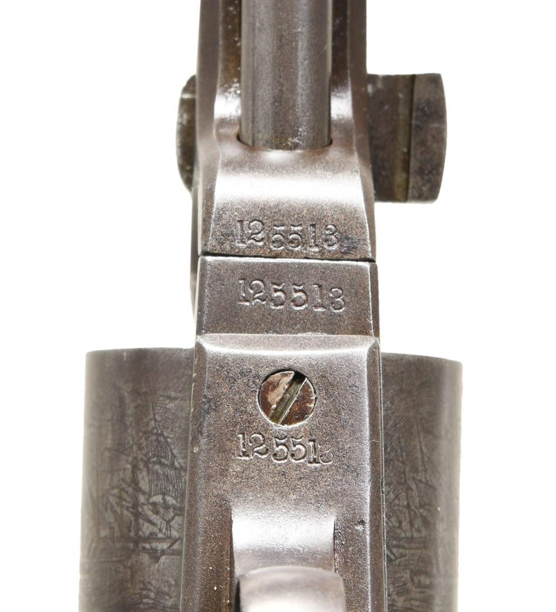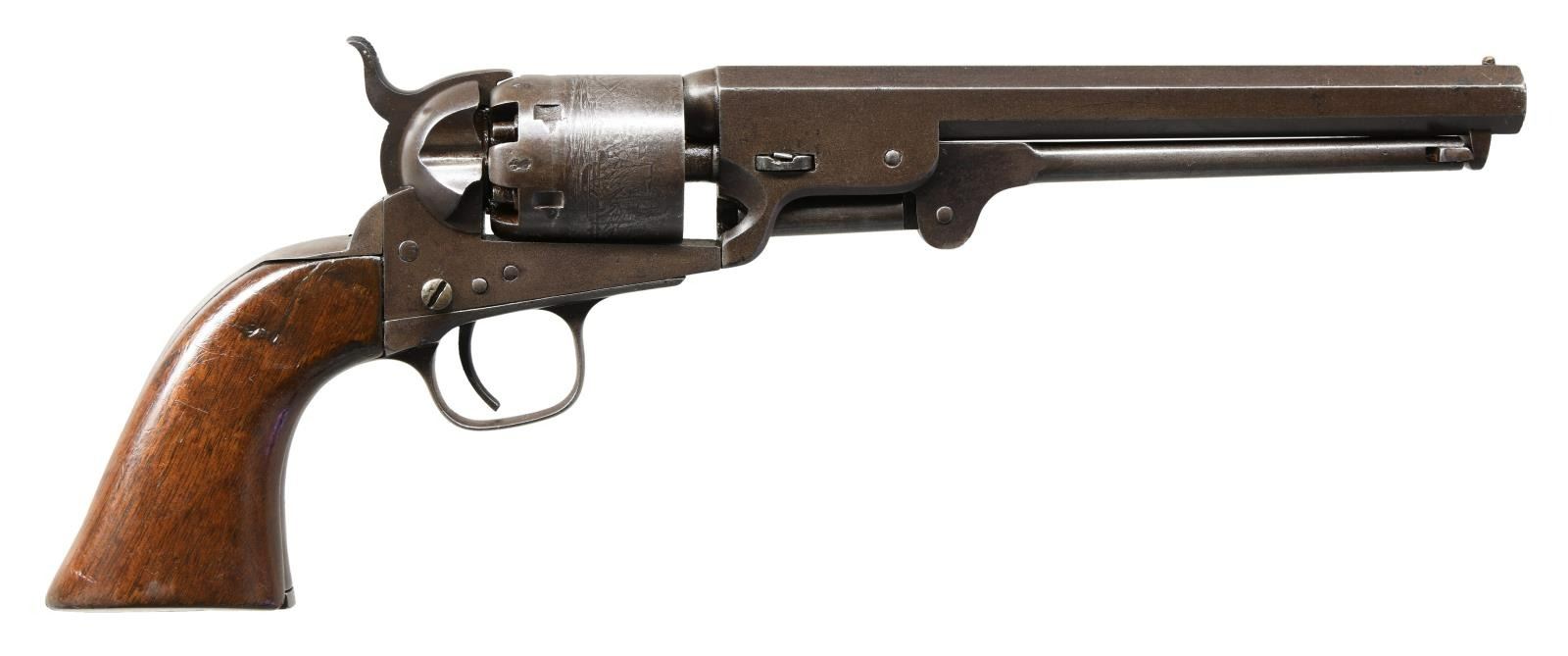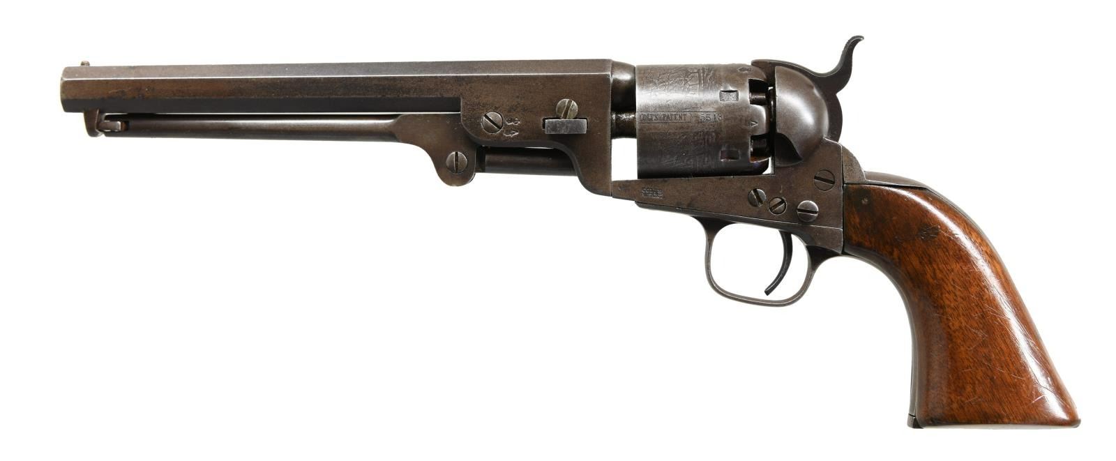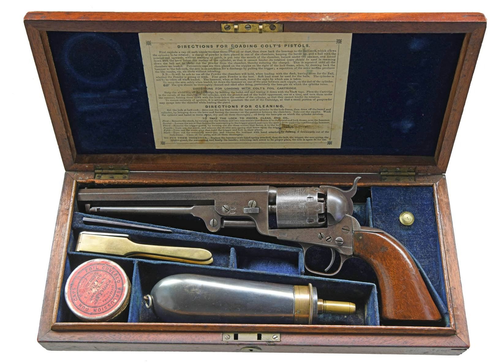 MODEL 1851 NAVY REVOLVER. Cal. 36. S# 125513. Standard configuration, 7.5" octagonal barrel with one line New York address, London proofs on the left side of barrel housing and on cylinder. Revolver manufactured in 1862 during height of American Civil War. English mahogany casing, vacant brass plaque on the lid, blue baize lining, compartmented for revolver, 2 cavity "Colts Patent" bullet mold, scarce "Colt's Navy Flask" stamped Dixon bag flask, large red label Ely cap tin, combination tool, & steel cleaning rod. CONDITION: very good overall, metal is overall plum with traces of original blue in protected areas, markings all easily discerned, all matching. Cylinder retains all six crisp safety pins and very good rolled Texas naval battle scene. Grips are refinished with chips at inside toes. Mechanically fine, crisp rifle bore with areas of pitting. Casing and accessories are very good, the "Colts Patent" brass two cavity mold is a reproduction. PROVENANCE: Collection of Horst Kreiner. (01-23997/JS). $6,000-8,000.