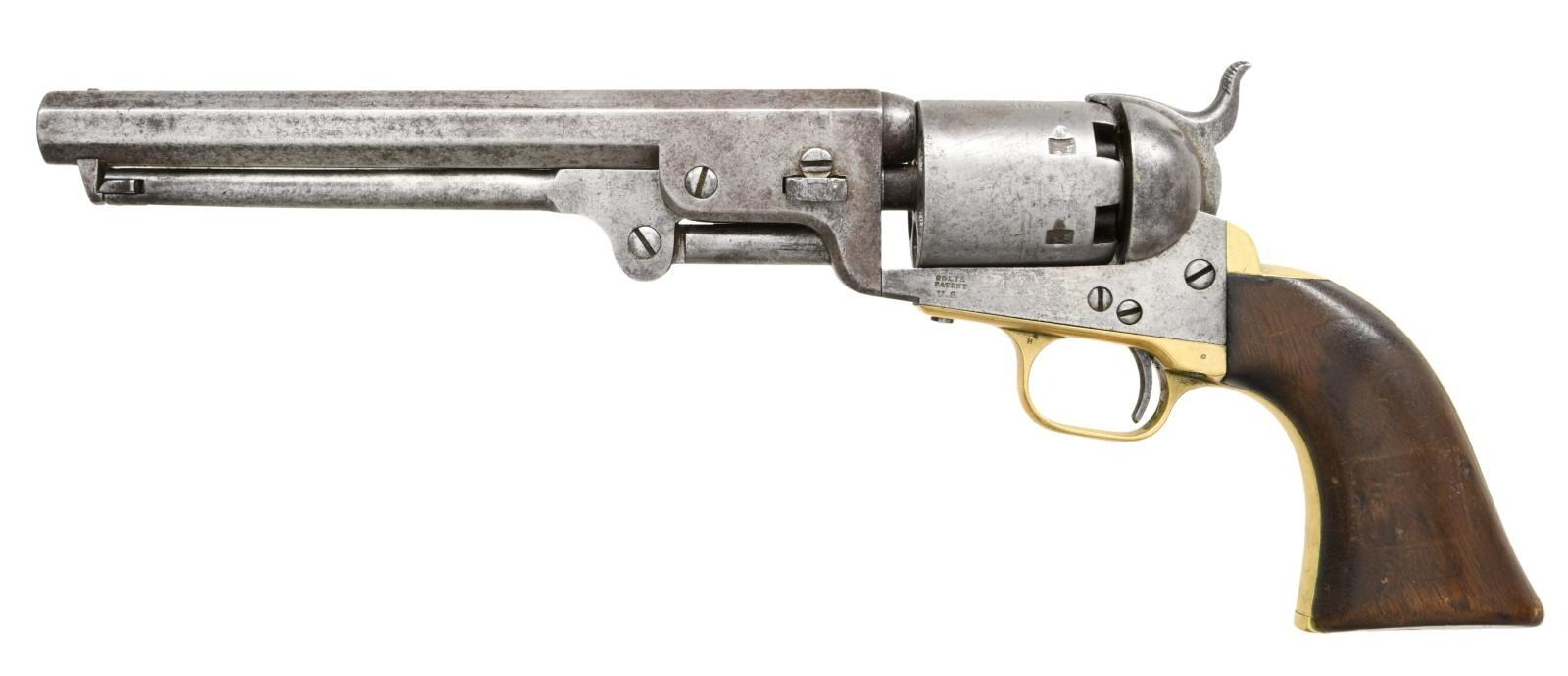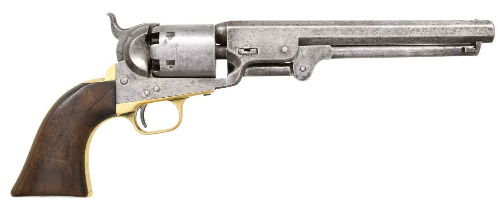 Cal. 36. S# 41406. Bbl. 7 1/2" octagon with bead sight. Round 6 shot cyl. has naval engagement scene roll engraving. Brass backstrap & small round trigger guard. walnut 1 piece grip. Left side of frame is stamped "U. S." 1855 mfg. CONDITION: Metal has faded to gray showing light pitting. 50% light cyl. scene. Brass is cleaned bright. Refinished grips show heavy wear & marks. Functioning action exhibits cyl. play. Pitted bore retains intact rifling. PROVENANCE: From the Lifelong Collection of Glen E. Mattox. (01-22383/DS). ANTIQUE. $1200-1800.