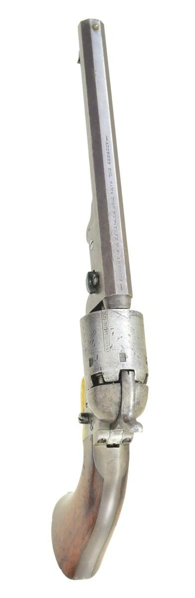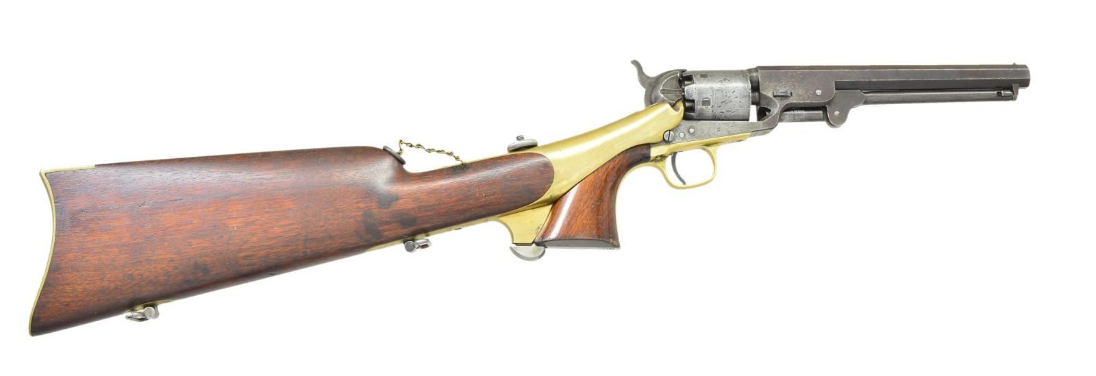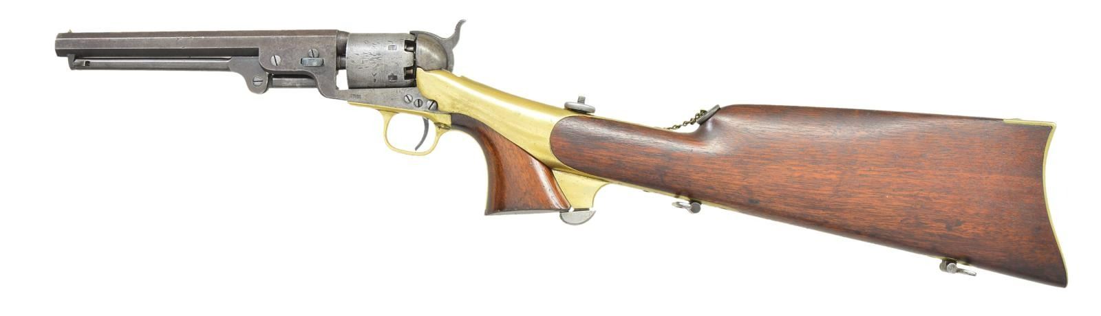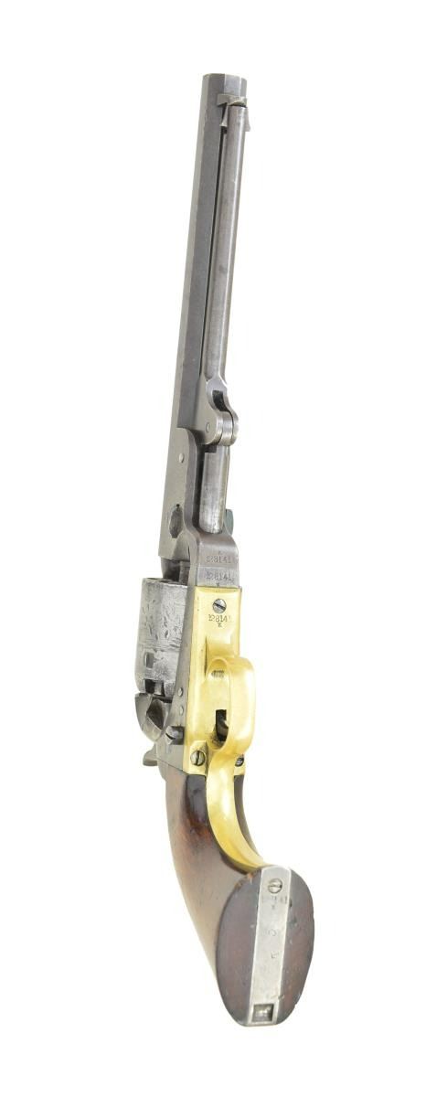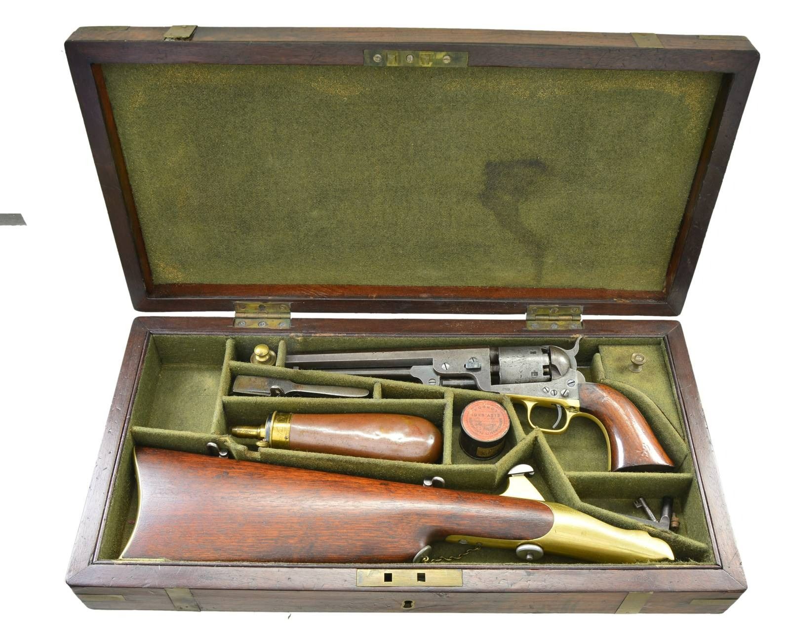 STOCK. Cal. 36. S# 128141. Bbl. 7 1/2" octagon w/ New York address & cone style sight. Round six shot cyl. w/ naval engagement scene roll engraving. Blue & case colored finish w/ silver finished brass trigger guard and iron Hartford style back strap usually found on stocked Navies in 128,000 serial range. 1 piece walnut grip. Bbl., frame, grip straps, cyl., loading lever, & wedge have matching numbers. Inspector's initial "K" is found above or below the S# on major parts. Mfg. 1862 during the American Civil War. Canteen shoulder stock w/ brass yoke & buttplate have 2 sets of S#s; 80153 and below 128144 with small "K" like on revolver. Steel cap is attached w/ brass chain. Front sling swivel is located on lower tang. Inletted rear swivel is held by 2 screws. Pistol & stock held in a fancy English walnut period style case w/ brass trim & fittings. Case contains bag flask, 2 cavity Colt's Patent mold, nipple wrench, brass oil bottle, slotted tip ramrod, cap tin, functioning case key, round balls & bullets. Also included are three open partial packages of combustible envelope cartridges. CONDITION: metal has a brown/gray patina with strong traces of blue and case colors in protected areas, numerous dents in wedge area & on cyl. Cyl. scene is partially visible. Brass trigger guard and yoke retain traces of silver. Grips retain most of their factory varnish. Stock brass is polished bright, wood refinished with traces of varnish. Sound action. Dark lightly pitted bore retains good rifling. (01-22839/JSB). ANTIQUE. $3,000-4,000.