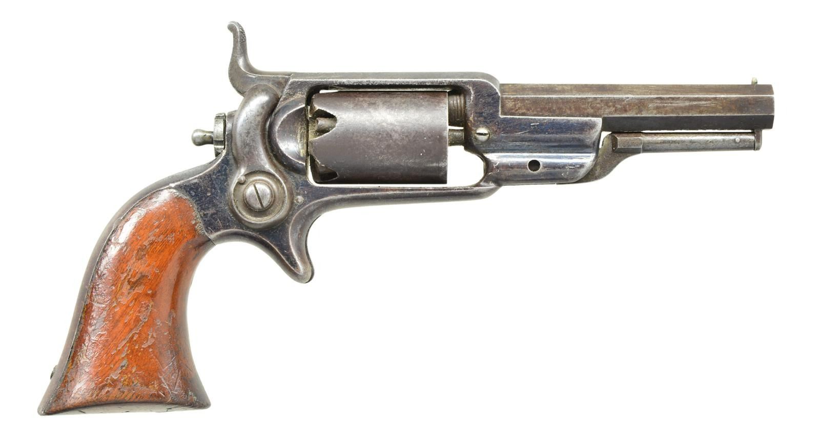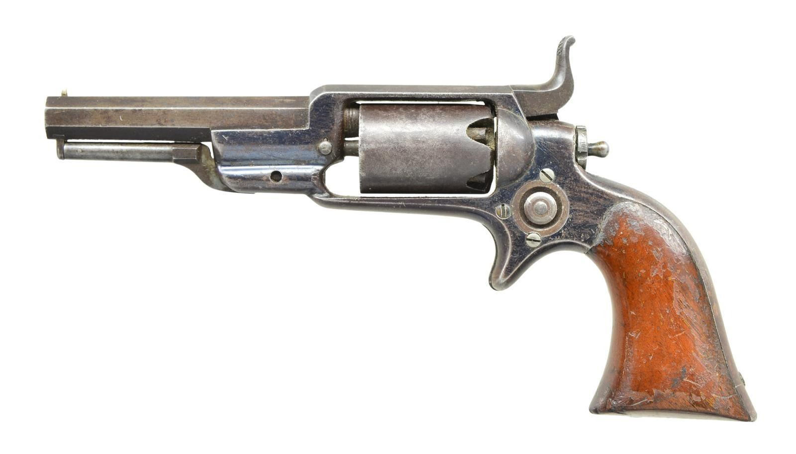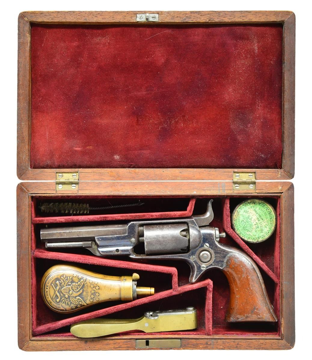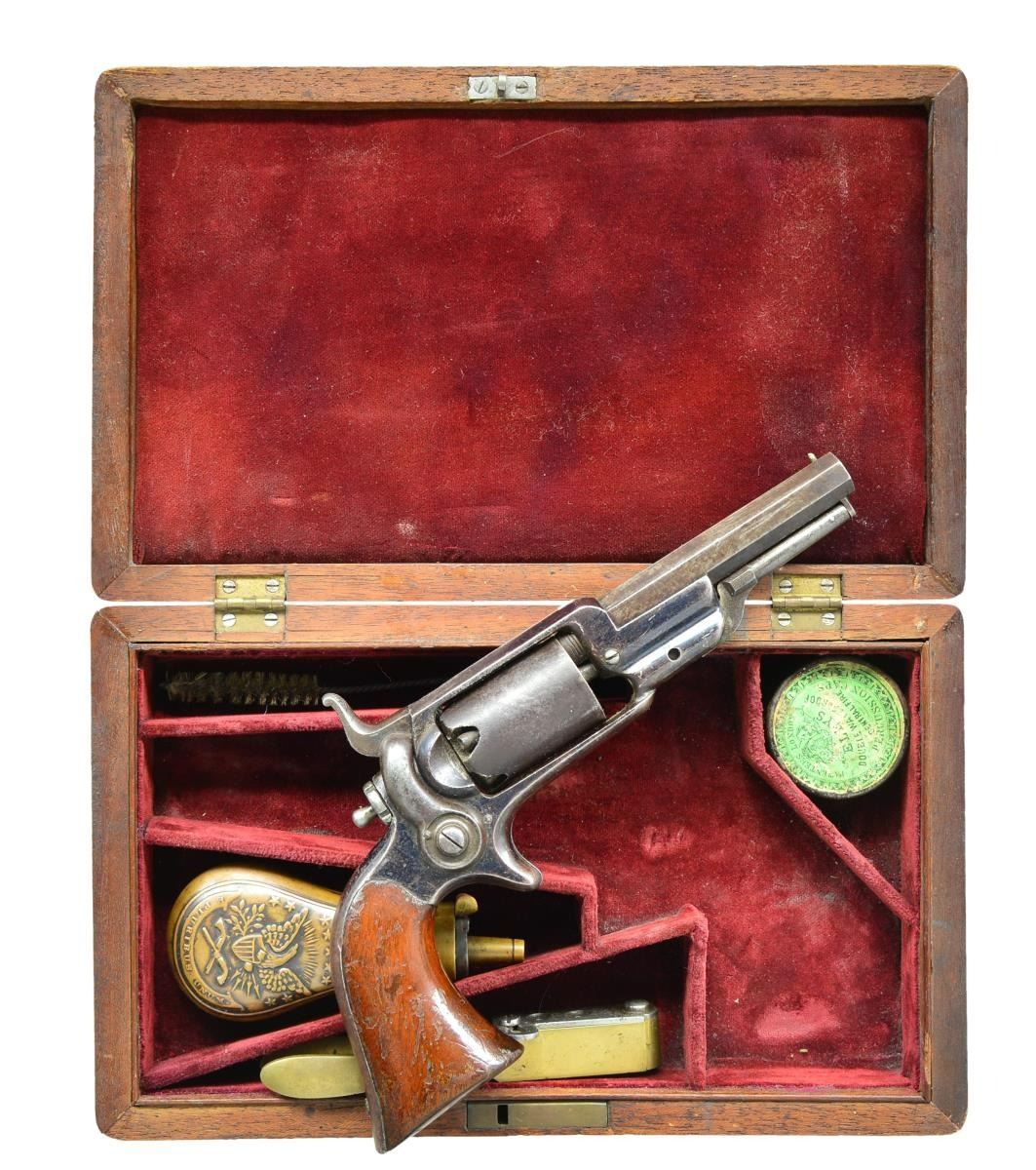 REVOLVER. Cal. 28. S# 4056. Bbl. 3 1/2" octagon. Top flat has pointing hand motif & Hartford address. Cone style brass cyl. Round five shot cyl. has cabin & Indian scene roll engraving. Blue finish. 1 piece walnut grip. Mfg. 1855. UNATTACHED ACCESSORIES: period style wood casing w/ burgundy cloth fitted interior. Case contains pocket sized eagle flask, 2 cavity brass mold, cleaning brush & cap tin. CONDITION: 40% dull blue blending w/ areas of brown patina. Cyl. has weakly visible scene. Grips have blistered & peeling finish w/ small cracks & chips at butt. Action shows light wear. Cyl. exhibits some side play. Dark bore retains sound rifling. (01-22842/DS). ANTIQUE. $3,000-5,000.