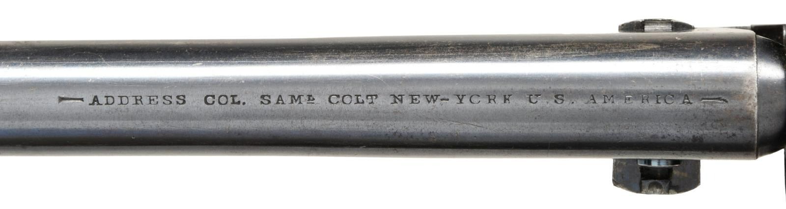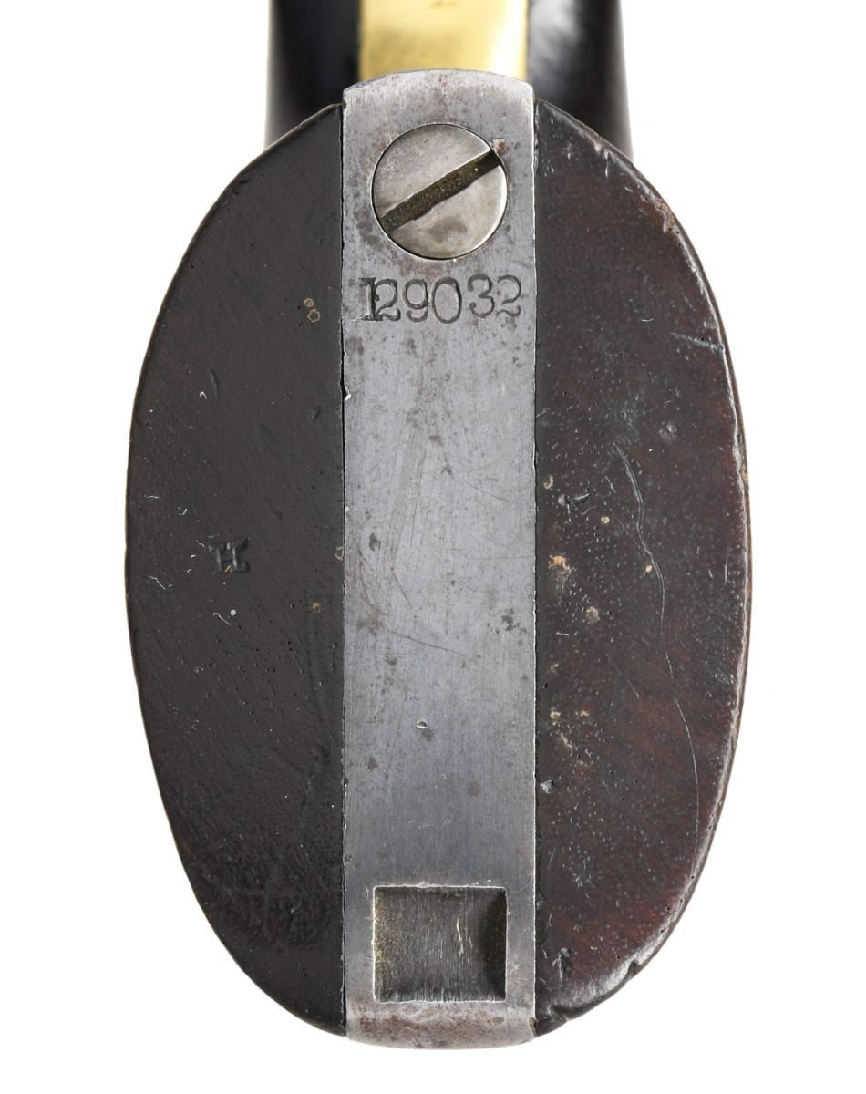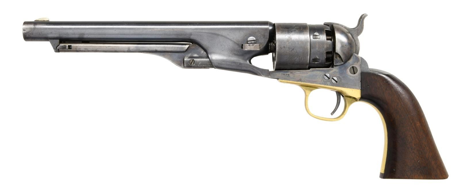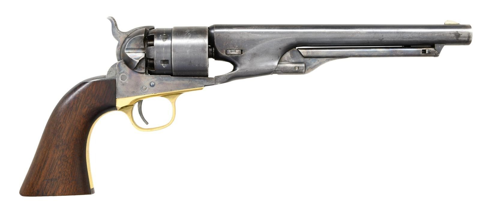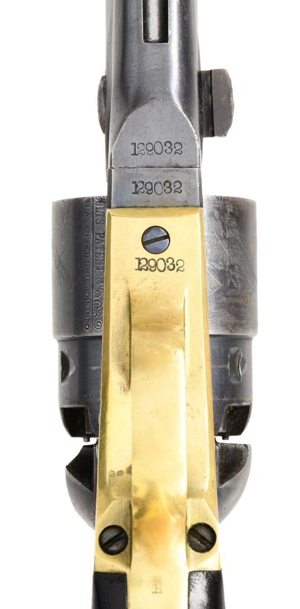Cal. 44. S# 129032. Bbl. 8" round w/ gain twist rifling & German silver blade sight. Round rebated six shot cyl. w/ naval engagement scene roll engraving. Blue finish w/ case colored frame, loading lever & hammer. Brass trigger guard. 1 piece walnut grip has lightly visible cartouches on both panels. Bottom of grip is stamped w/ inspector's mark "H". Inspector's marks D or E are found on other major components. Mfg. 1863 during the American Civil War. CONDITION: very good. Bbl., cyl. & backstrap retain 60% dull lightly worn blue showing edge & carry wear w/ scattered marks. Frame & hammer retain 70% lightly faded case colors. Loading lever has visible case colors in protected areas. Brass trigger guard retains faint traces of original silver finish. Grips show light wear w/ scattered marks. Smooth action. Bore is generally bright w/ sound rifling showing small spots. (01-24187/DS). ANTIQUE. $4000-6000.