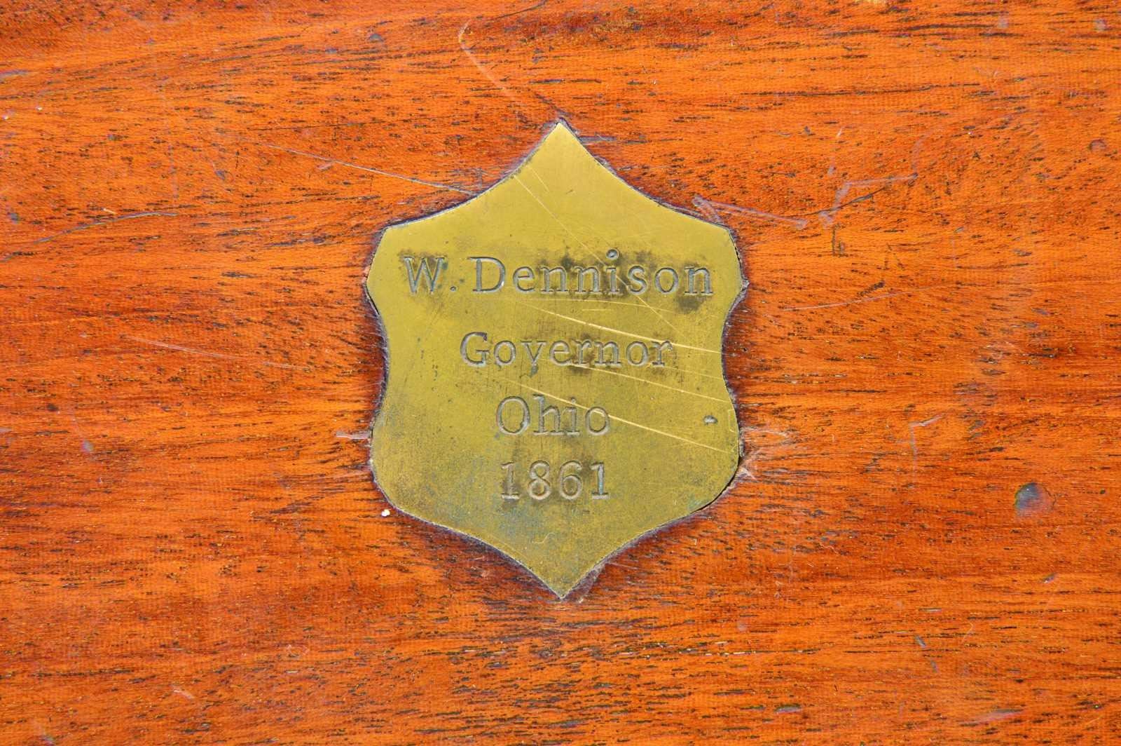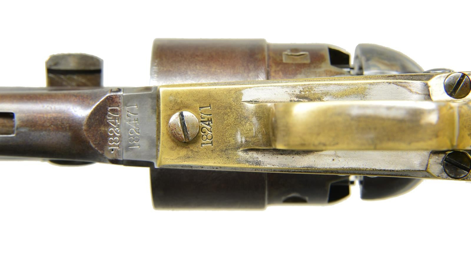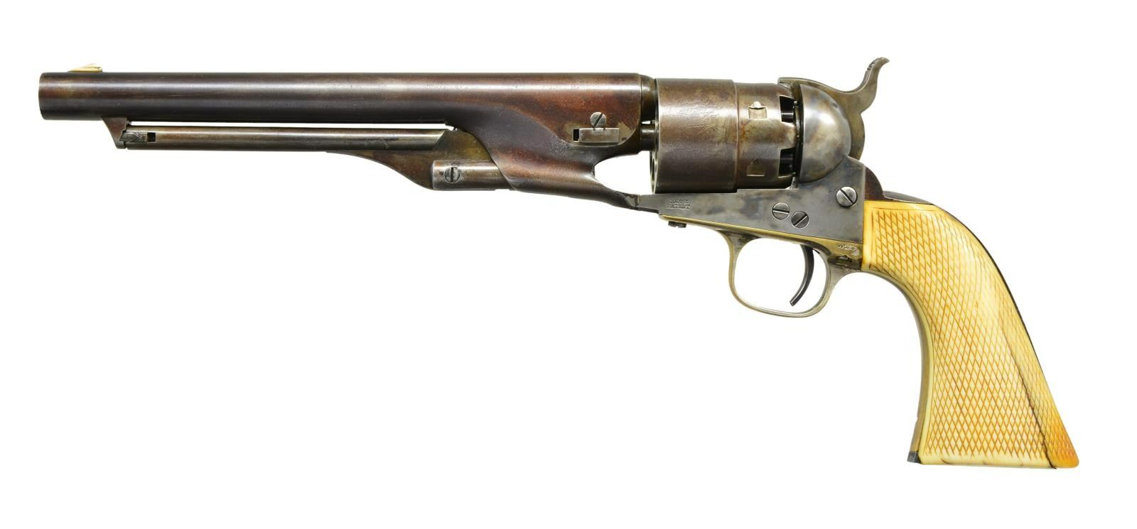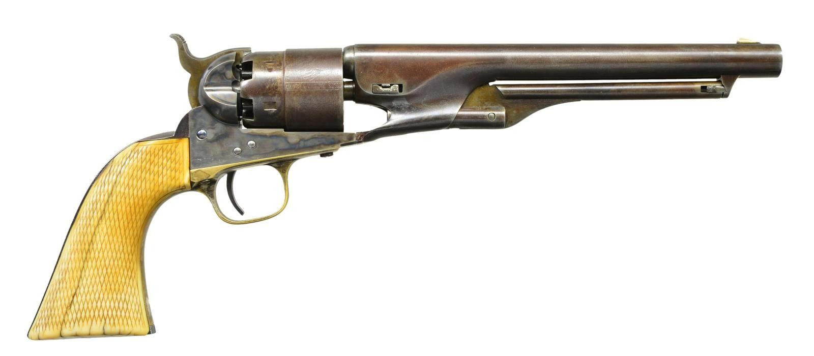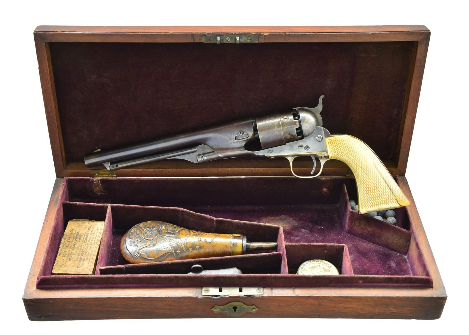 GRIPS. Cal. 44. S# 182471. Bbl. 8" round w/ New York address & German silver blade sight. Round rebated six shot cyl. has naval engagement scene roll engraving. Blue & case colored finish w/ silver finished brass trigger guard. Bbl., frame, grip straps, cyl. & wedge have matching numbers. 1 piece Ivory grips w/ coarse hand checkering. Mfg. 1869. UNATTACHED ACCESSORIES: period style casing that may be added to the gun. Brass shield on lid is marked "W. Dennison Governor Ohio 1861". William Dennison Jr. (1815-1882) served as Postmaster General under Abraham Lincoln & was the 24th Governor of Ohio. Burgundy cloth fitted interior showing light fading & wear w/ tear spots. Case contains a patriotic themed eagle flask, 2 cavity mold, cap tin, bullet, round balls & spare main spring. Also included is an open six round package of seamless skin cartridges by D.C. Sage & Co. CONDITION: very good. Blued parts are fading to a even brown patina. Cyl. retains very good scene. Frame shows over 50% lightly faded case colors. Grips show substantial checkering wear w/ grain checks. Left panel is chipped at toe w/ long crack adjacent to backstrap. Sound mechanics. Lightly pitted bore retains sound rifling. (01-22826/DS). ANTIQUE. $3,000-5,000.