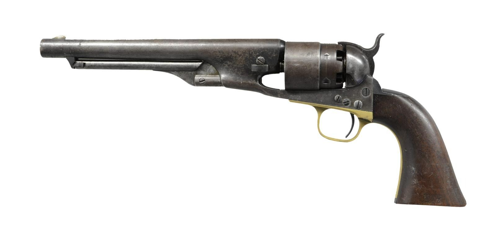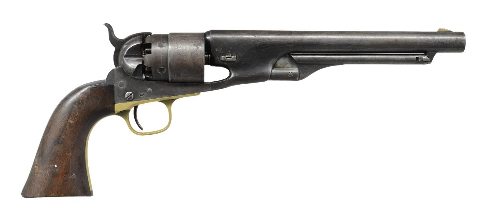 Cal. 44. S#. 13339. Bbl. 8" round with New York address & German silver blade sight. Round rebated 6 shot cyl. has naval engagement scene roll engraving. 4 screw action has provision for shoulder stock attachment. Blue & case colored finish with silver finished brass trigger guard. 1 piece walnut grip with partially legible cartouche on left panel. Inspector initials "T" are found on the bbl. & trigger guard. Bbl., frame grip straps, cyl. & wedge have matching numbers. 1861 mfg. CONDITON: Bbl retains 25% dull blue fading to gray with scattered pitting. Cyl. has lightly visible scene. Frame shows 20% fading case color on sides. Brass trigger guard is cleaned bright with only traces of silver. Grips show moderate wear with small handling marks. Action has strong spring tension. Bore retains sound rifling shows spots of pitting near the muzzle. PROVENANCE: From the Lifelong Collection of Glen E. Mattox. (01-22379/DS). ANTIQUE. $2000-3000.