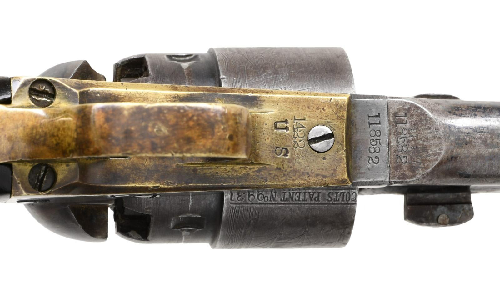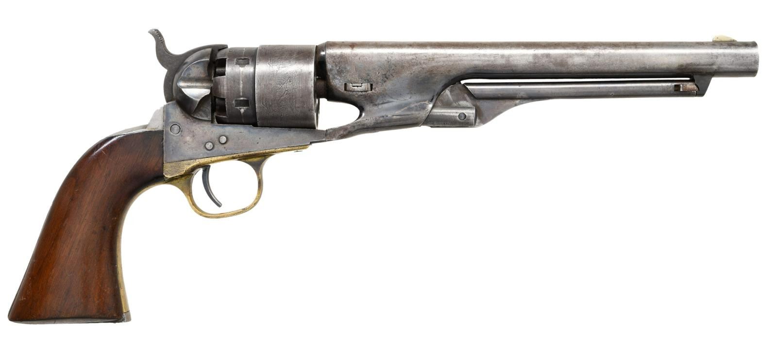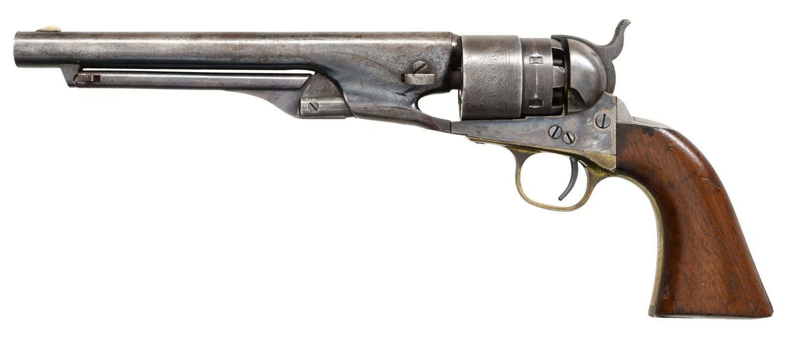 Cal.44. S#. 118582. Bbl. 8" round with German silver blade sight. Round, rebated 6 shot cyl. has naval engagement scene roll engraving. 3 screw action with provisions for shoulder stock attachment. Blue & case colored finish with brass trigger guard. Consignor supplied info. states "Benicia Arsenal rebuild" with possible Buffalo Soldier use. Benicia CA. Arsenal was the primary U.S. Army Ordnance west coast arsenal, 1851-1964. Frame & bbl. are S# 118532, trigger guard is S# 14228, backstrap is S# 95980, cyl is S# 9931, & wedge is S# 4390. Trigger guard is marked "US" below S#. Cyl has inspector initials "D" with "E" on the bbl. Walnut 1 piece grip. CONDITION: Fine as rebuilt. Bbl. has over 50% blue. Cyl has fading blue over good scene. Frame retains over 60% case colors. Refinished grips show dents & marks. Smooth action. bbl. has spots of deep pitting with largely intact rifling. PROVENANCE: From the Lifelong Collection of Glen E. Mattox. (01-22377/DS). ANTIQUE. $2000-3000.