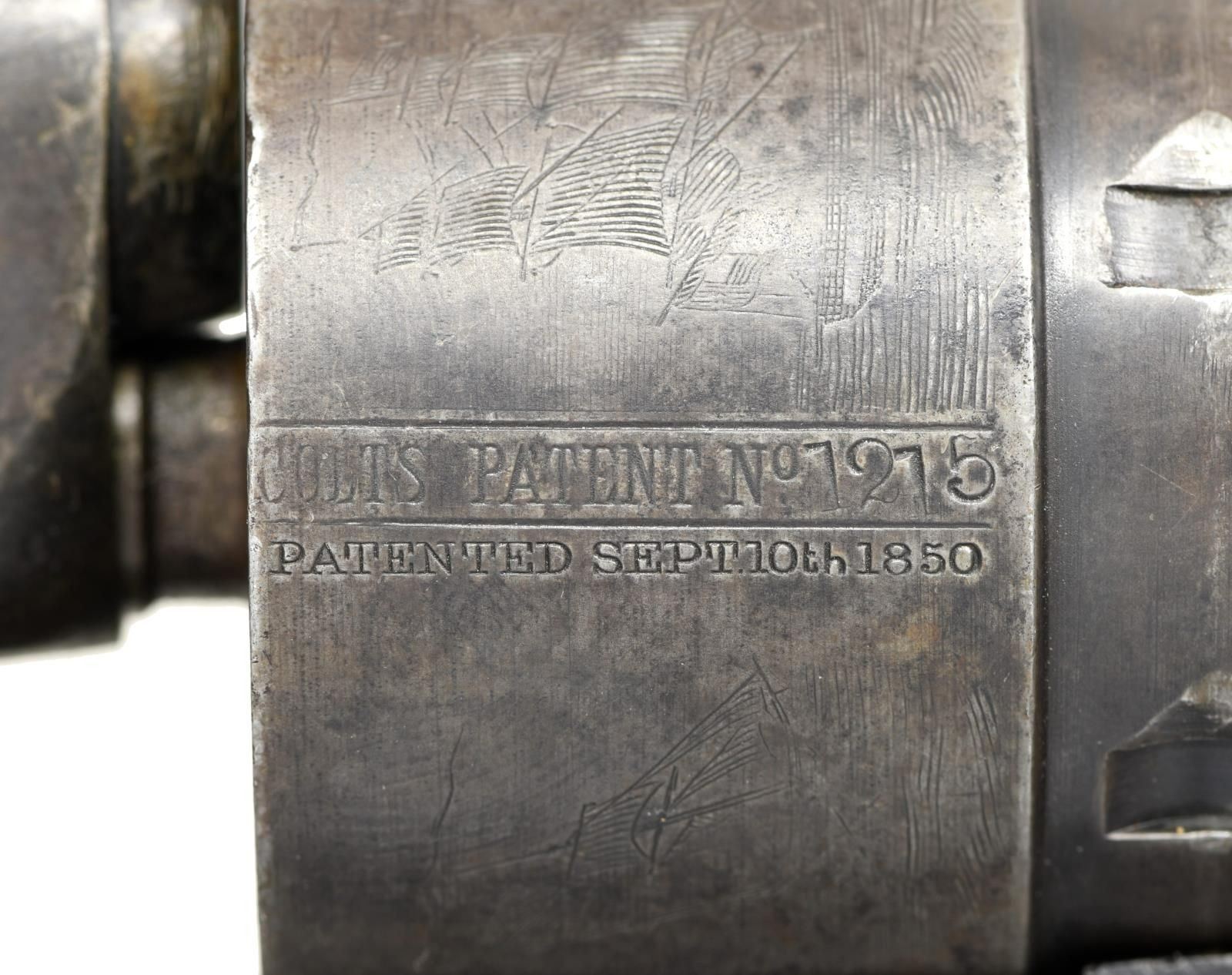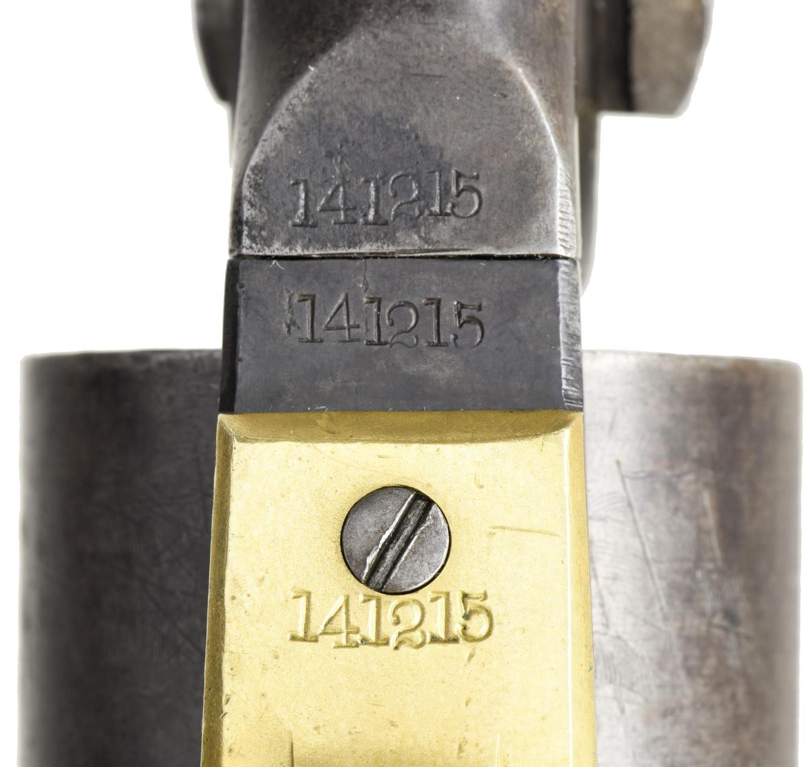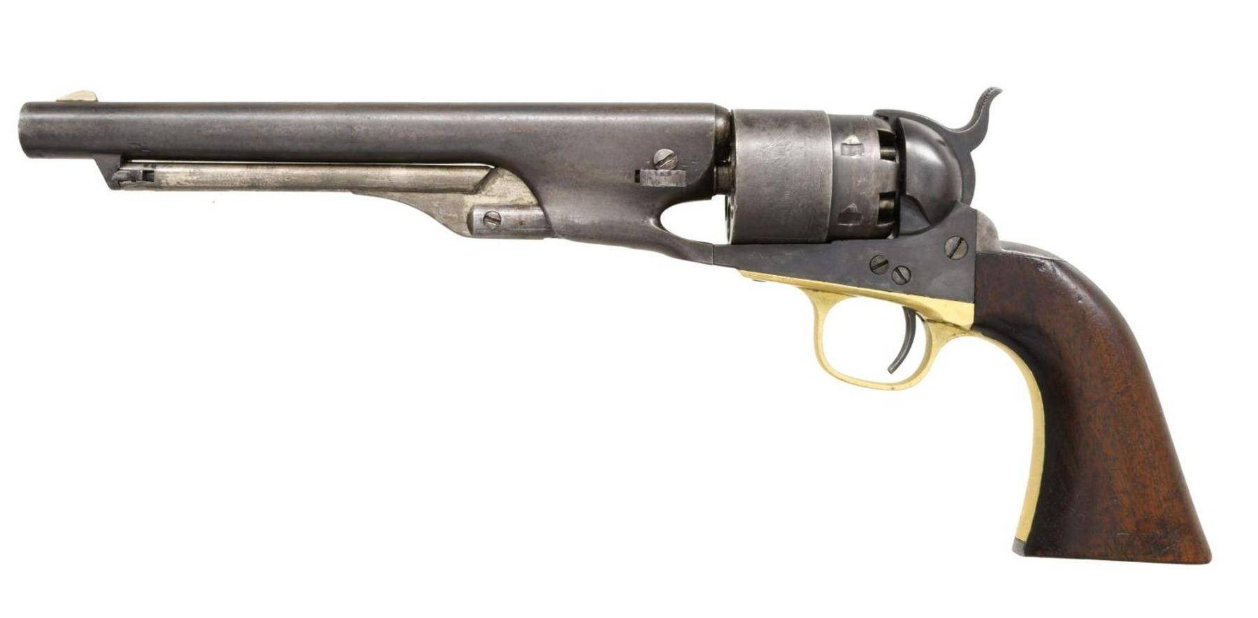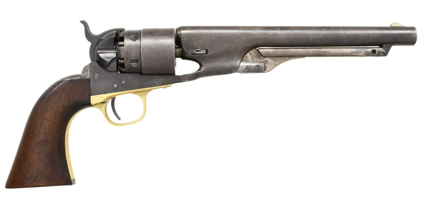 Cal. 44. S# 141215. Bbl. 8". Round barrel marked on the top "-ADDRESS COL. SAML COLT NEW-YORK U.S. AMERICA-". 6-Shot cylinder with a reasonably crisp naval cylinder scene. Cylinder is marked "COLT'S PATENT NO. 1215 PATENTED SEPT. 10th 1850". Walnut grips with visible inspector's cartouche on each side. All serial numbers match, including the wedge. CONDITION: barrel has substantial lightly faded blued finish, as does the cylinder. There is also ample finish remaining on the case-hardened frame & hammer. Brass has been cleaned but is beginning to acquire a mellow patina. Action is quite tight and works well. Excellent bore. (01-23278/BF). $1,600-2,200.