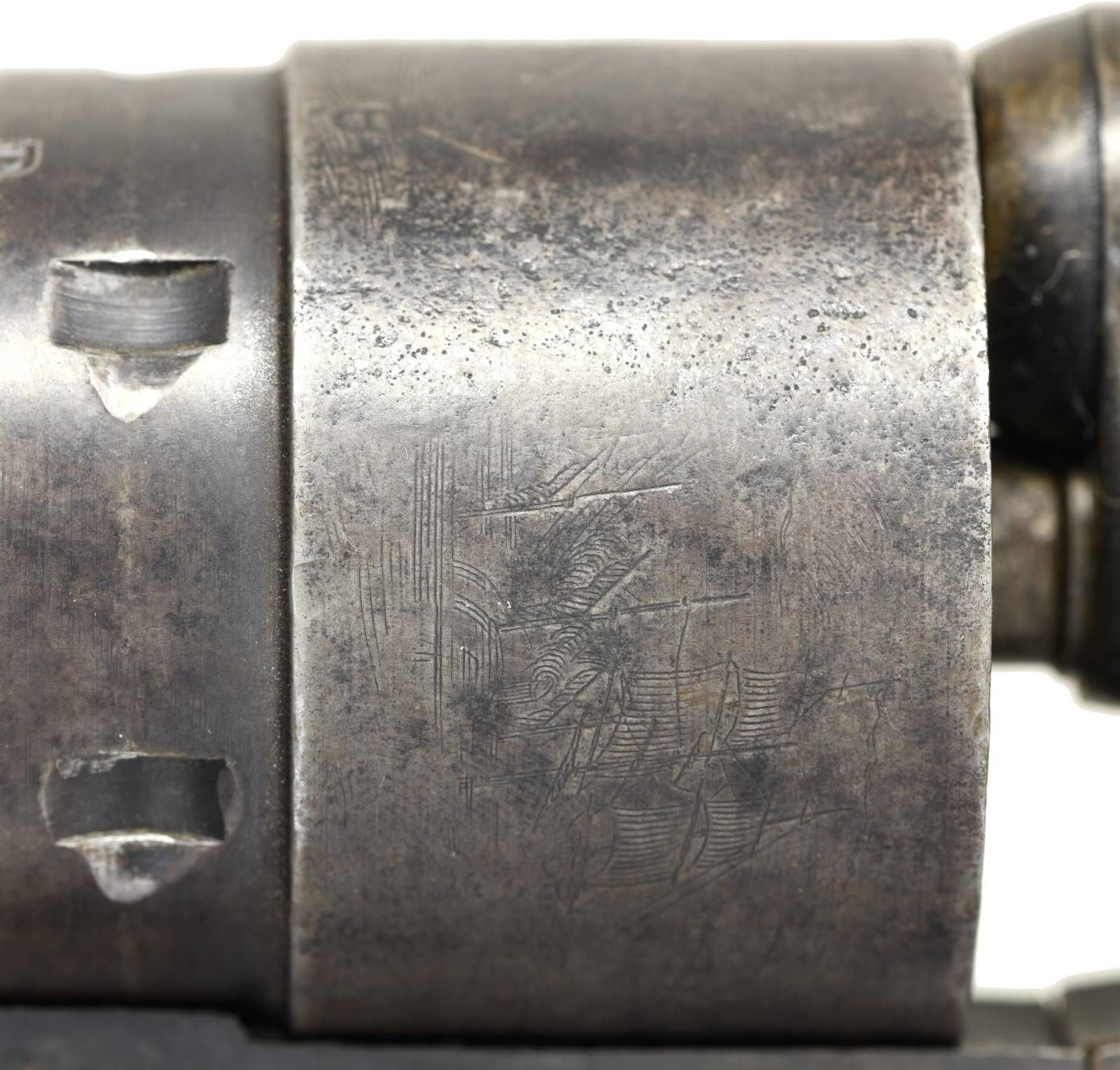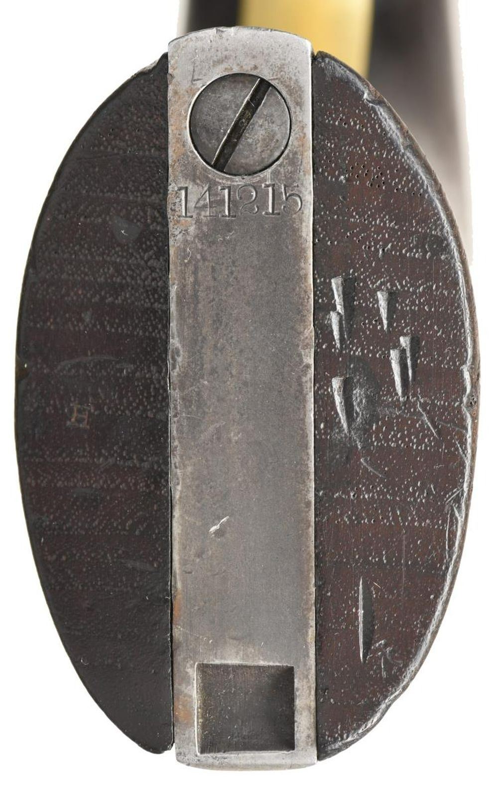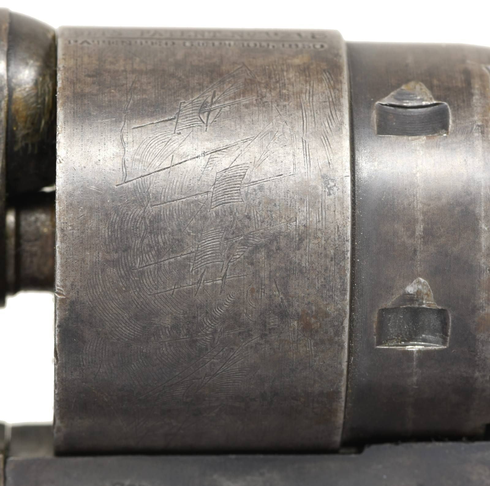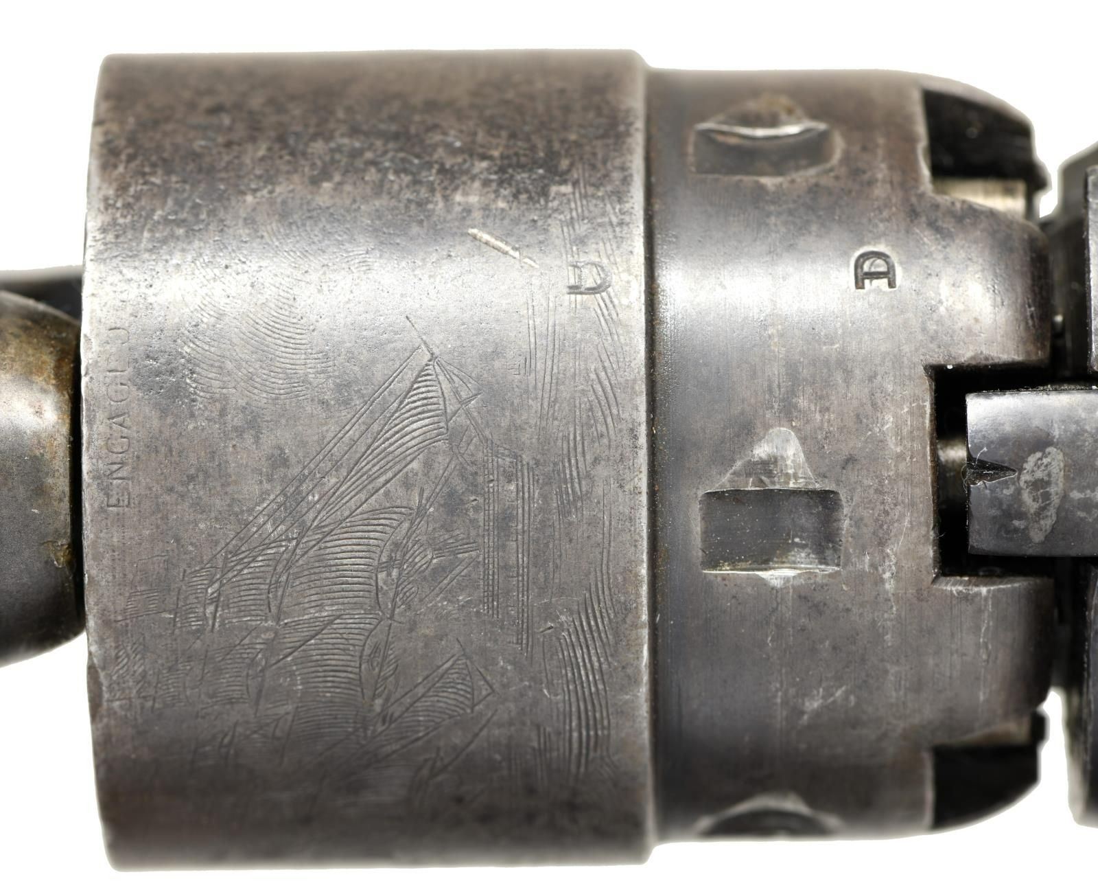 Cal. 44. S# 141215. Bbl. 8". Round barrel marked on the top "-ADDRESS COL. SAML COLT NEW-YORK U.S. AMERICA-". 6-Shot cylinder with a reasonably crisp naval cylinder scene. Cylinder is marked "COLT'S PATENT NO. 1215 PATENTED SEPT. 10th 1850". Walnut grips with visible inspector's cartouche on each side. All serial numbers match, including the wedge. CONDITION: barrel has substantial lightly faded blued finish, as does the cylinder. There is also ample finish remaining on the case-hardened frame & hammer. Brass has been cleaned but is beginning to acquire a mellow patina. Action is quite tight and works well. Excellent bore. (01-23278/BF). $1,600-2,200.