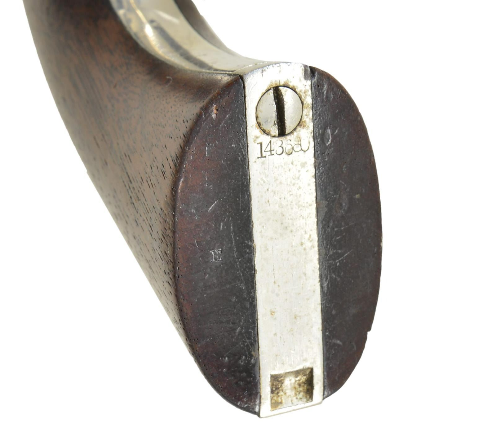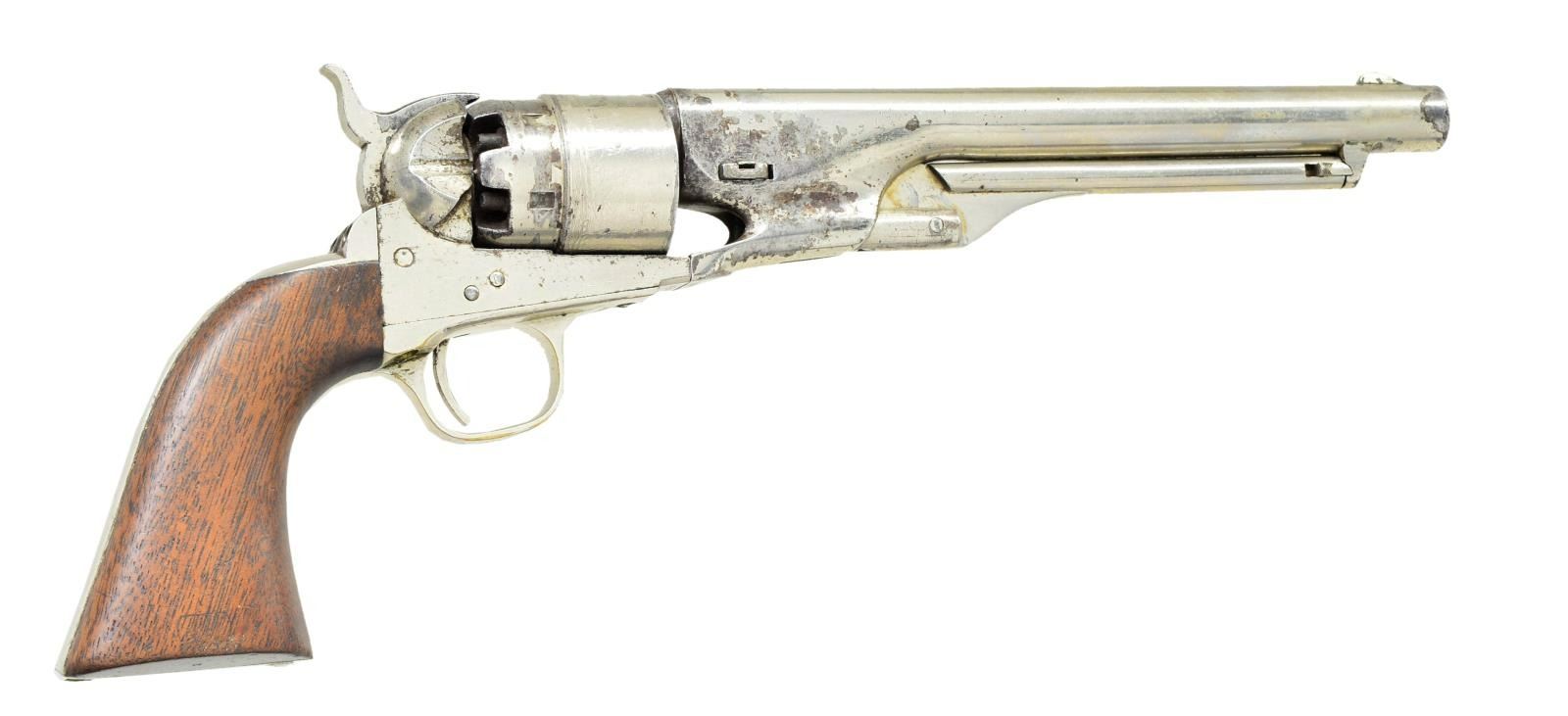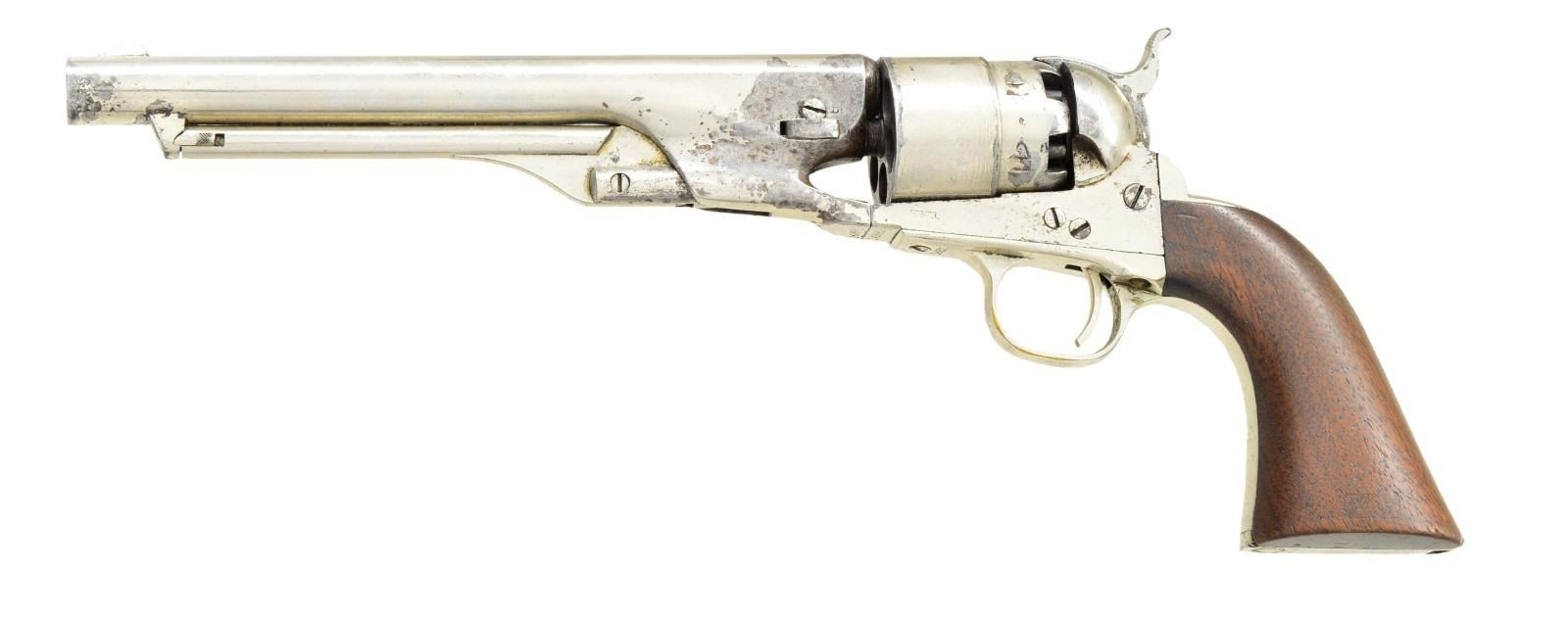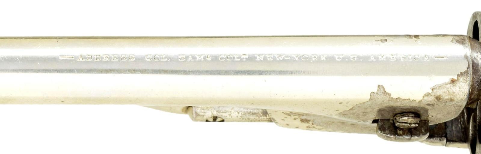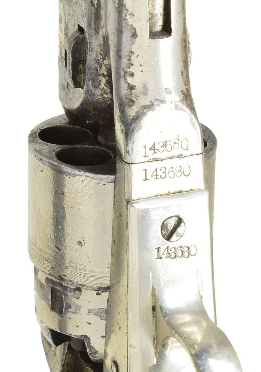Cal. 44. S# 143680. Bbl. 8" round w/ New York address & blade sight. Round rebated six shot cyl. w/ naval engagement scene roll engraving. Action has provisions for shoulder stock attachment. Added custom full nickel finish. Bbl., frame, cyl., grip straps & wedge have matching numbers. Left side of bbl. has "D" inspection mark. 1 piece walnut grip has partially visible cartouches on both panels. Mfg. 1863 during the American Civil War. UNATTACHED ACCESSORIES: period style trade casing w/ round brass medallion in lid. Interior of lid has directions for loading & cleaning. Blue cloth fitted interior showing moderate wear. Case contains nickel finished American eagle army size flask, 2 cavity iron mold, Eley cap tin, case key, round balls & bullets. CONDITION: metal retains 70% renickeled finish showing areas of peeling w/ small dents & marks. Sanded & refinished grips show light wear & marks. Cyl. scene is weakened w/ renickeled finish. Functioning action has weak spring tension. Dark lightly pitted bore retains intact rifling. (01-22828/DS). ANTIQUE. $2,500-3,500.